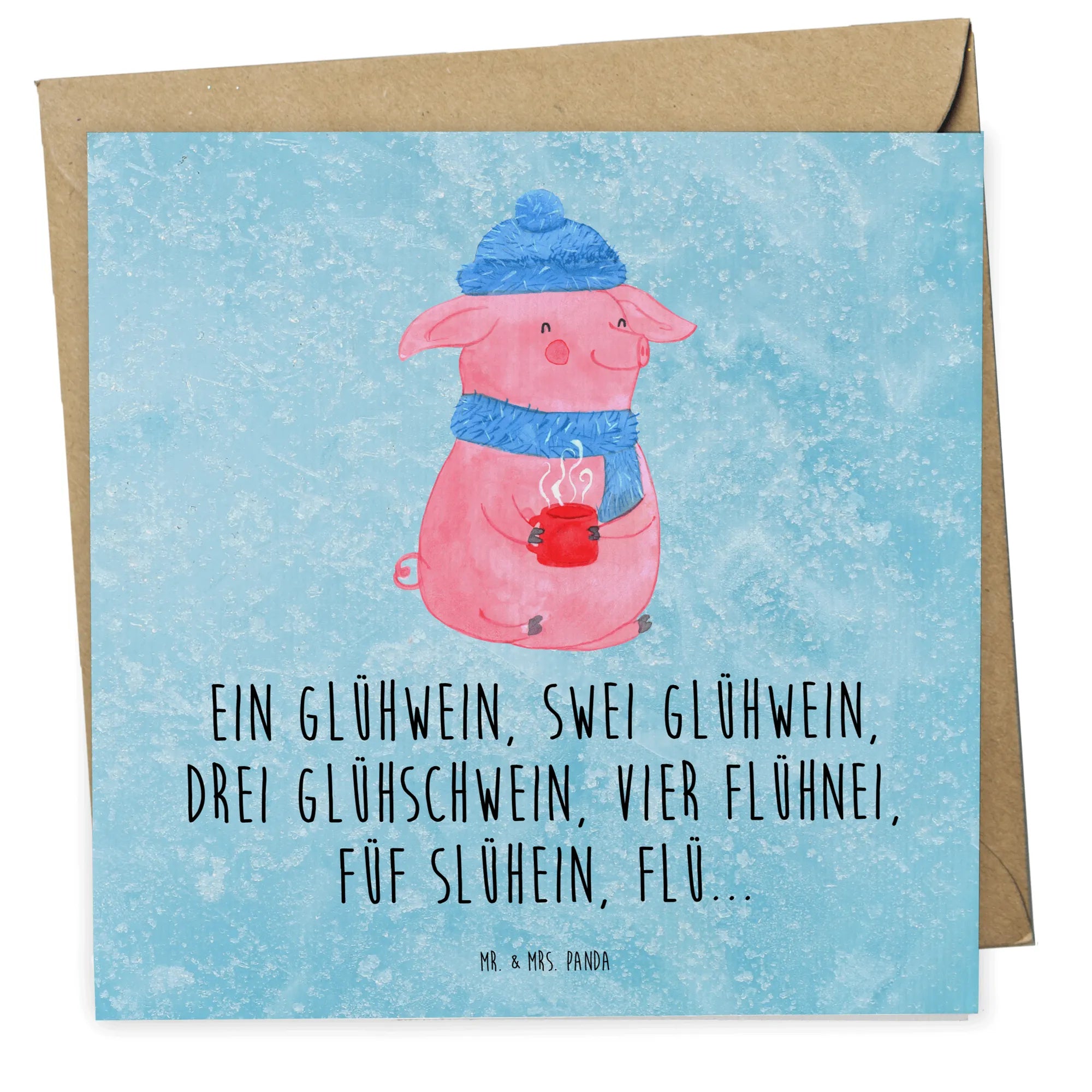 Mit den Maßen von 140 mm x 140 mm ist sie ideal, um persönliche Botschaften zu überbringen. Das Motiv zeigt ein charmantes, anthropomorphes Schwein, das fröhlich lächelt und winterlich gekleidet mit blauer Mütze und Schal in der kalten Jahreszeit eine heiße Tasse Glühwein hält. Der Spruch "Ein Glühwein, Swei Glühwein, drei Glühschwein..." sorgt für gute Laune und lädt dazu ein, die besinnliche Zeit des Jahres zu zelebrieren.