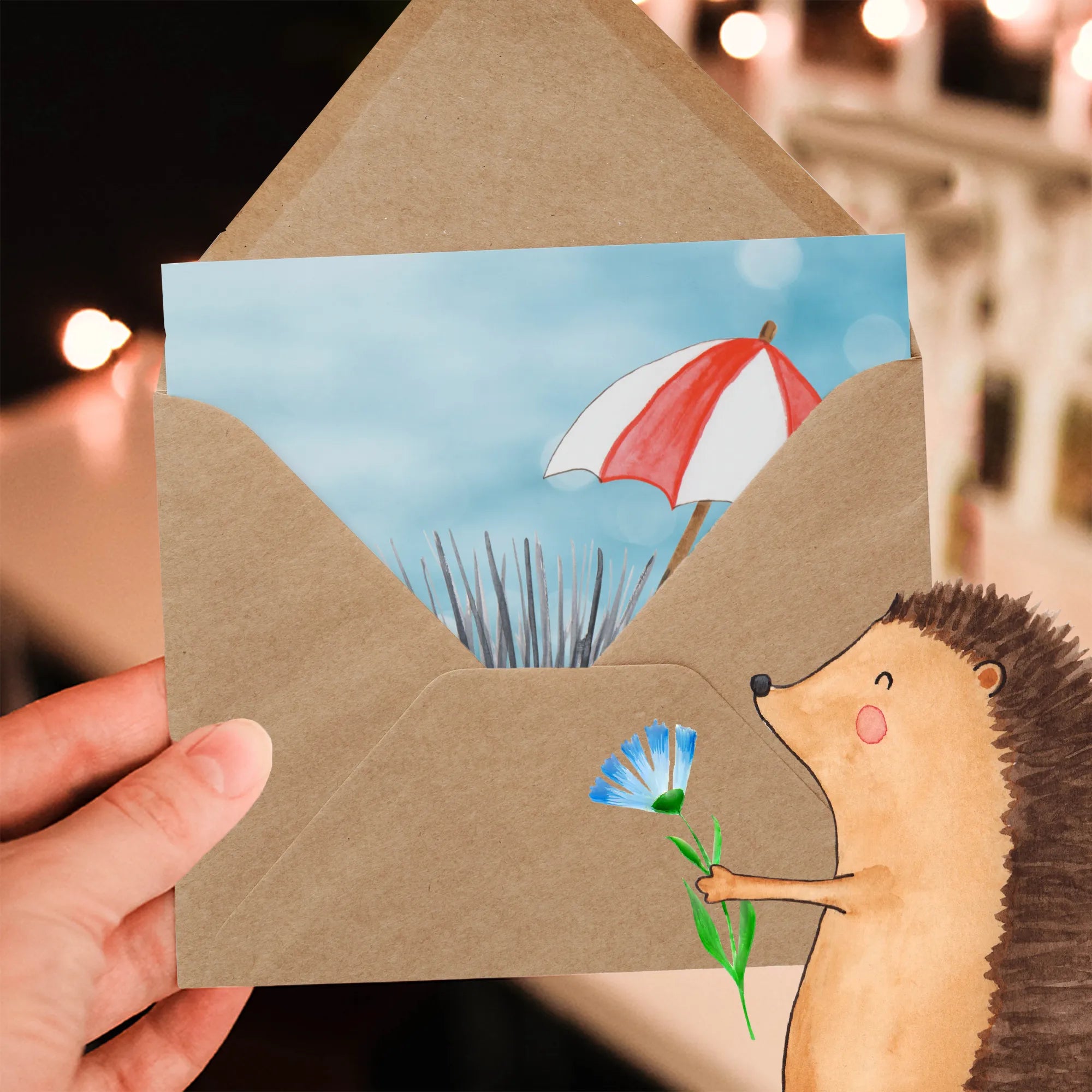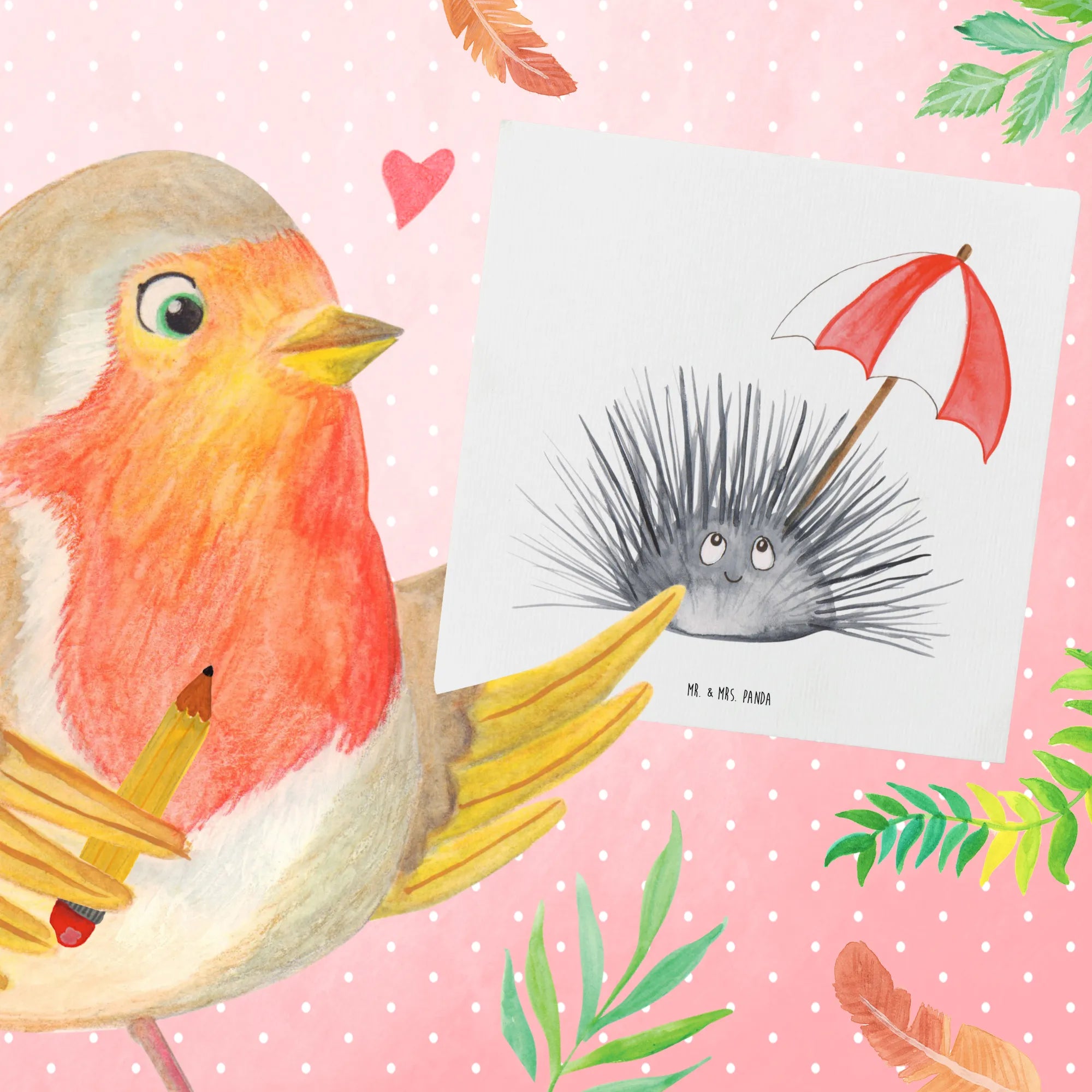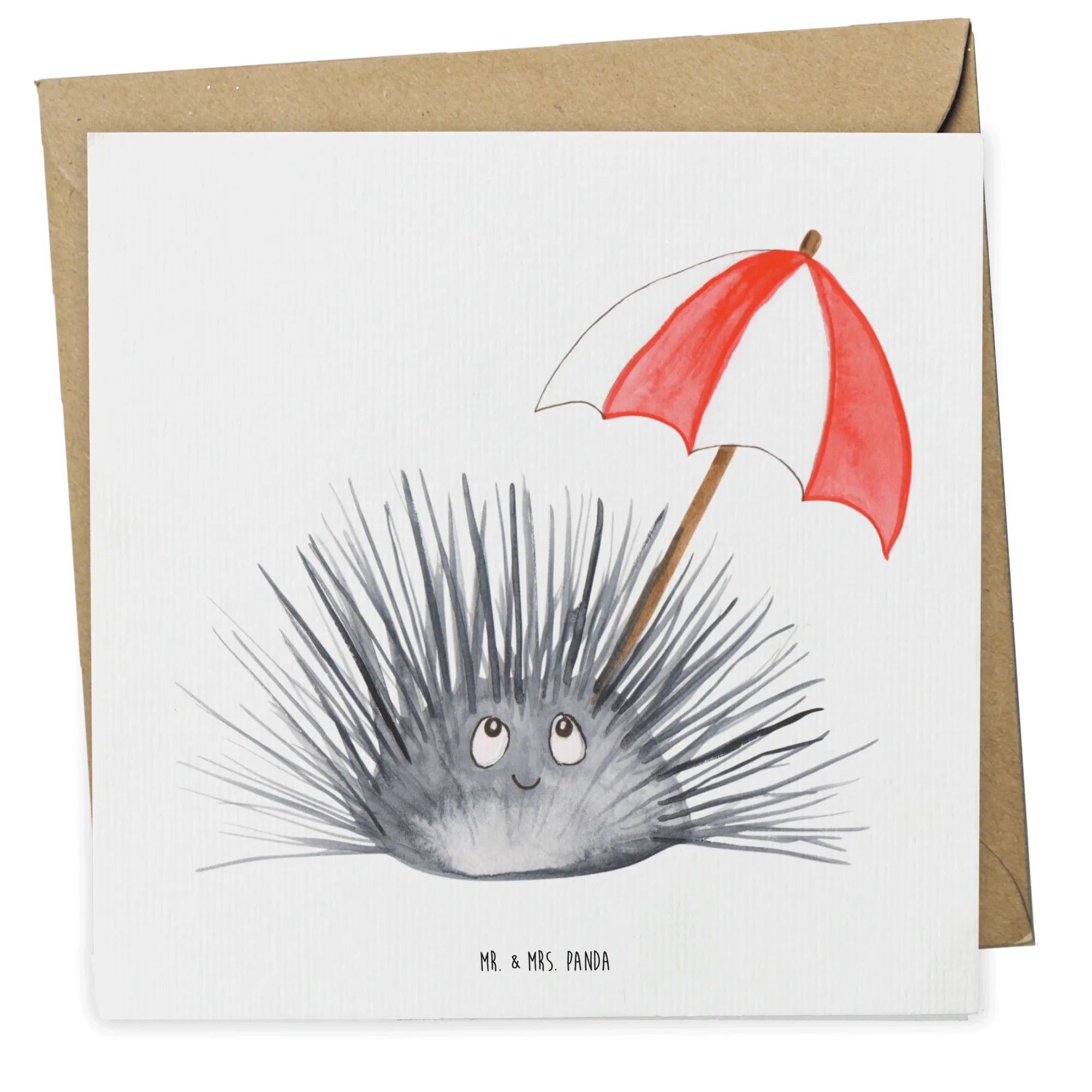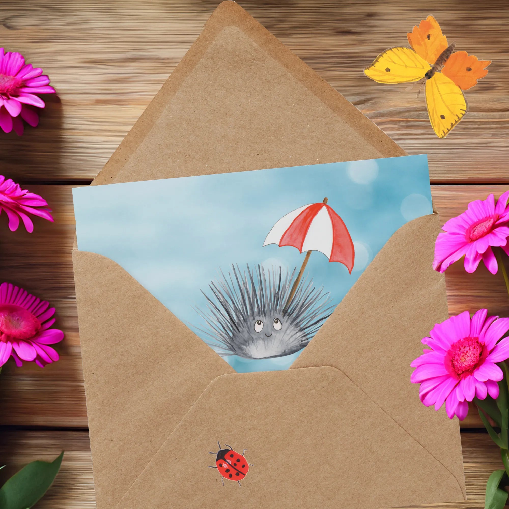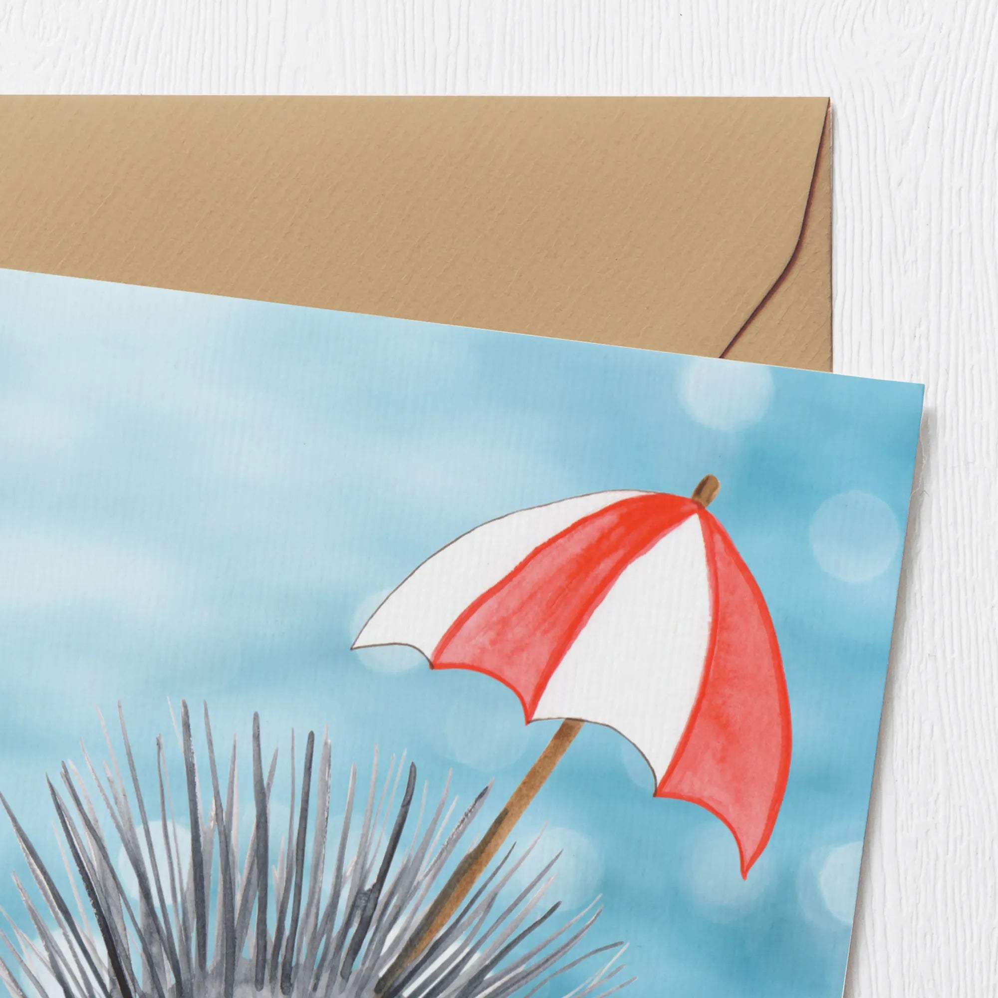 Egal ob Geburtstag, Hochzeit, Jubiläum oder einfach nur so - diese Karte passt zu jedem feierlichen Anlass. Auf der Vorderseite strahlt ein niedlicher Seeigel mit großen Augen und einem sanften Lächeln. In seinen kleinen "Händen" hält er einen rot-weiß gestreiften Schirm, der dich sofort an sonnige Urlaubstage am Meer erinnert.
