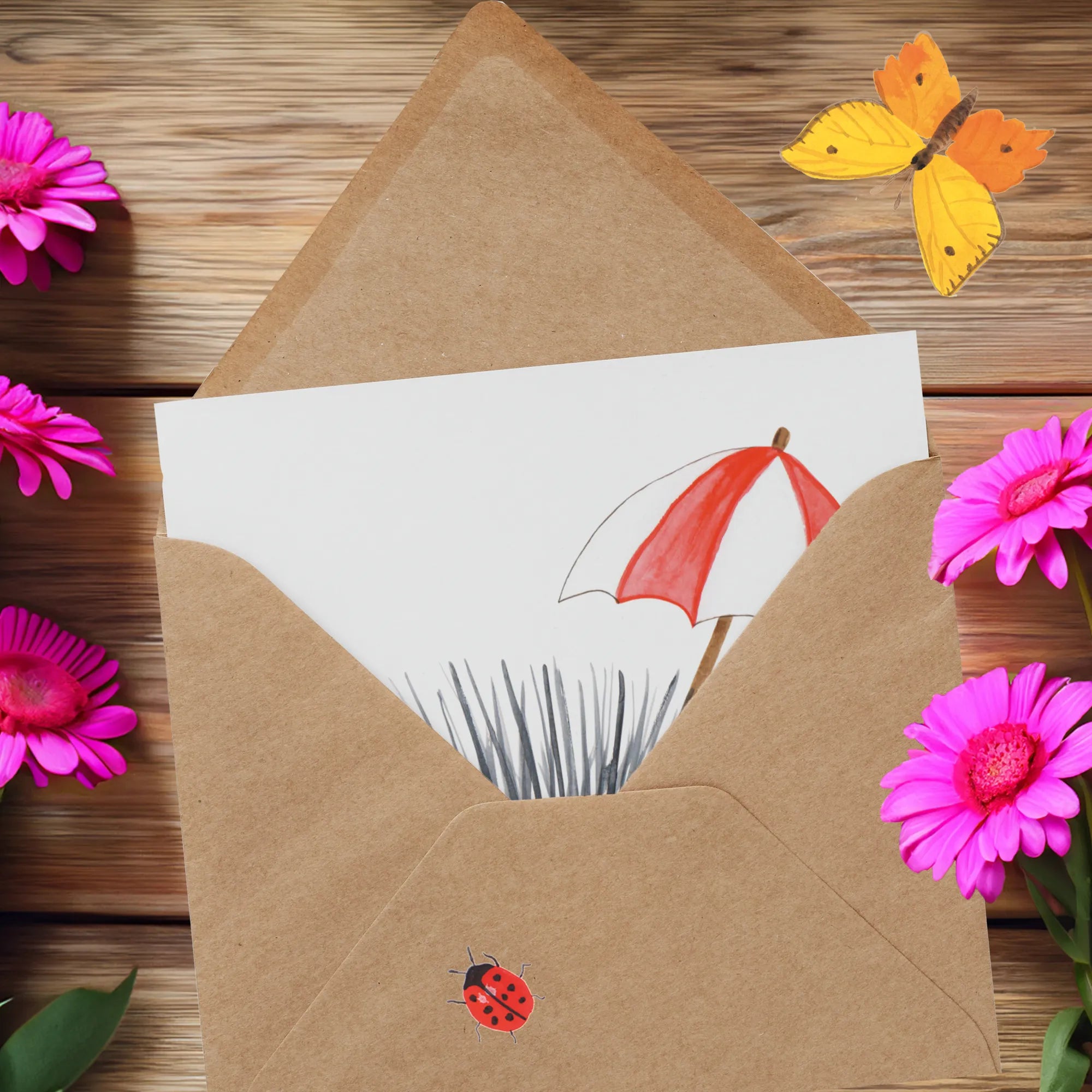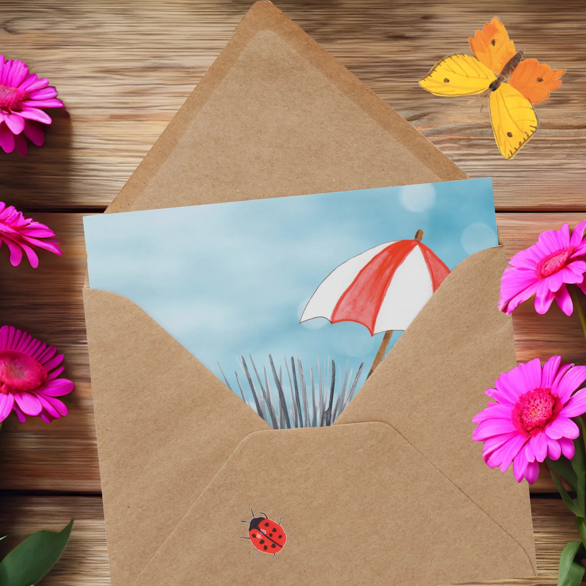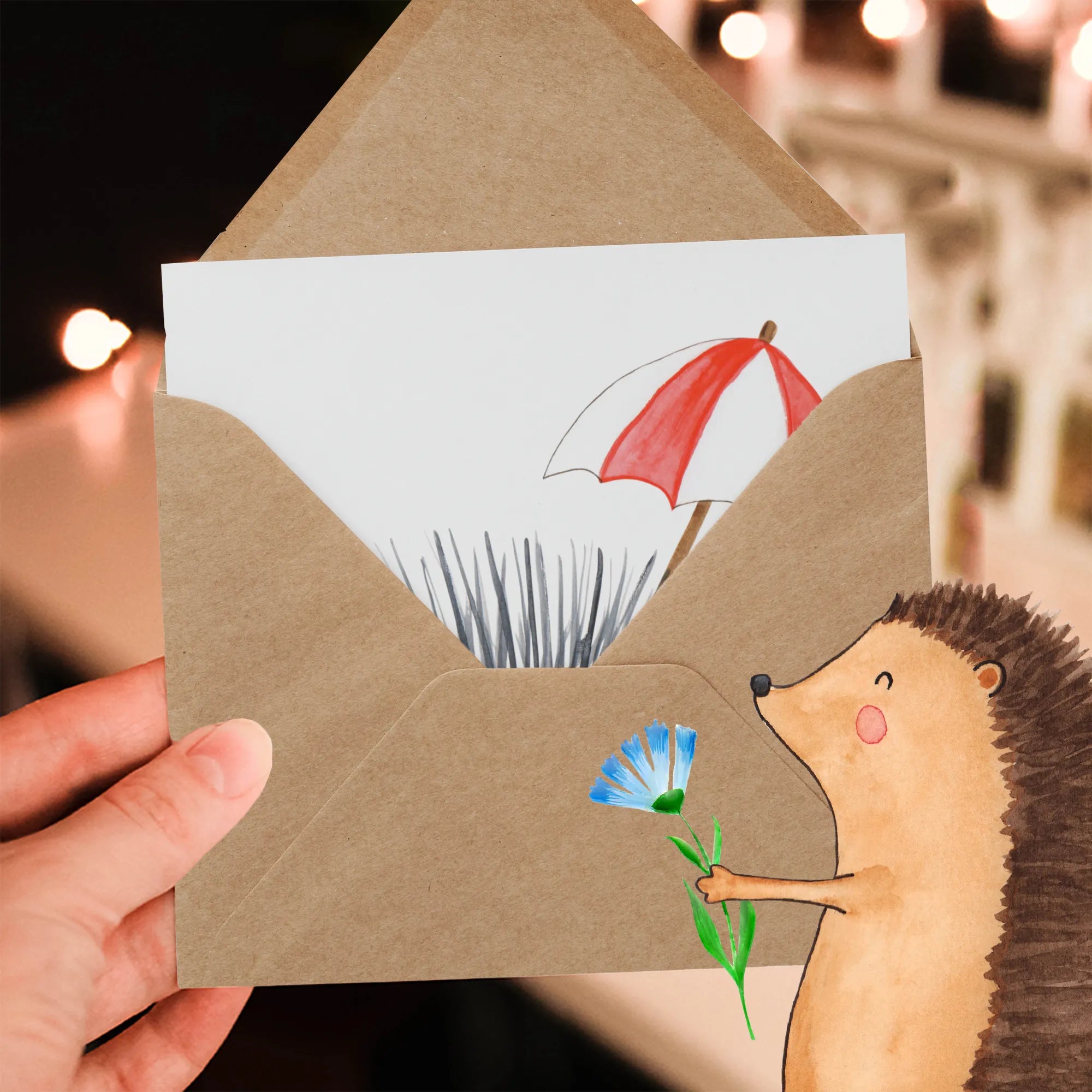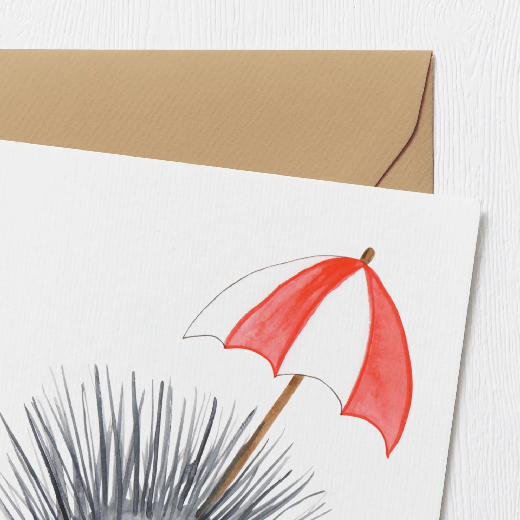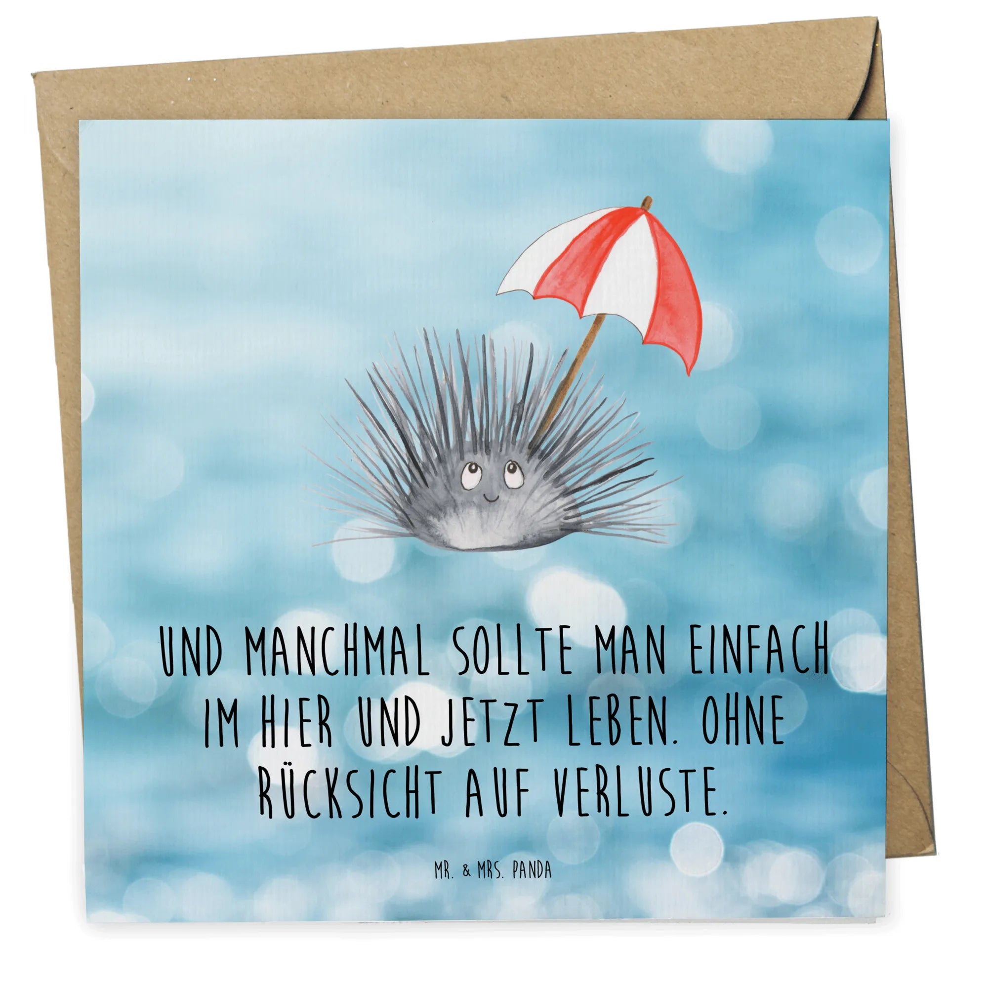 Egal ob Geburtstag, Hochzeit, Jubiläum oder einfach nur so - diese Karte passt zu jedem feierlichen Anlass. Auf der Vorderseite strahlt ein niedlicher Seeigel mit großen Augen und einem sanften Lächeln. In seinen kleinen "Händen" hält er einen rot-weiß gestreiften Schirm, der dich sofort an sonnige Urlaubstage am Meer erinnert.