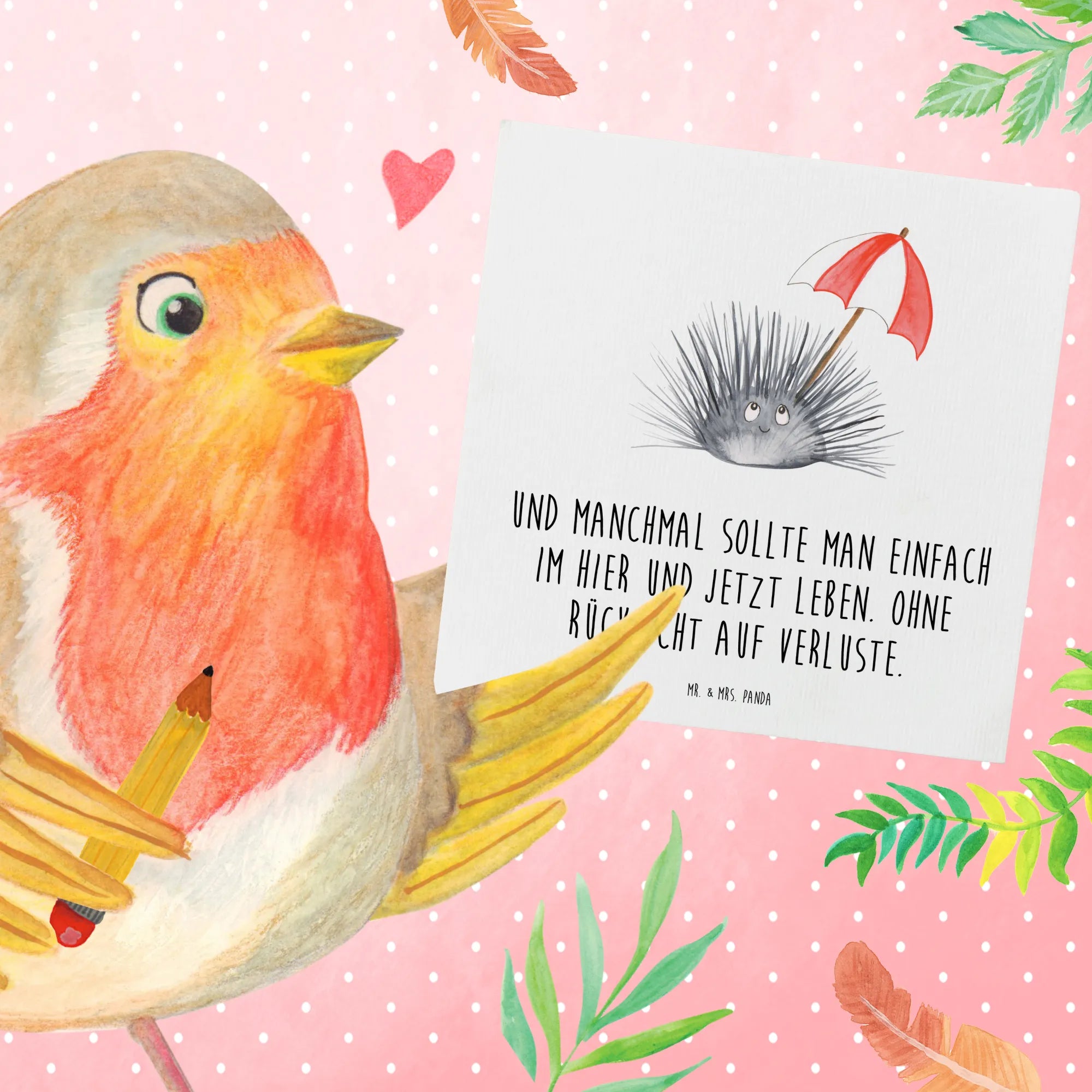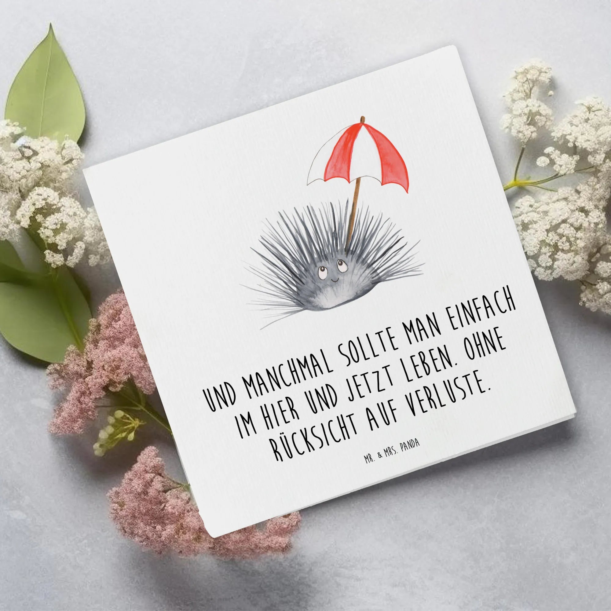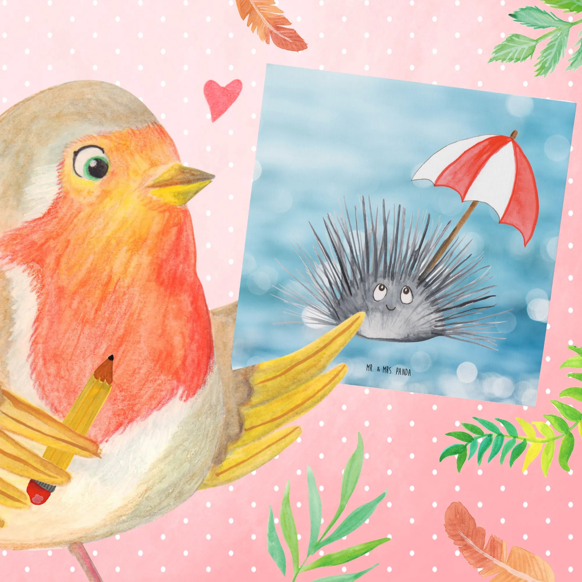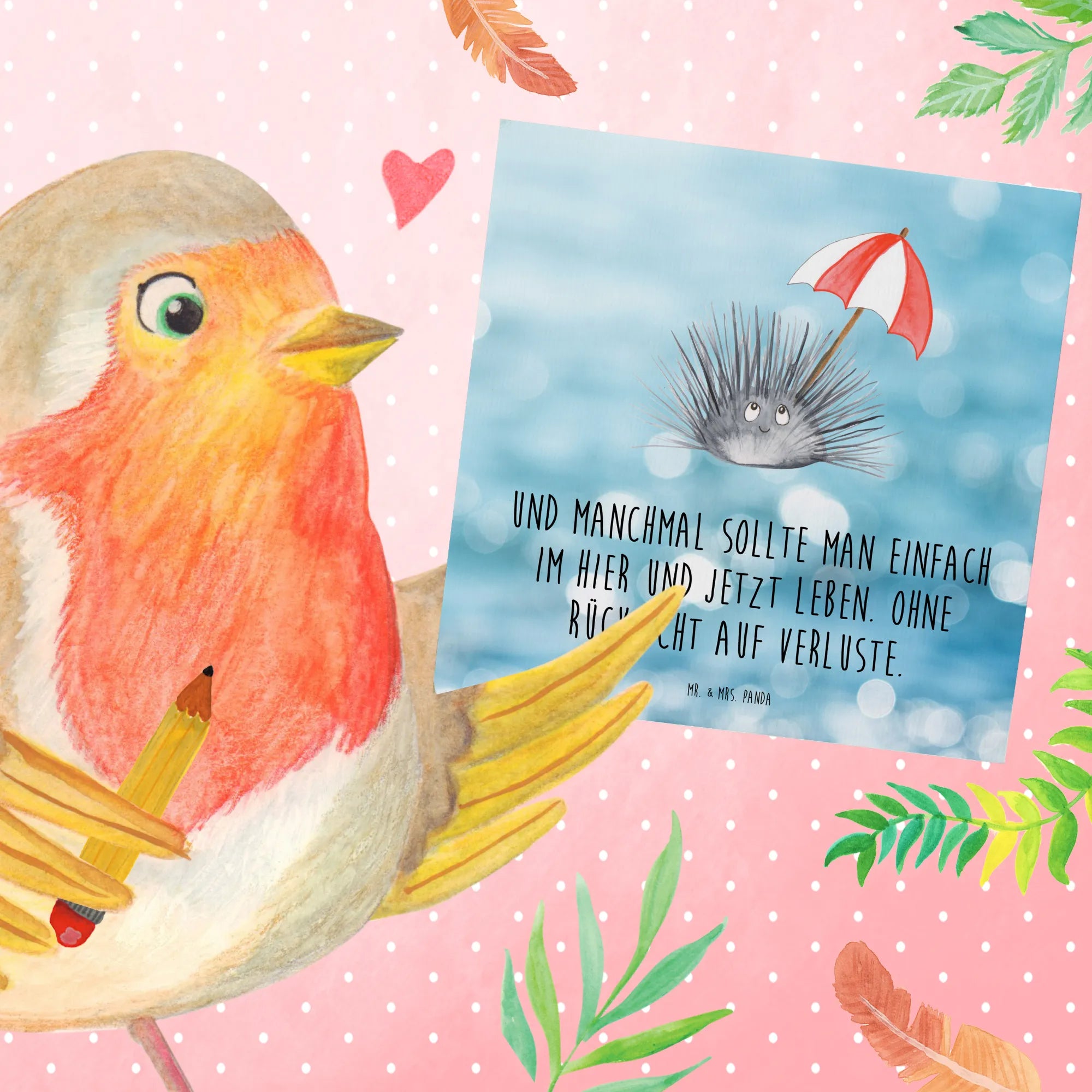 Die Deluxe Karte mit dem niedlichen Motiv des Seeigels aus der Meerestiere Kollektion von Mr. & Mrs. Panda ist das perfekte Geschenk für alle, die das Meer und seine Bewohner lieben. Diese wunderschöne und besonders hochwertige quadratische Karte ist nicht nur ein echter Hingucker, sondern auch eine liebevolle Botschaft, die direkt aus dem Meer zu dir kommt. Mit den Maßen von 140 mm x 140 mm bietet die Karte ausreichend Platz für deine individuellen Grüße oder Glückwünsche. Der kleine Seeigel auf der Vorderseite der Karte hat große, neugierige Augen und ein sanftes Lächeln, das sofort Freude verbreitet. Er hält einen rot-weiß gestreiften Schirm in seinen Stacheln und vermittelt damit ein Gefühl von Unbeschwertheit und Lebensfreude.