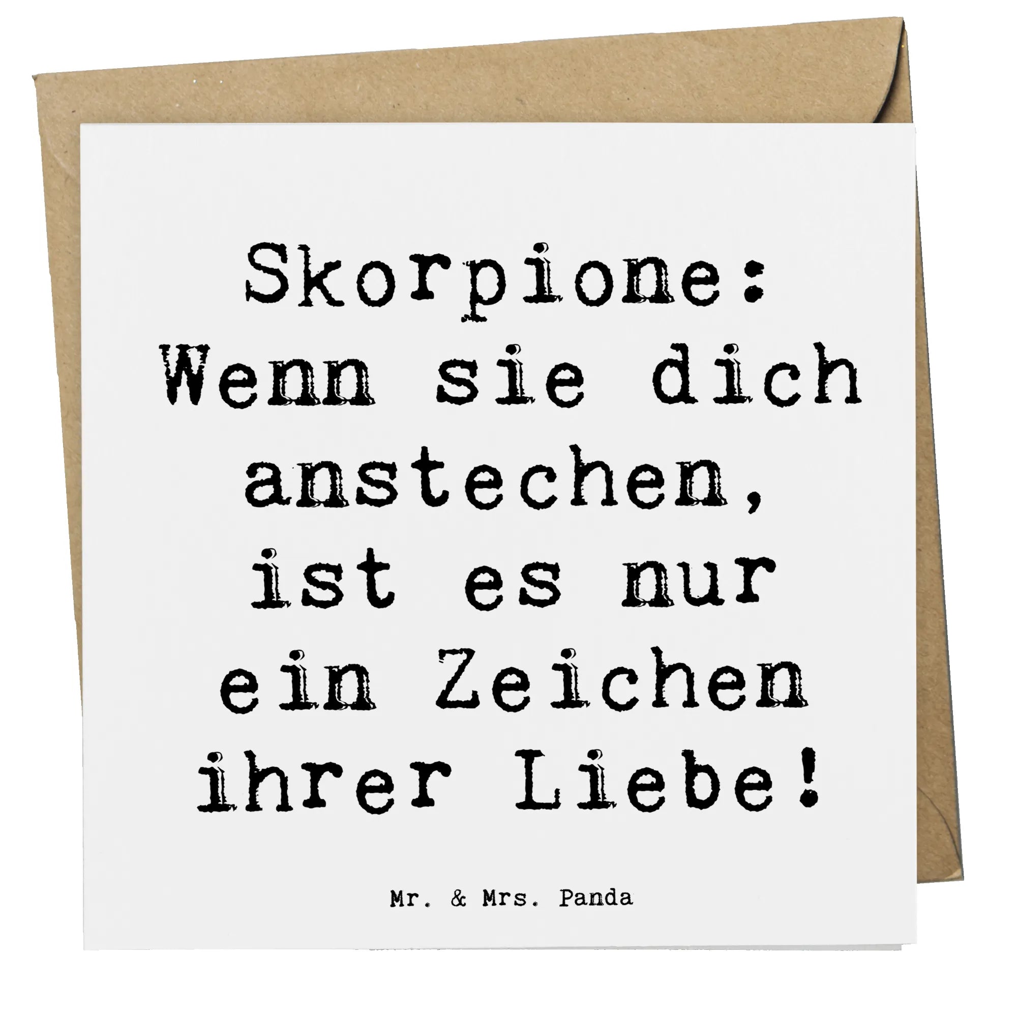 Die Vorderseite überzeugt mit einem liebevoll handgezeichneten Skorpion-Motiv, das direkt aus der kreativen Feder von Mrs. Panda stammt. Der charmante Spruch "Skorpione: Wenn sie dich anstechen, ist es nur ein Zeichen ihrer Liebe!" bringt ein Lächeln auf die Lippen und macht die Karte zu einem idealen Begleiter für diverse Anlässe.