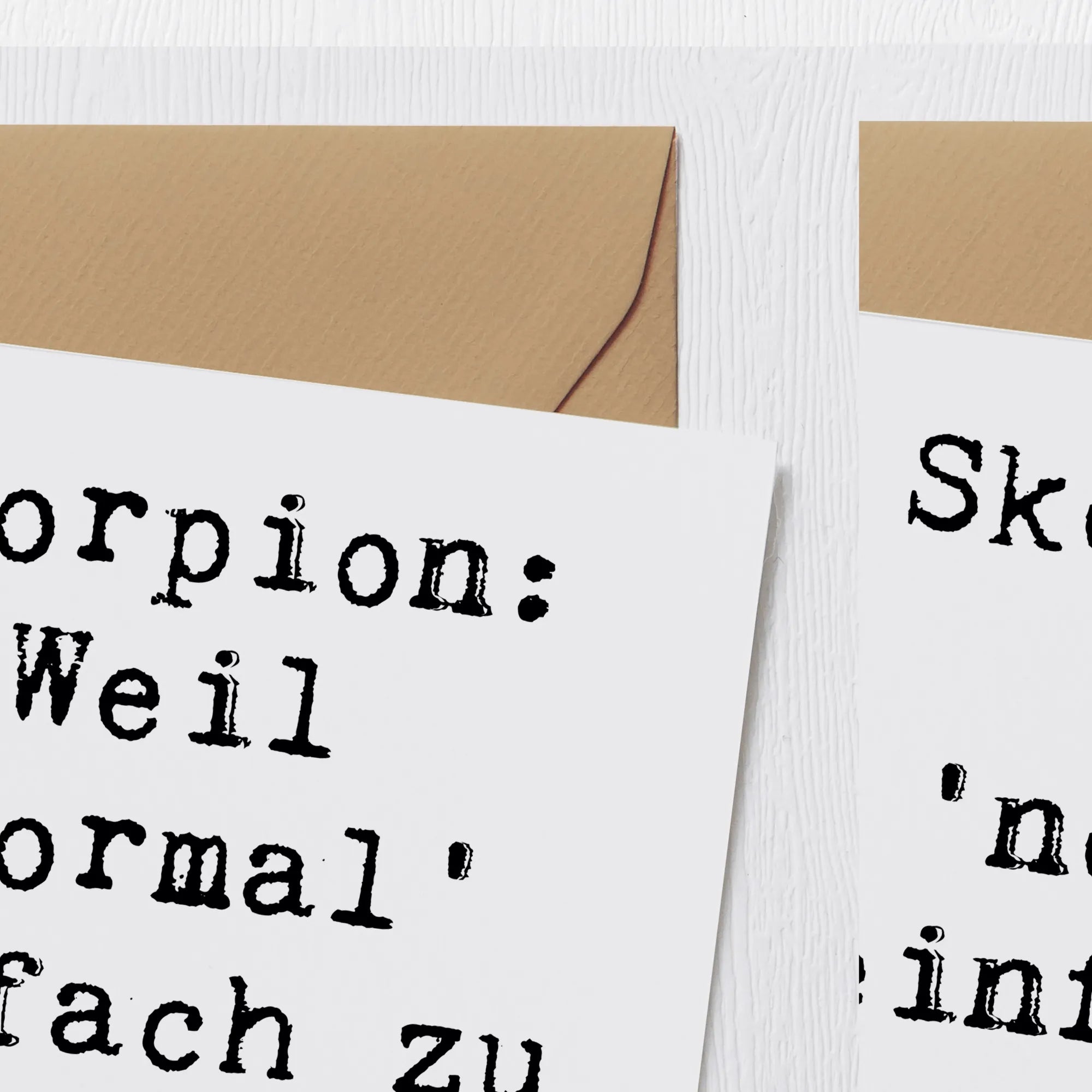 Diese edle Karte besticht durch eine hochwertige, matt glänzende Oberfläche und präsentiert auf der Vorderseite den witzigen Spruch: 'Skorpion: Weil 'normal' einfach zu langweilig ist!'. Ob zum Geburtstag, zur Hochzeit oder einfach nur, um einem lieben Menschen eine Freude zu bereiten – die Karte ist ideal, um individuelle Grüße und Glückwünsche zu überbringen.