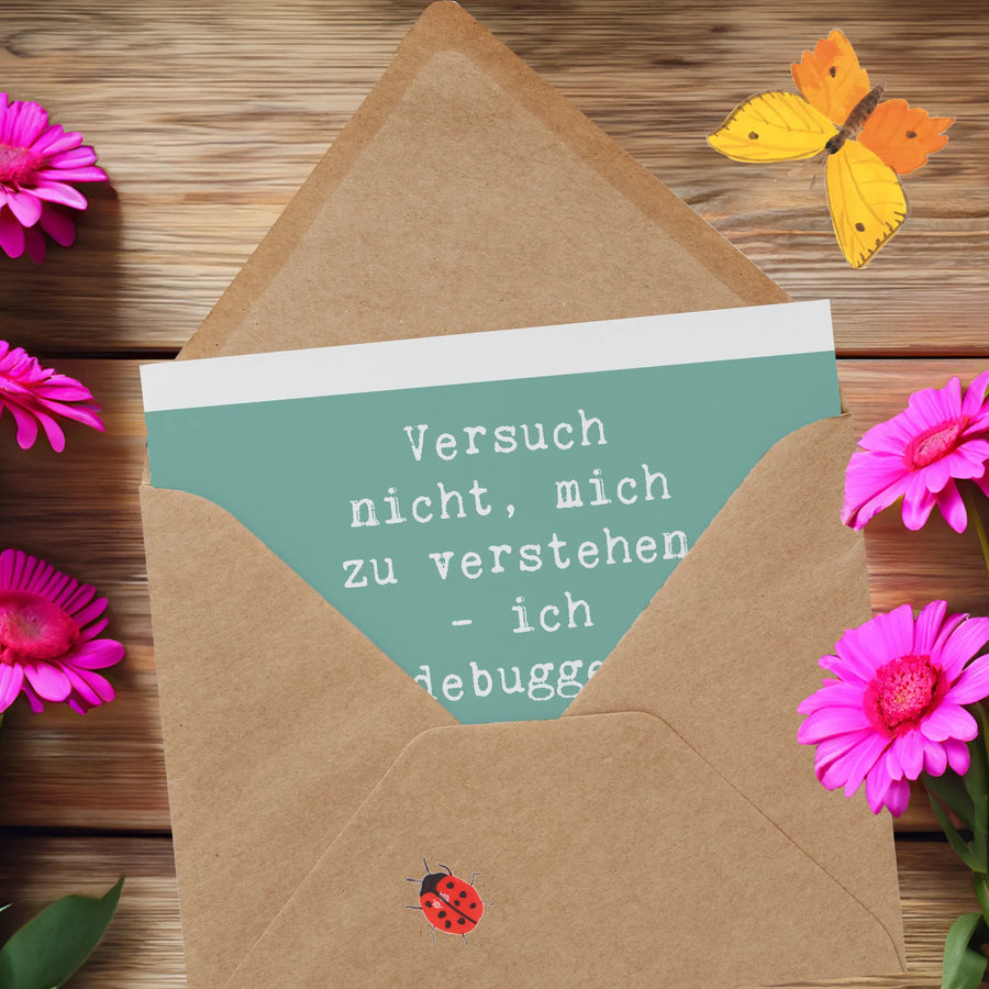 Die Karte misst 140 mm x 140 mm und besteht aus edlem 300 Gramm Karton, der sowohl stabil als auch ansprechend ist. Das besondere Motiv zeigt den witzigen Spruch 'Versuch nicht, mich zu verstehen - ich debugge!', der in der Welt der Programmierer und IT-Entwickler Anklang findet.