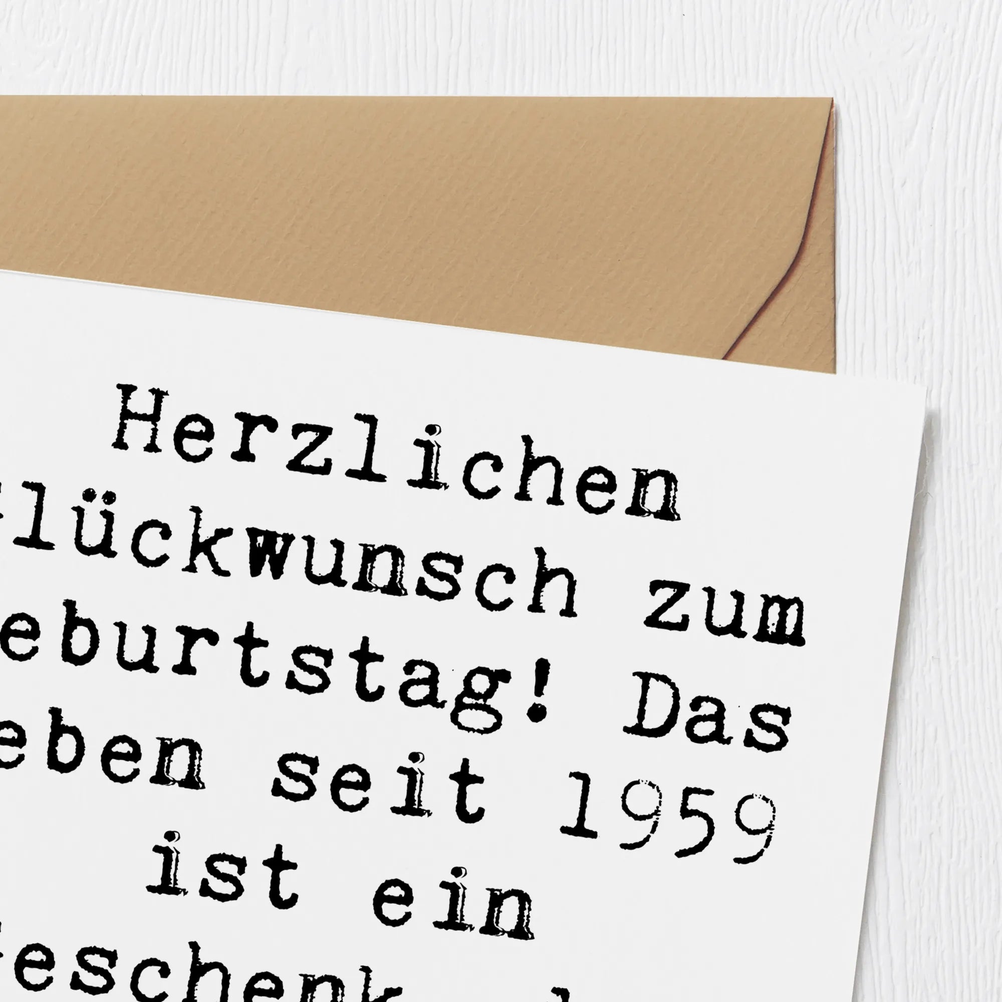 Die Karte ist aus 300 Gramm schwerem Karton gefertigt und bietet eine knackig-glänzende Vorderseite mit einem liebevoll gestalteten Spruch: "Herzlichen Glückwunsch zum Geburtstag! Das Leben seit 1959 ist ein Geschenk, das wir gemeinsam feiern!". Das edle Design, kombiniert mit einer matte Innenseite, lädt dazu ein, persönliche Grüße und herzerwärmende Botschaften zu hinterlassen.