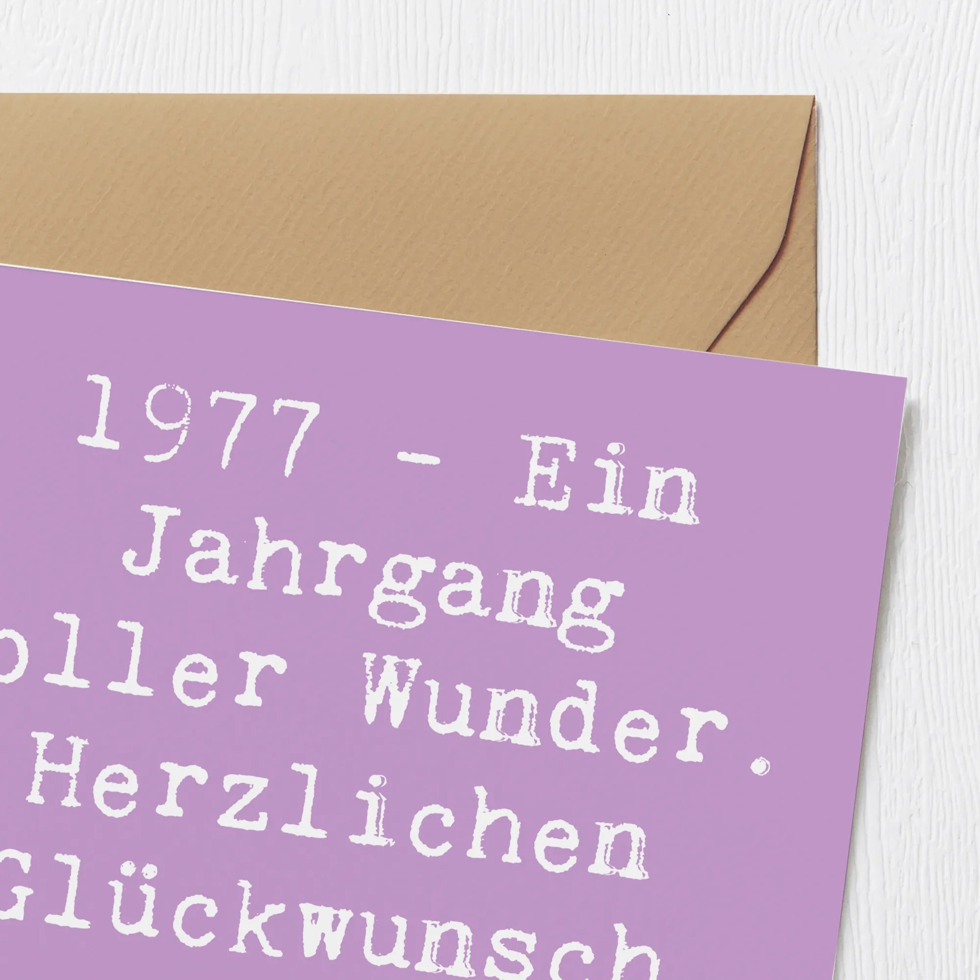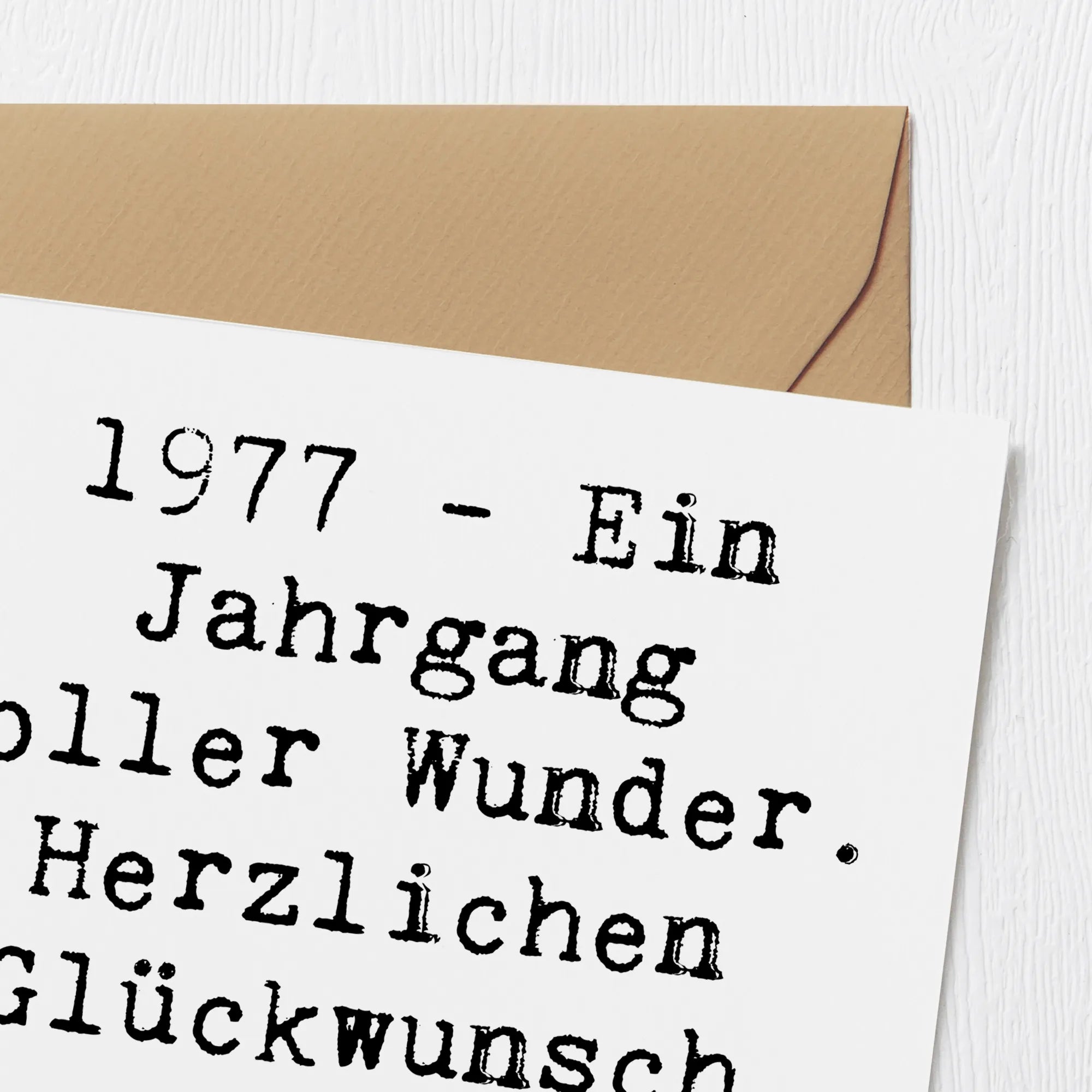 Die Vorderseite der Karte zeigt das wundervolle Motiv "1977 - Ein Jahrgang voller Wunder. Herzlichen Glückwunsch zum Geburtstag!" - ein liebevoller Spruch, der die Einzigartigkeit dieses Geburtsjahres zum Ausdruck bringt. Mit der Karte kannst Du nicht nur einen herzlichen Glückwunsch übermitteln, sondern auch ein Stück Erinnerung schenken, das für immer bleibt.