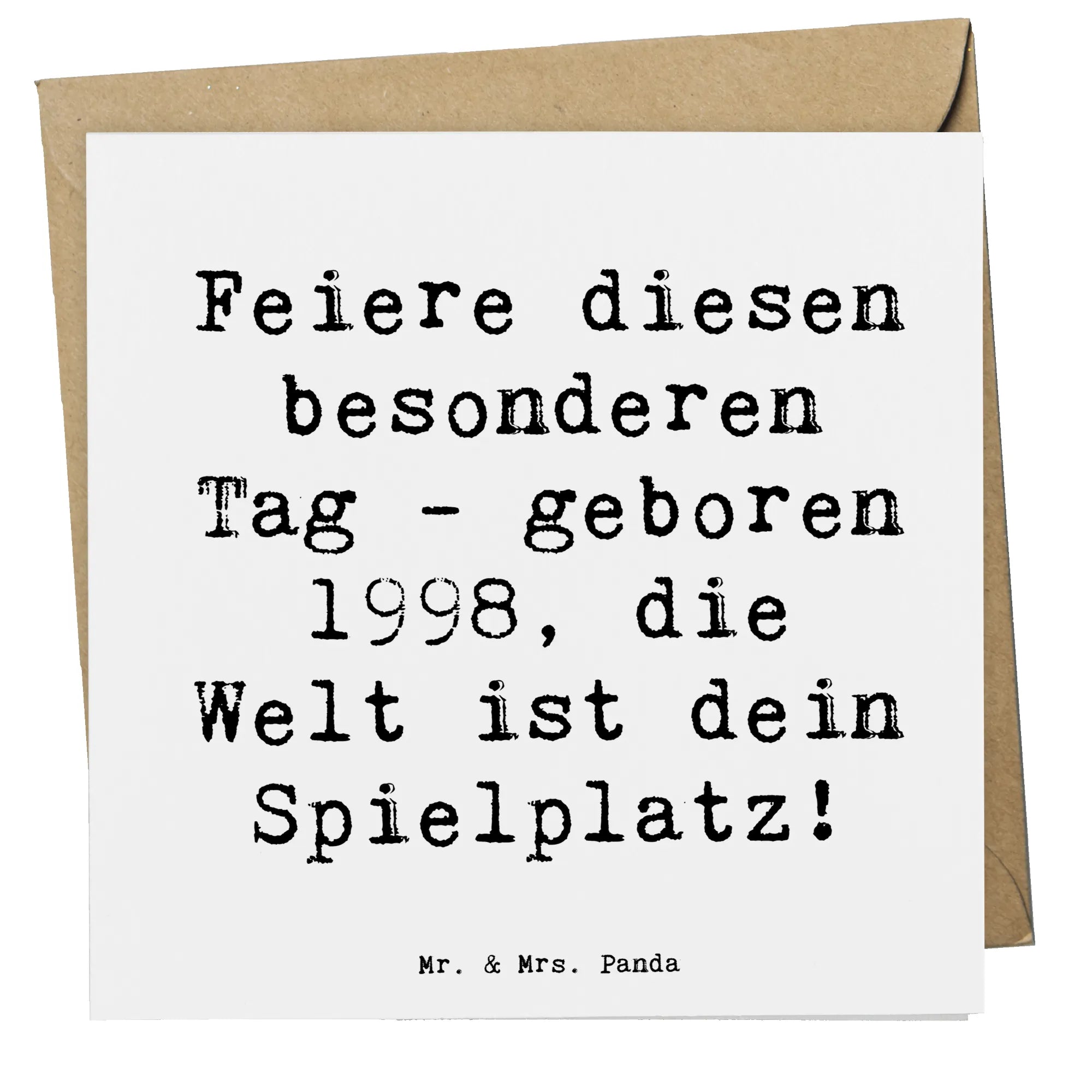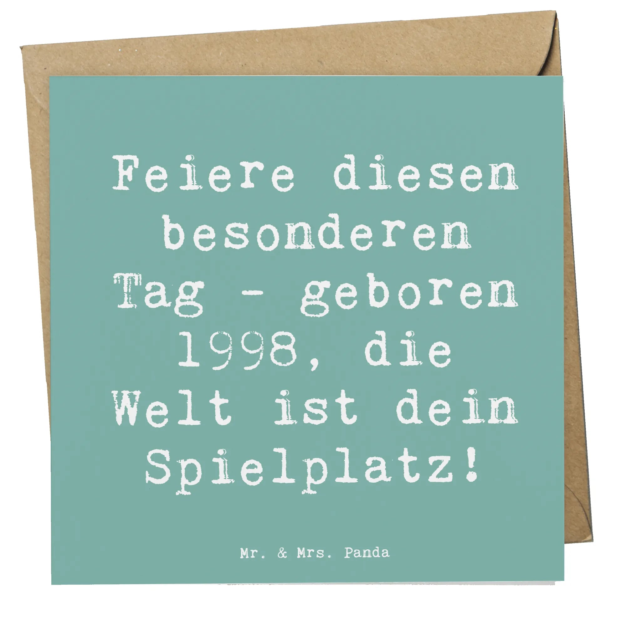 Die Vorderseite der Karte ziert der charmante Spruch: 'Feiere diesen besonderen Tag - geboren 1998, die Welt ist dein Spielplatz!', der sofort ein Lächeln ins Gesicht zaubert. Immerhin, 1998 ist ein ganz besonderes Jahr, und mit dieser Karte kannst du es gebührend feiern!