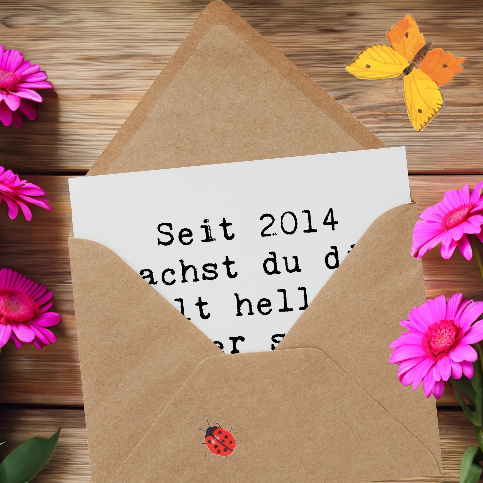 Jeder, der 2014 geboren wurde oder einen besonderen Menschen in diesem Jahr gefeiert hat, wird diese Karte lieben. Warum? Weil sie mit dem Slogan "Seit 2014 machst du die Welt heller. Feier schön und lass dich verwöhnen!" daherkommt – ein Spruch, der Herzen erwärmt und an die Freude des Lebens erinnert. Du kannst diese Karte für zahlreiche Anlässe nutzen, sei es für eine Geburtstagsfeier, eine Hochzeit oder einfach nur, um jemandem eine Freude zu machen.
