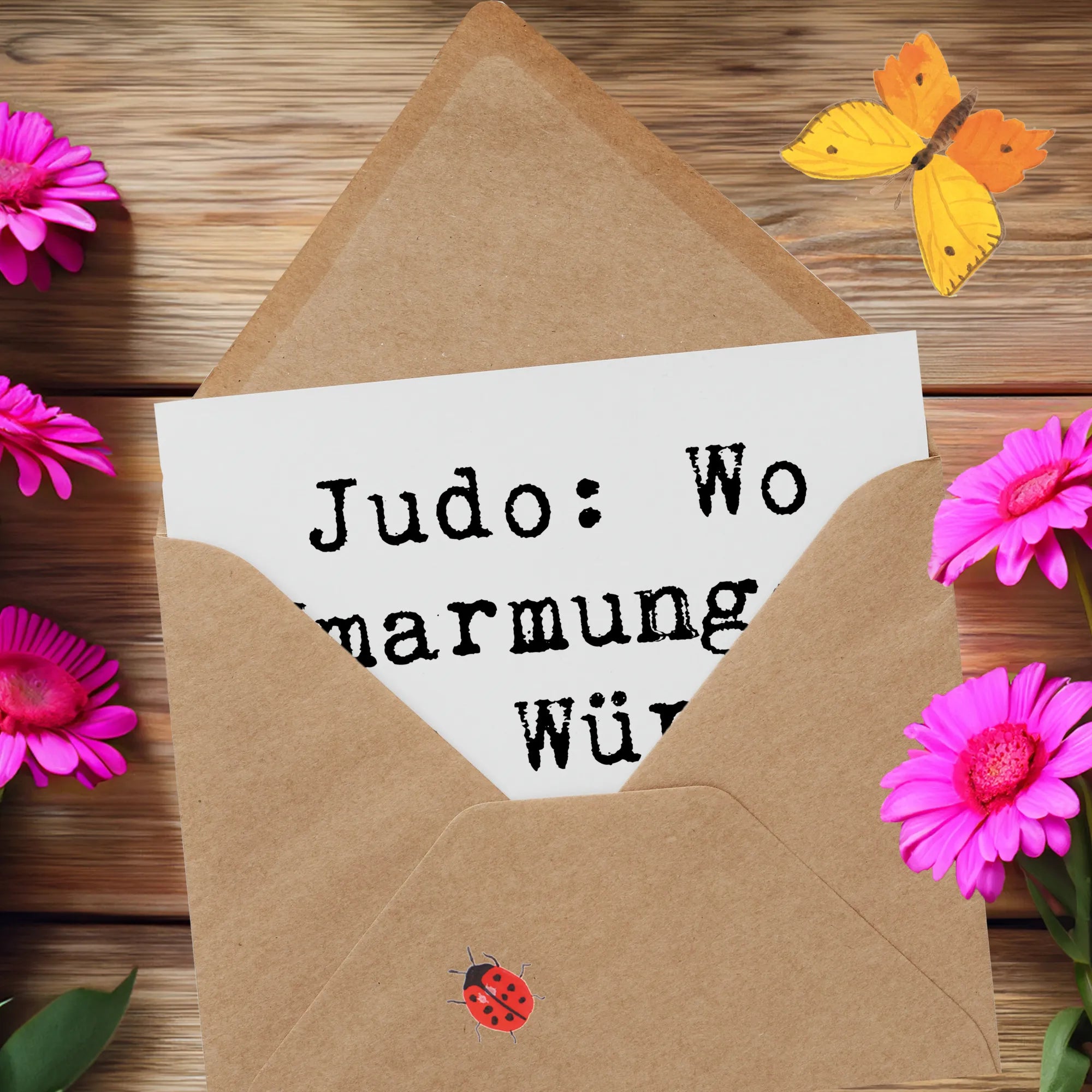 Auf der Vorderseite der Karte prangt der liebevolle Spruch "Judo: Wo Umarmungen in Würfe verwandelt werden." und bringt sofort ein Lächeln auf die Lippen. Mit einer Größe von 140 mm x 140 mm bietet sie genügend Platz für deine individuellen Grüße und Glückwünsche. Hergestellt aus hochwertigem Karton, strahlt die Karte Qualität und Eleganz aus. Die hochglänzend veredelte Vorderseite und der matte Innenteil erleichtern das Beschreiben und machen sie zu einem besonderen Hingucker bei jedem Anlass.