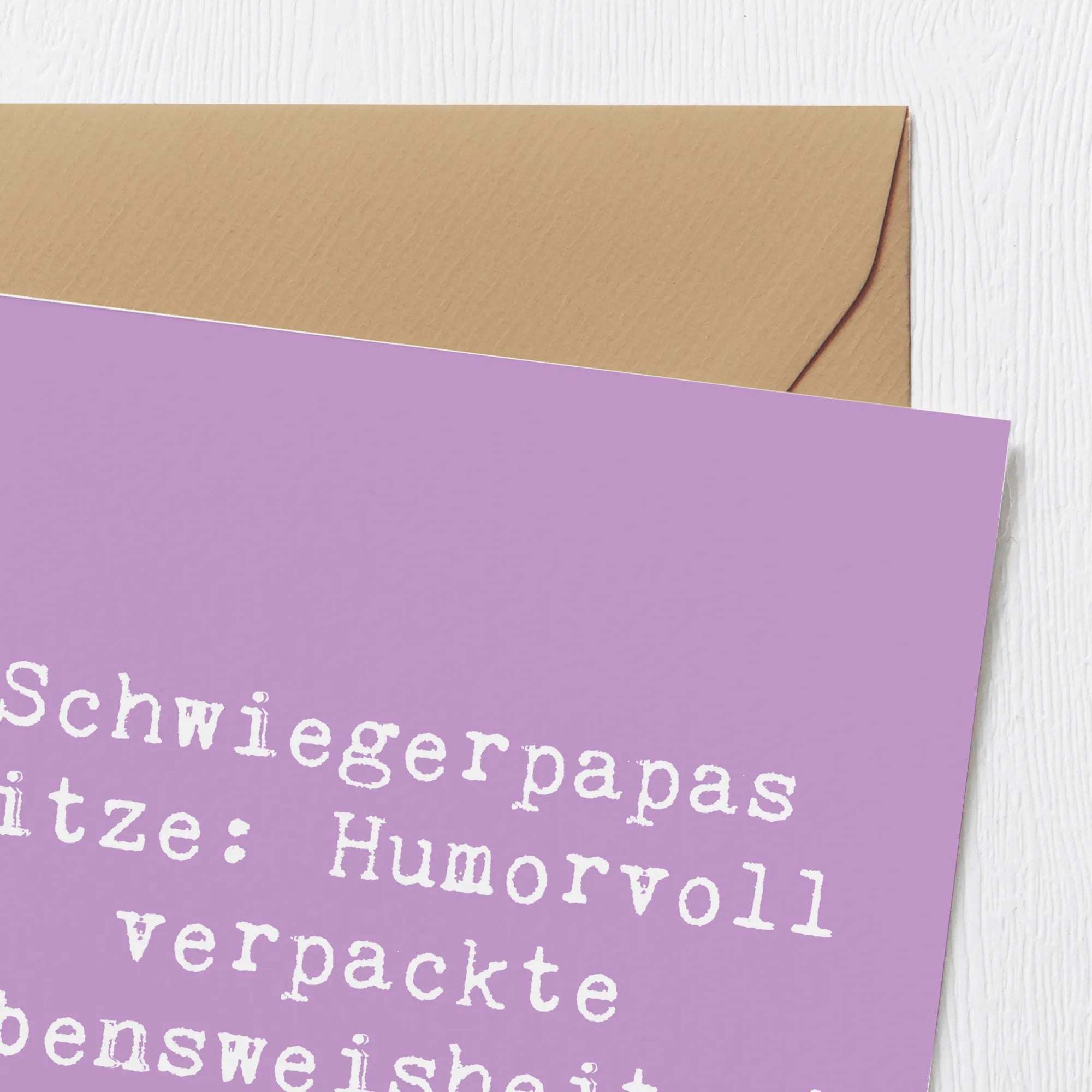 Schwiegerpapa, oder auch der Vater des Ehepartners, hat oft einen besonders wichtigen Platz in der Familie. Mit dieser Karte zeigst du ihm, wie sehr du seine Rolle wertschätzt. Die Vorderseite überzeugt durch eine hochglänzend veredelte Optik und bringt den Spruch "Schwiegerpapas Witze: Humorvoll verpackte Lebensweisheiten!" perfekt zur Geltung.
