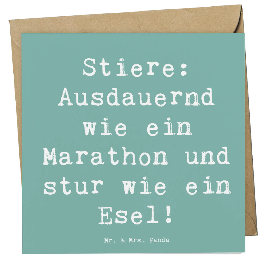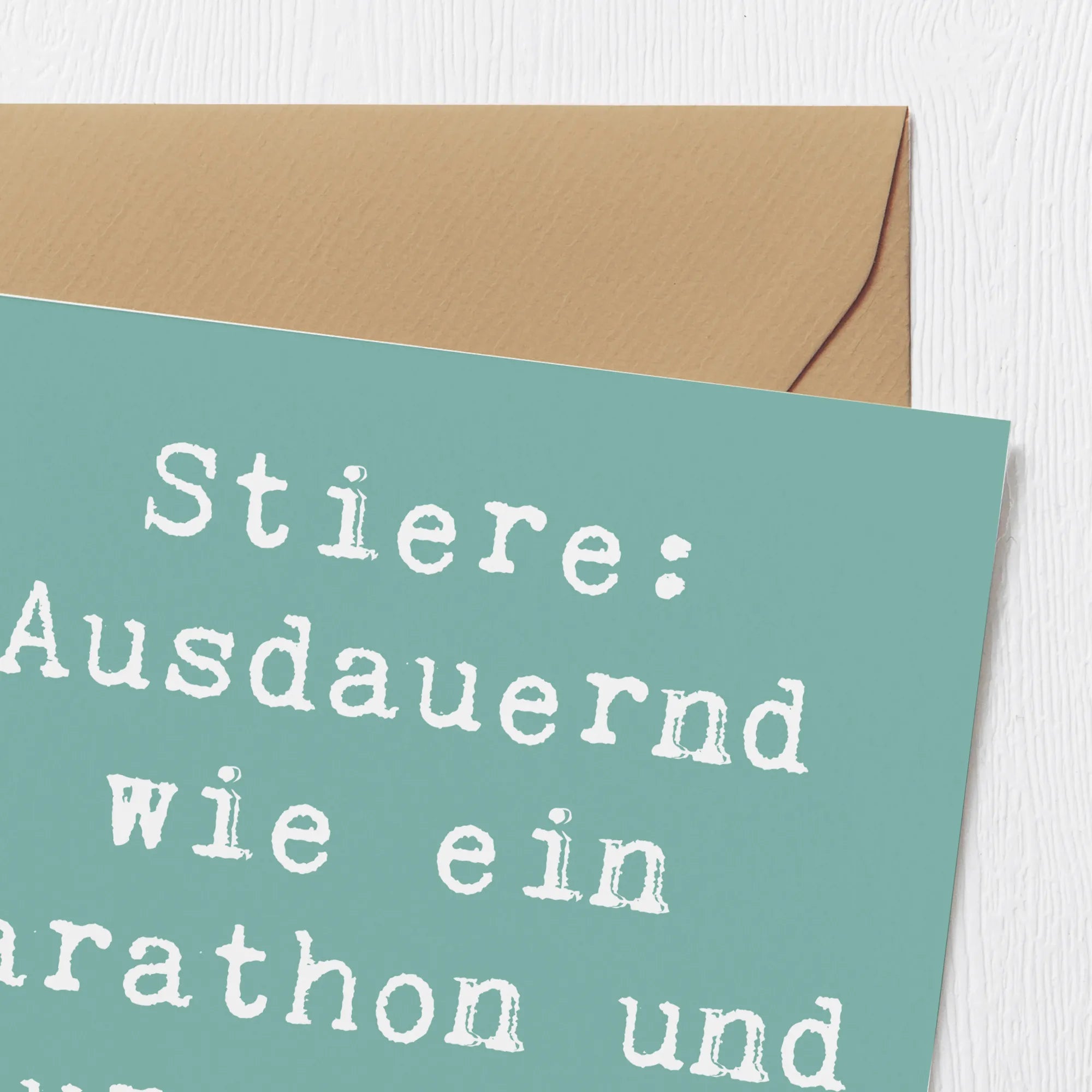 Mit dem Spruch 'Stiere: Ausdauernd wie ein Marathon und stur wie ein Esel!' wird die einzigartige Persönlichkeit im Tierkreiszeichen Stier humorvoll in Szene gesetzt. Die hochwertig verarbeitete Karte ist aus 300 Gramm Karton hergestellt und vereint edles Design mit Funktionalität. Die glänzend veredelte Vorderseite lässt die liebevoll handgezeichneten Motive besonders zur Geltung kommen, während die matte Innenseite ausreichend Platz für individuelle Glückwünsche bietet.