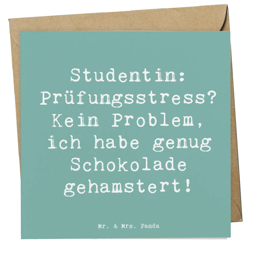 Du bist auf der Suche nach dem perfekten Geschenk für eine Studentin? Dann ist die Deluxe Karte von Mr. & Mrs. Panda genau das Richtige für Dich! Diese wunderschöne und hochwertig gestaltete Grußkarte aus edlem 300-Gramm-Karton bringt nicht nur Freude, sondern auch eine herzliche Botschaft mit. Mit dem Spruch "Studentin: Prüfungsstress? Kein Problem, ich habe genug Schokolade gehamstert!" sorgt sie garantiert für ein Schmunzeln und erhellt den stressigen Studienalltag auf effektive Weise.