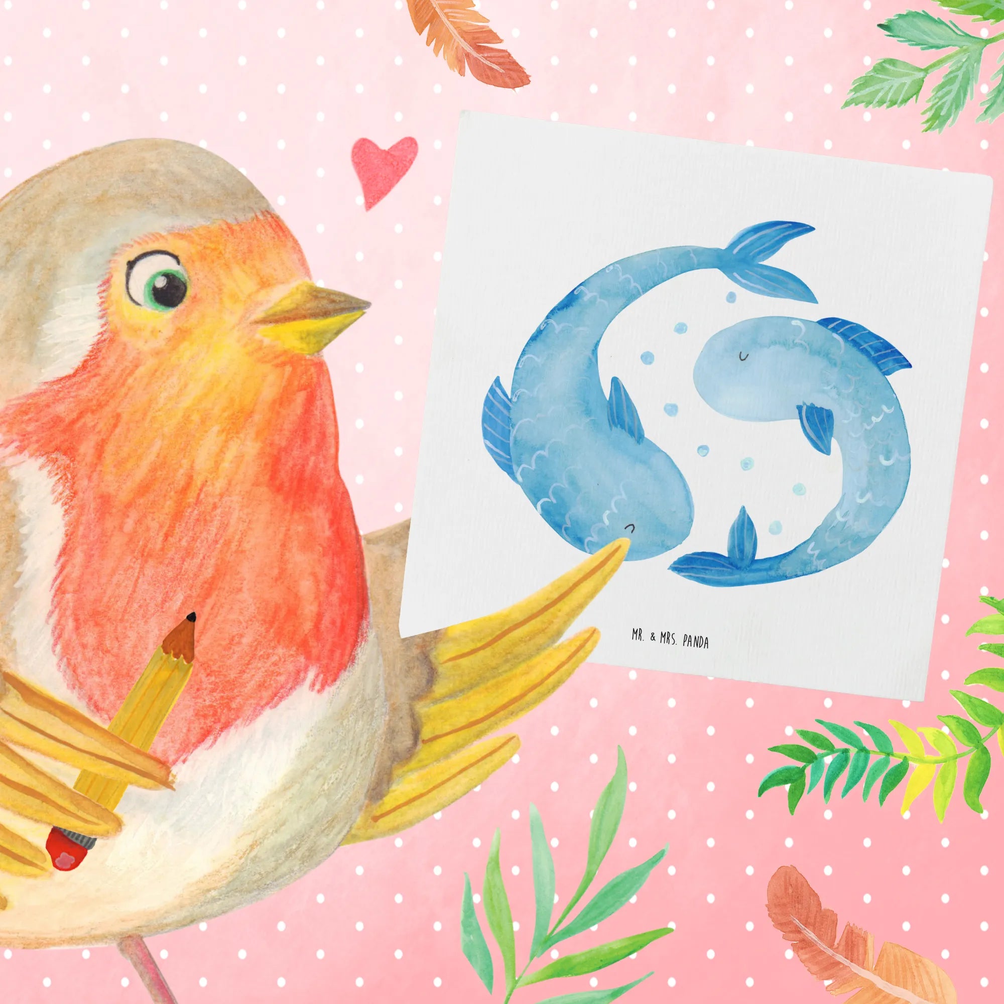 Diese hochwertige Klappkarte von Mr. & Mrs. Panda ist mit liebevollen Handzeichnungen versehen, die das Wesen der Fische einfangen. Die Motive zeigen zwei Fische, die verspielt im Wasser schwimmen, und die Karte ist auf hochwertigem 300 Gramm Karton matt glänzend bedruckt, was für einen edlen Look sorgt. Mit der Größe von 140 mm x 140 mm bietet sie genug Platz für Deine persönlichen Wünsche und Grüße.