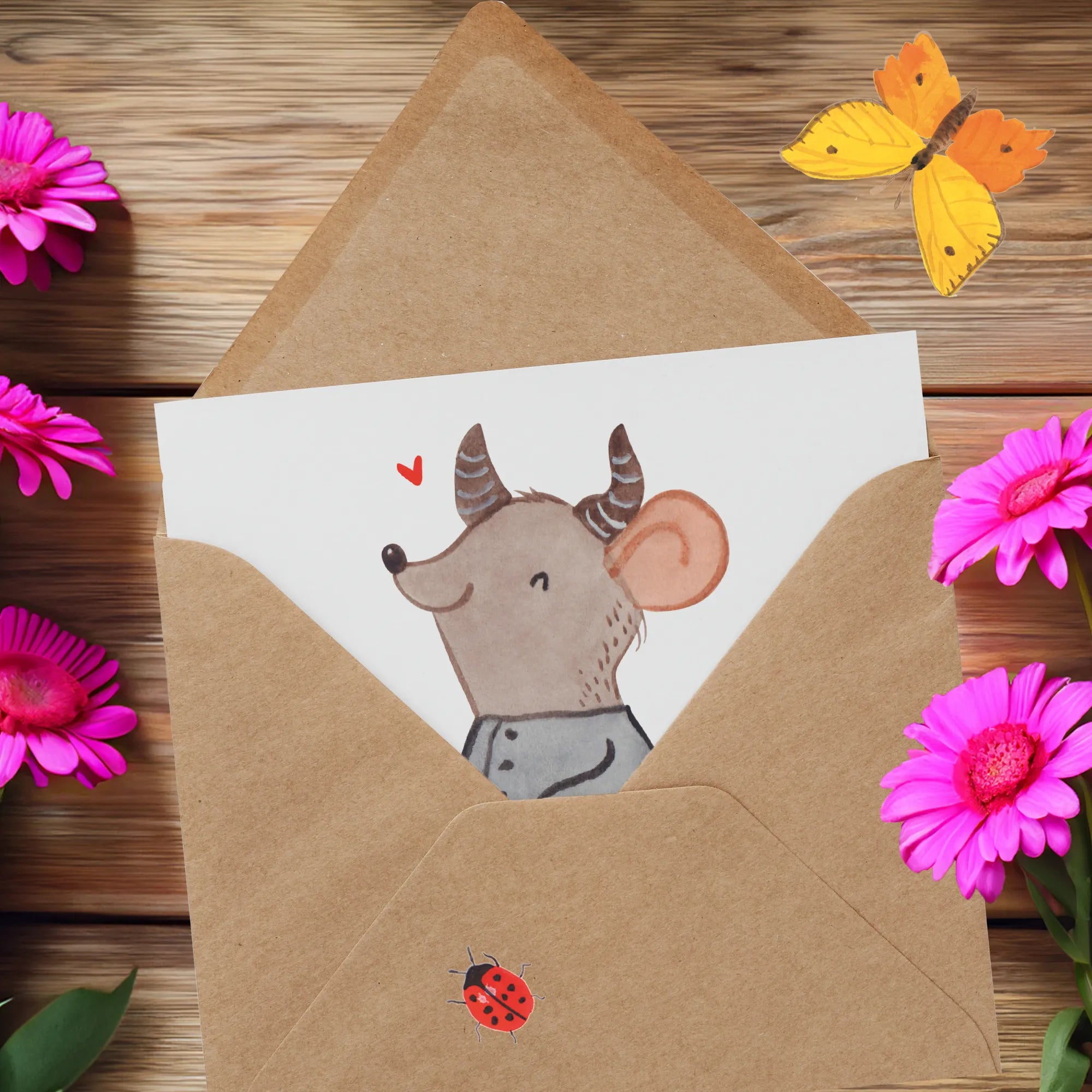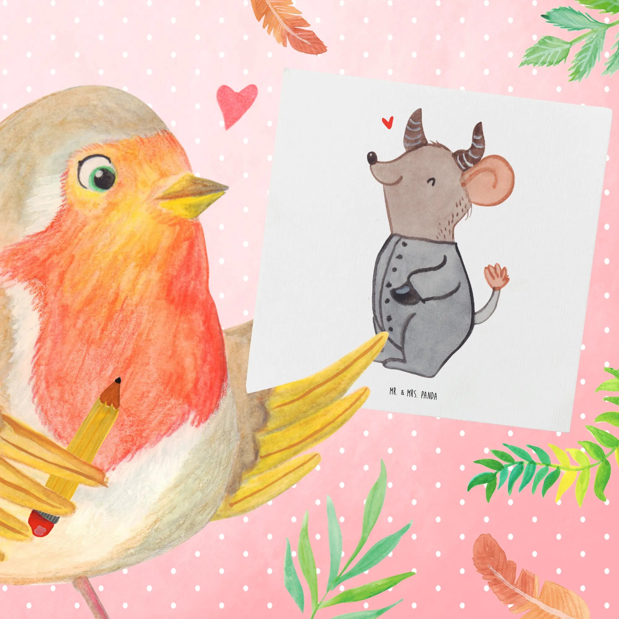 Die Maus trägt fröhlich geschwungene Hörner und ein lässiges Outfit – ein Blickfang, der jeden Stierliebhaber begeistert! Ihre fröhliche Ausstrahlung und das einladende Lächeln sprechen für die Zuverlässigkeit und Praktikabilität des Sternzeichens Stier. Die Botschaft "Unter dem Zeichen des Stiers: Praktisch, zuverlässig, unvergesslich" rundet das Design ab und verleiht der Karte eine tiefere Bedeutung.