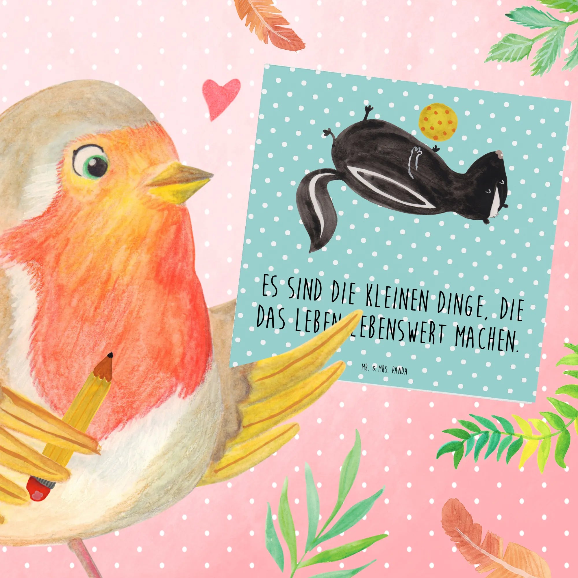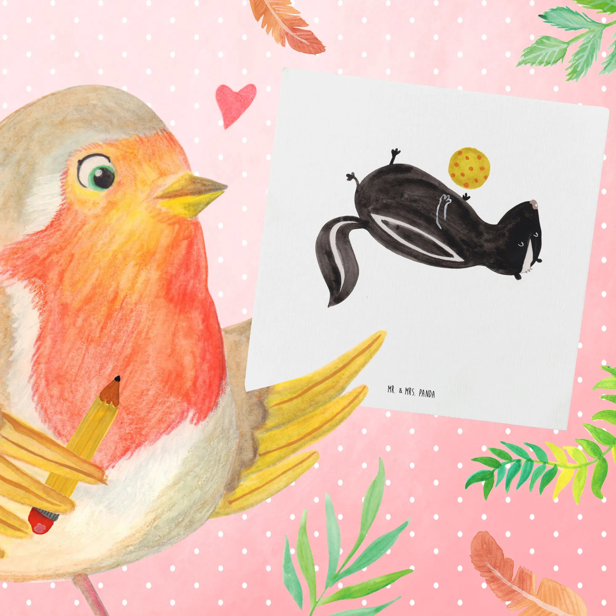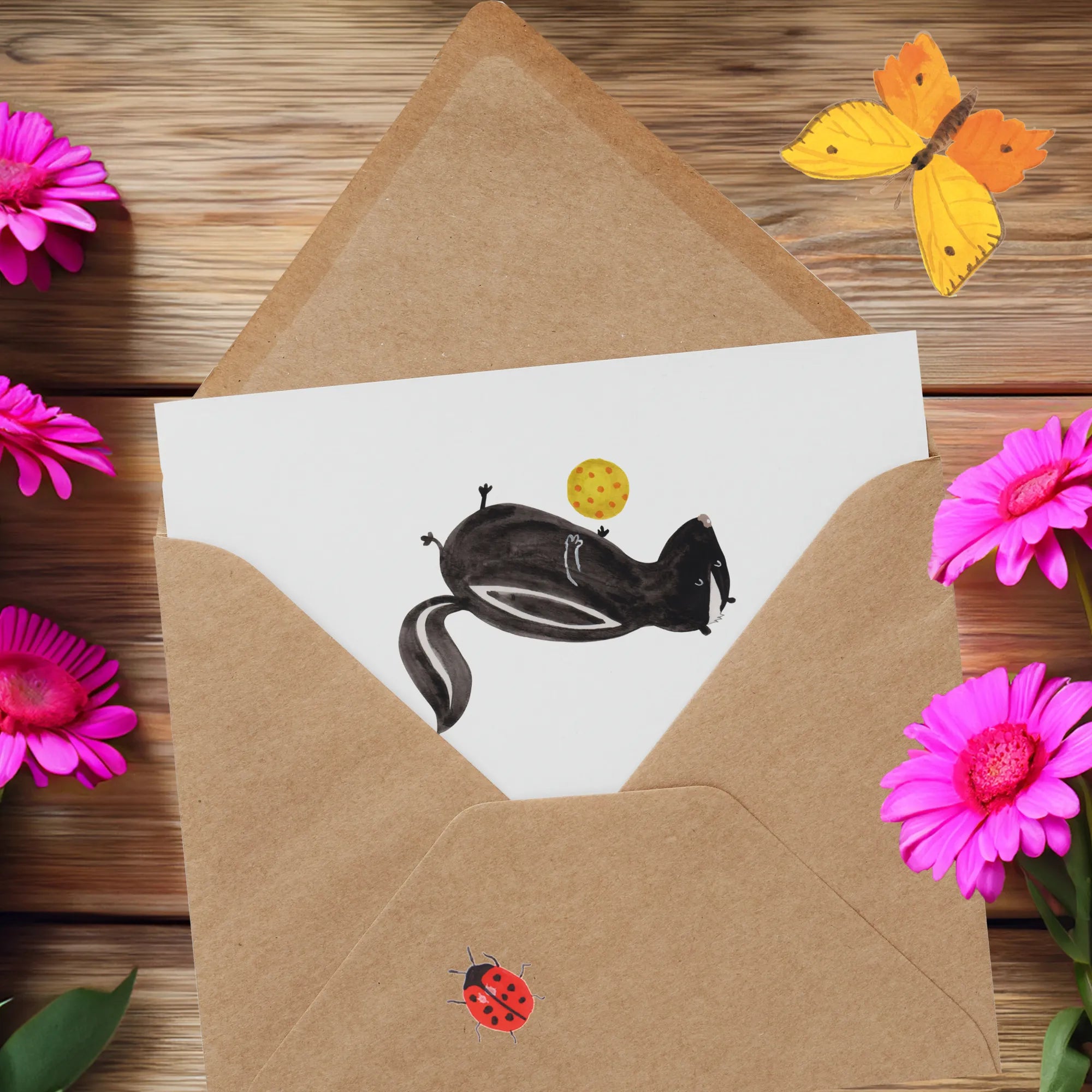 Die spezielle Stinktier-Kollektion wurde in Erinnerung an Herrn Blume, das treue Haustier von Mrs. Panda, geschaffen. Er hat neun Jahre lang Freude und Liebe verbreitet, und mit dieser Karte kannst auch Du jemandem ein Stück dieser Freude schenken.