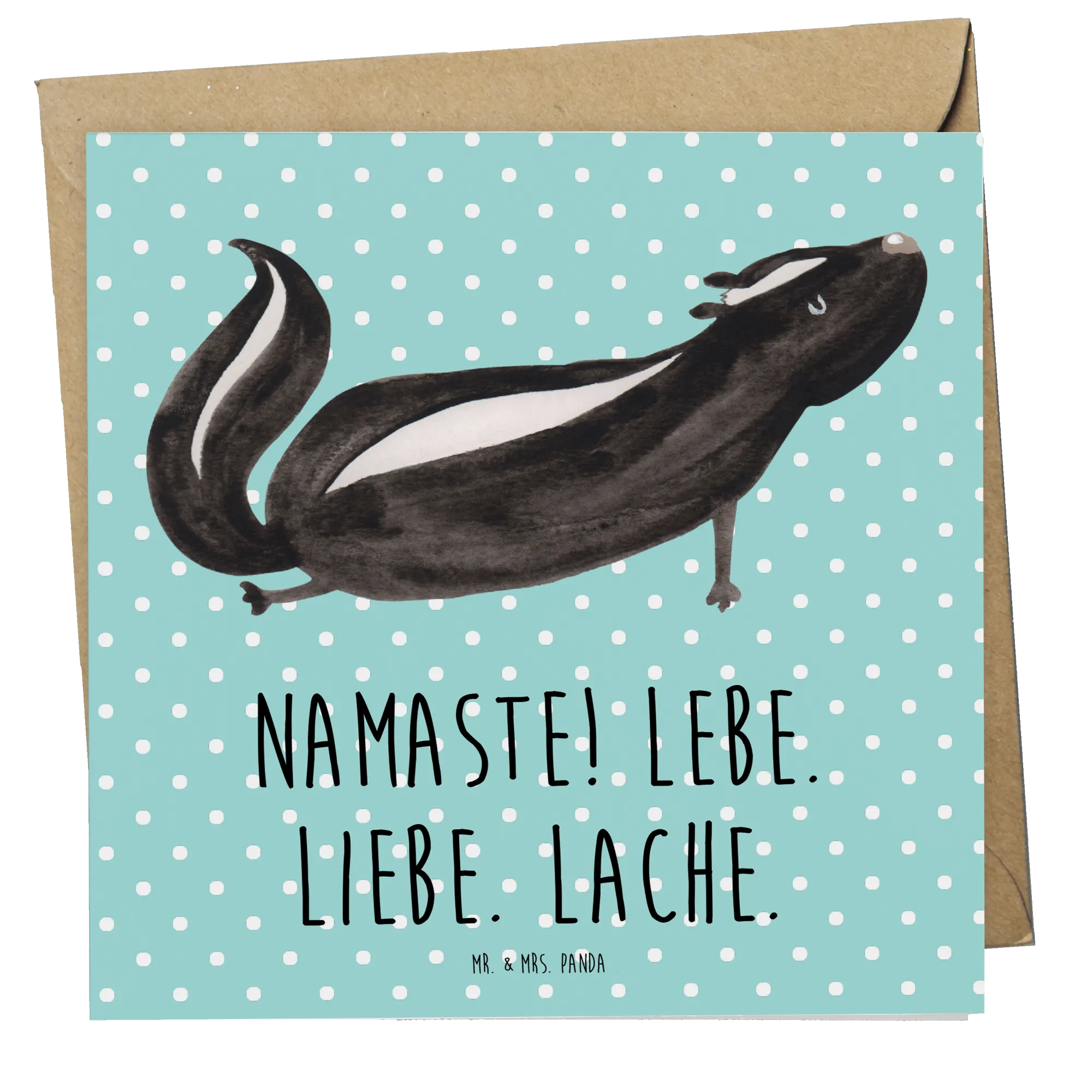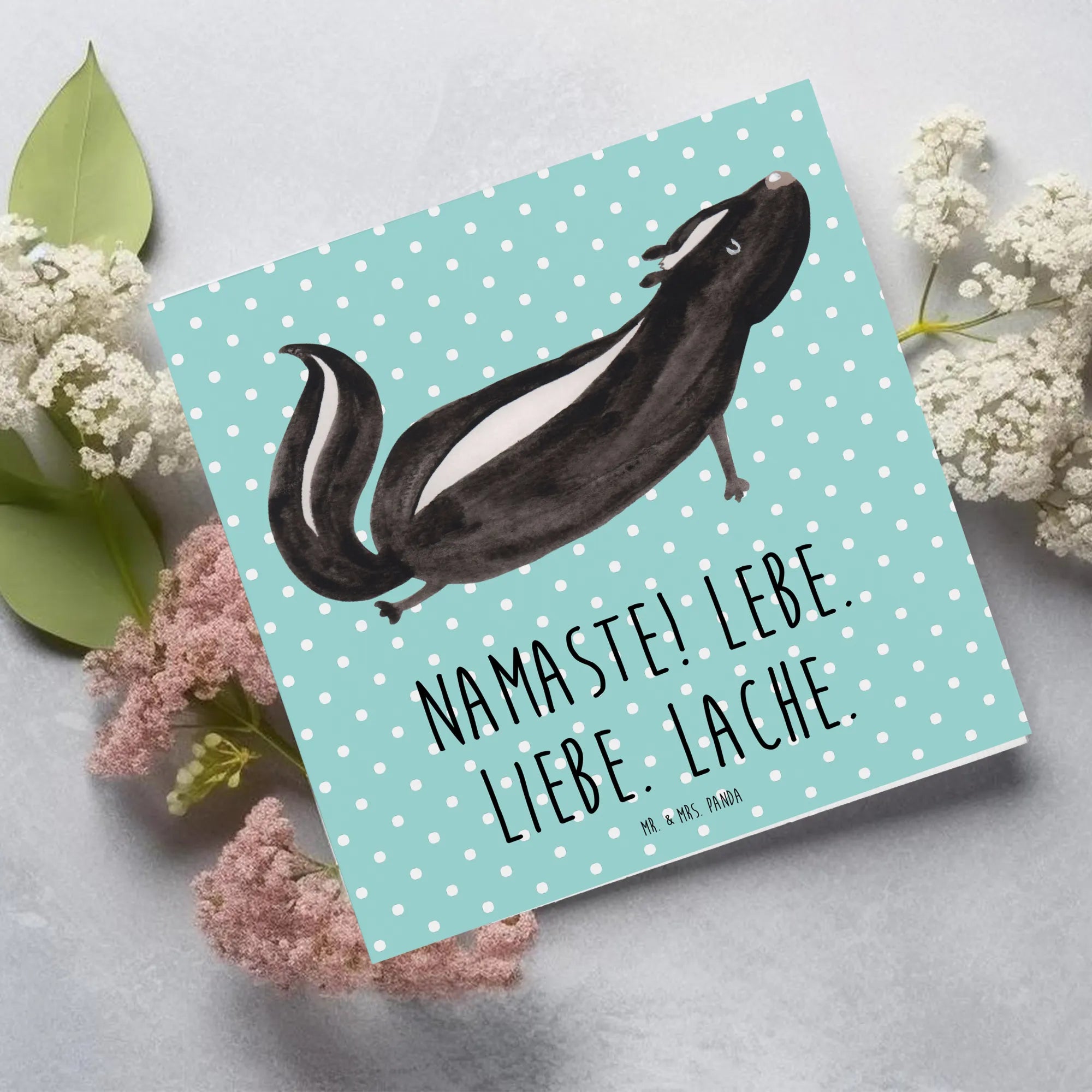 Die Deluxe Karte mit dem süßen Stinktier Yoga-Motiv von Mr. & Mrs. Panda ist das perfekte Geschenk für jeden Anlass! Ob zur Hochzeit, zum Geburtstag oder einfach nur um jemandem eine Freude zu machen – diese hochwertige, quadratische Grußkarte begeistert nicht nur durch ihr bezauberndes Design im Aquarellstil, sondern bringt auch eine positive Botschaft mit sich: "Namaste! Lebe. Liebe. Lache." Diese Worte sind nicht nur ein Slogan, sondern eine Lebenshaltung, die du mit Freunden und Angehörigen teilen kannst.