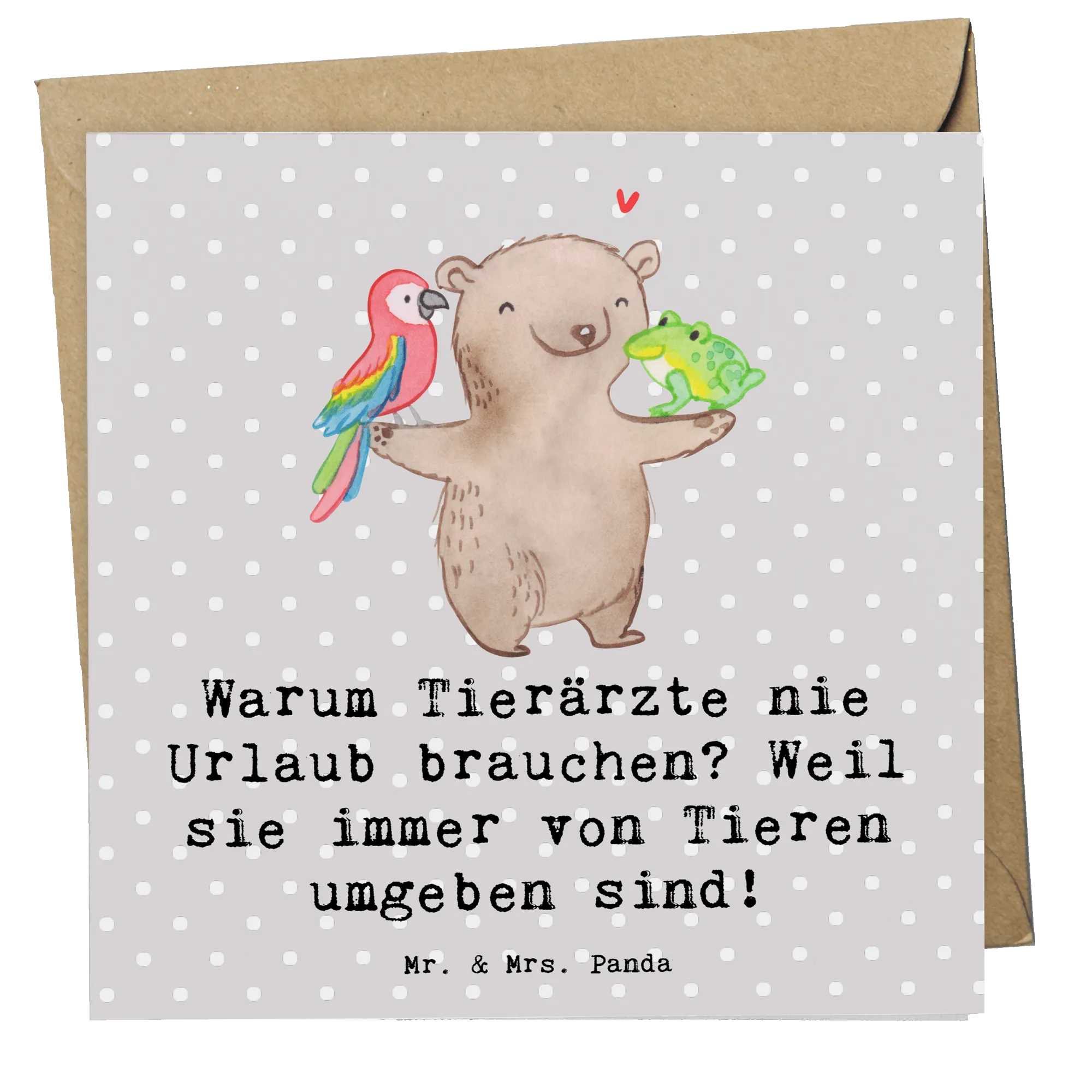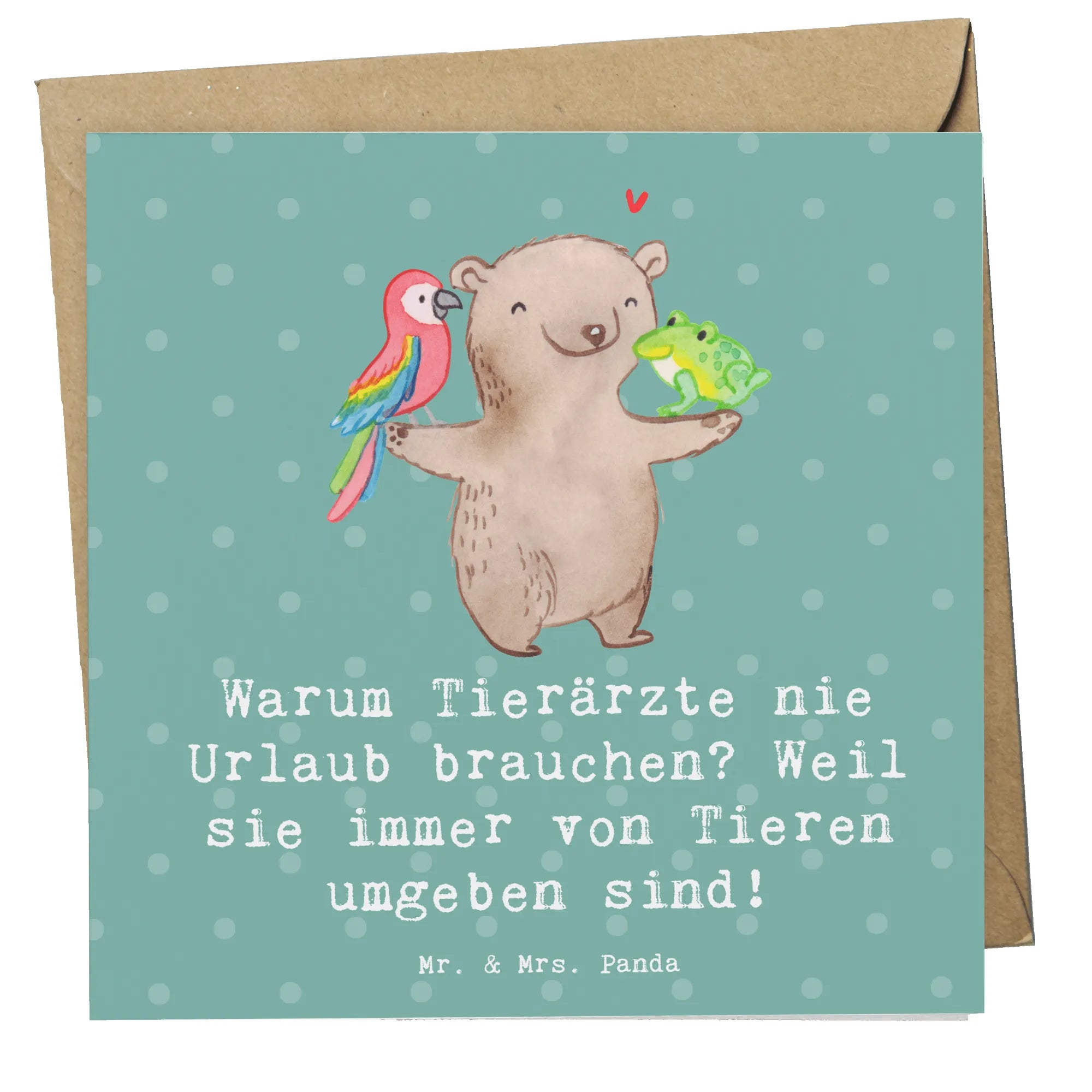 Unsere Deluxe Karte „Tierarzt" aus der Berufe-Kollektion von Mr. & Mrs. Panda ist das ideale Geschenk für alle, die ihr Leben den Tieren widmen. Mit dem charmanten Spruch „Warum Tierärzte nie Urlaub brauchen? Weil sie immer von Tieren umgeben sind!" auf der Vorderseite bringt diese quadratische Grußkarte Schmunzeln und Wertschätzung zugleich. 🐾