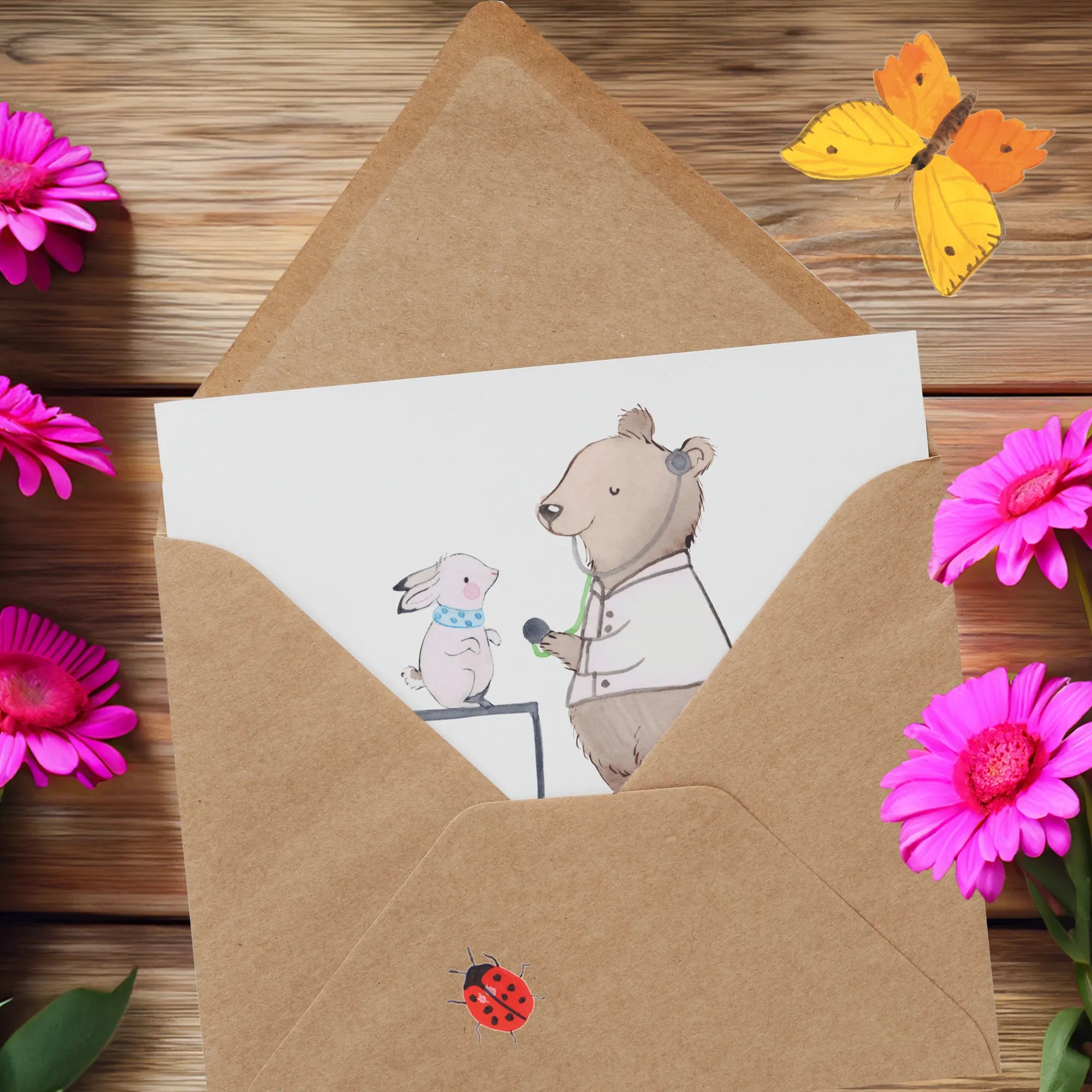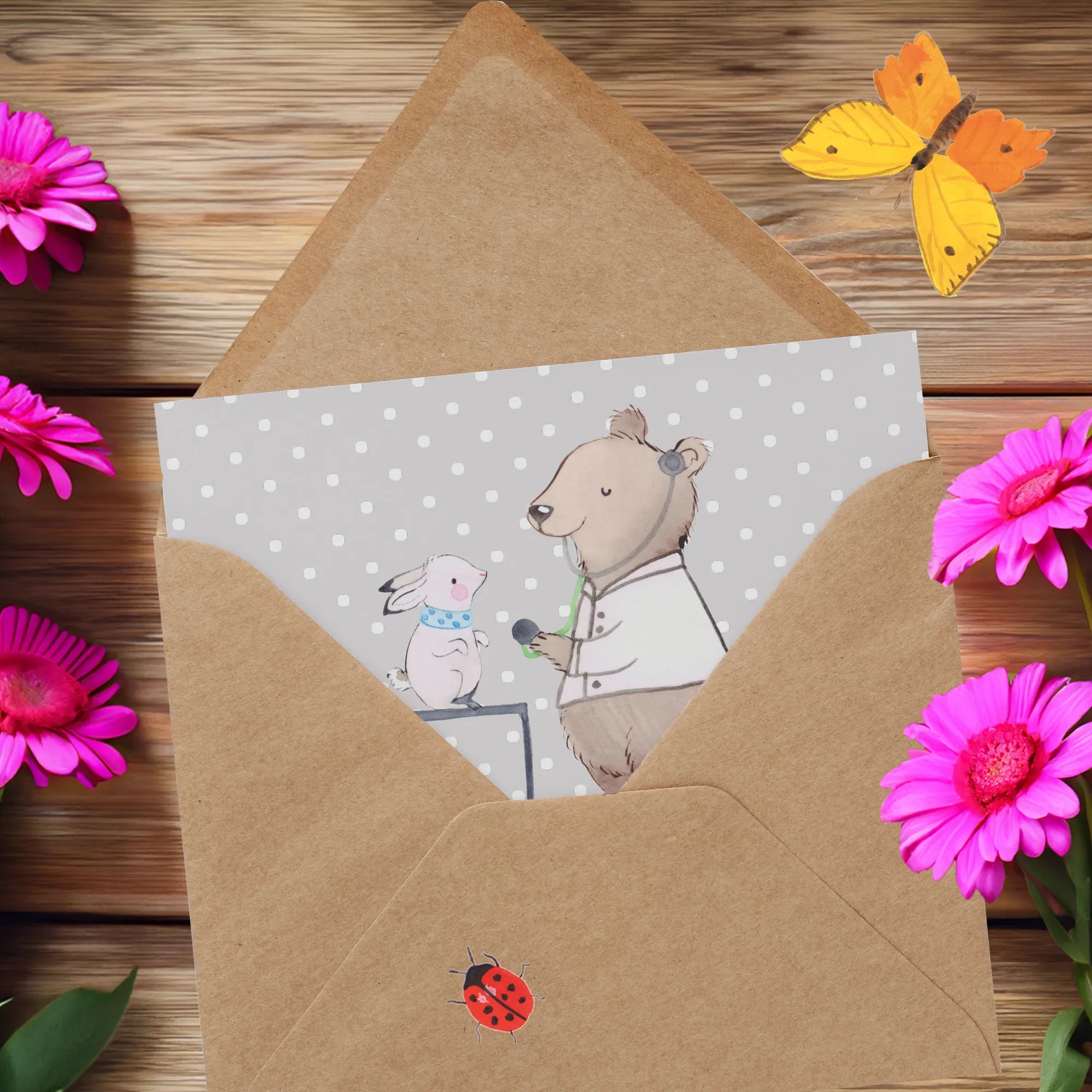 Die Vorderseite der Karte ist mit einem liebevollen Motiv bedruckt, das von Mrs. Panda handgezeichnet wurde. Das Bild zeigt einen niedlichen Tierheilpraktiker, der die Botschaft verkörpert, dass unsere vierbeinigen Freunde professionelle Hilfe verdienen.