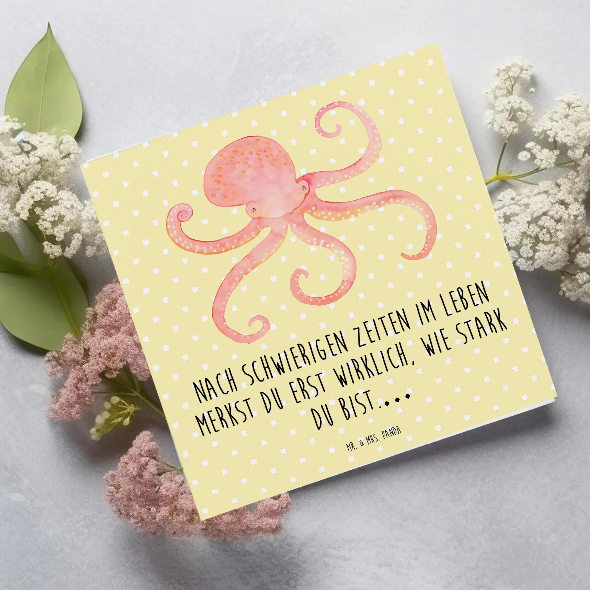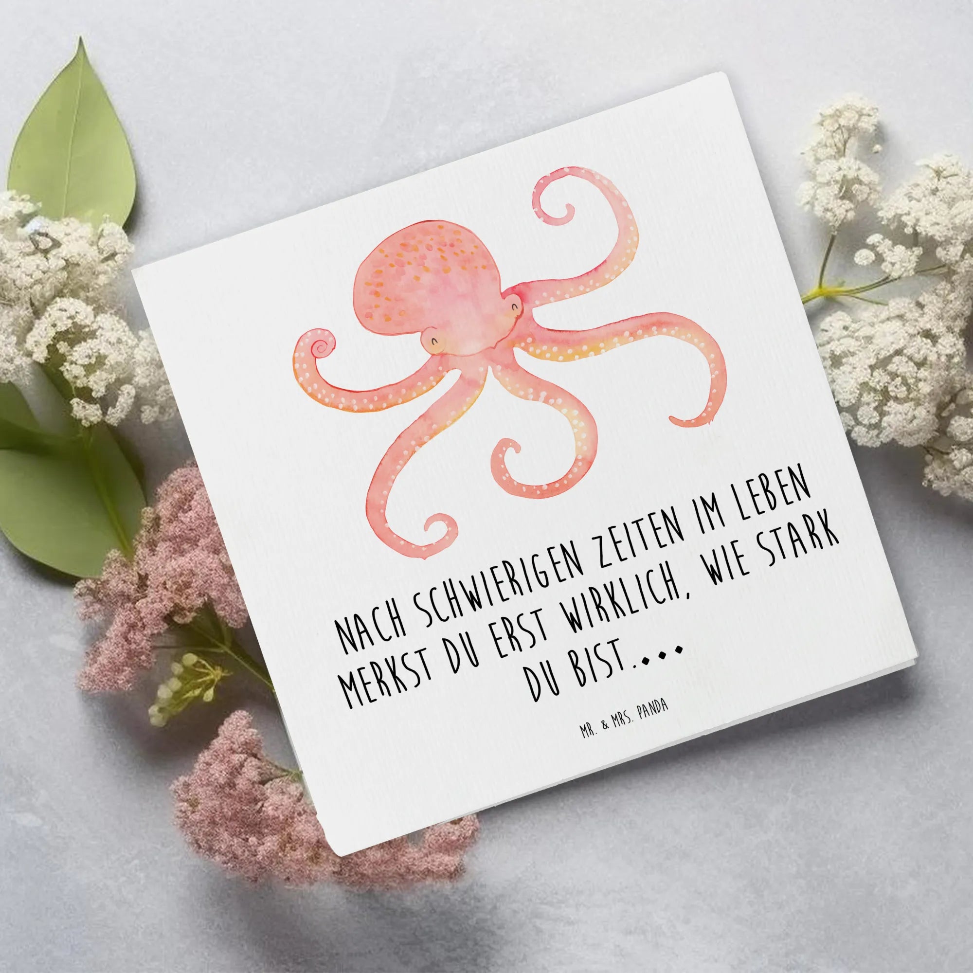 Die Deluxe Karte von Mr. & Mrs. Panda mit dem fröhlichen Tintenfisch-Motiv ist das perfekte Geschenk für jeden Anlass, sei es ein Geburtstag, eine Hochzeit oder einfach nur zur Aufmunterung. Diese hochwertige quadratische Karte bringt nicht nur Freude, sondern auch eine Botschaft, die das Herz erwärmt: 'Nach schwierigen Zeiten im Leben merkst du erst wirklich, wie stark du bist...'. Mit einem entzückenden, roten Tintenfisch auf der Vorderseite, der mit seinen vielen Armen fröhlich winkt, sorgt diese Karte dafür, dass du nie die guten Zeiten aus den Augen verlierst.