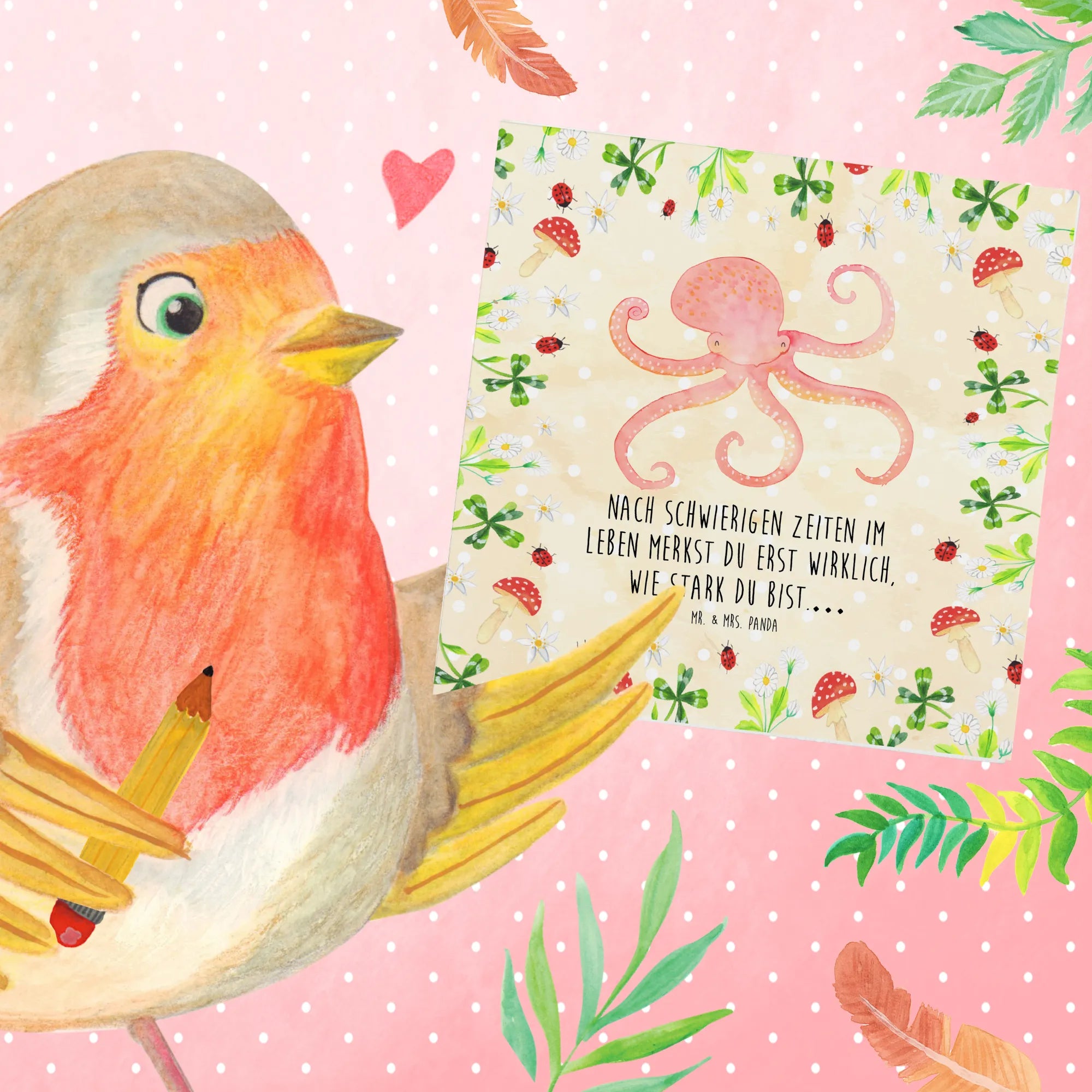 Mit ihrem strahlend roten Tintenfisch, der fröhlich mit seinen vielen Armen winkt, wird sie die Herzen Deiner Liebsten im Sturm erobern. Der Tintenfisch ist nicht nur ein süßes Motiv, sondern auch ein Symbol für Stärke und Lebensmut. Denn nach schwierigen Zeiten im Leben merkst Du erst richtig, wie stark Du bist. Diese Botschaft wird durch die hochwertige Veredelung der Karte und den stilvollen Umschlag perfekt unterstrichen.