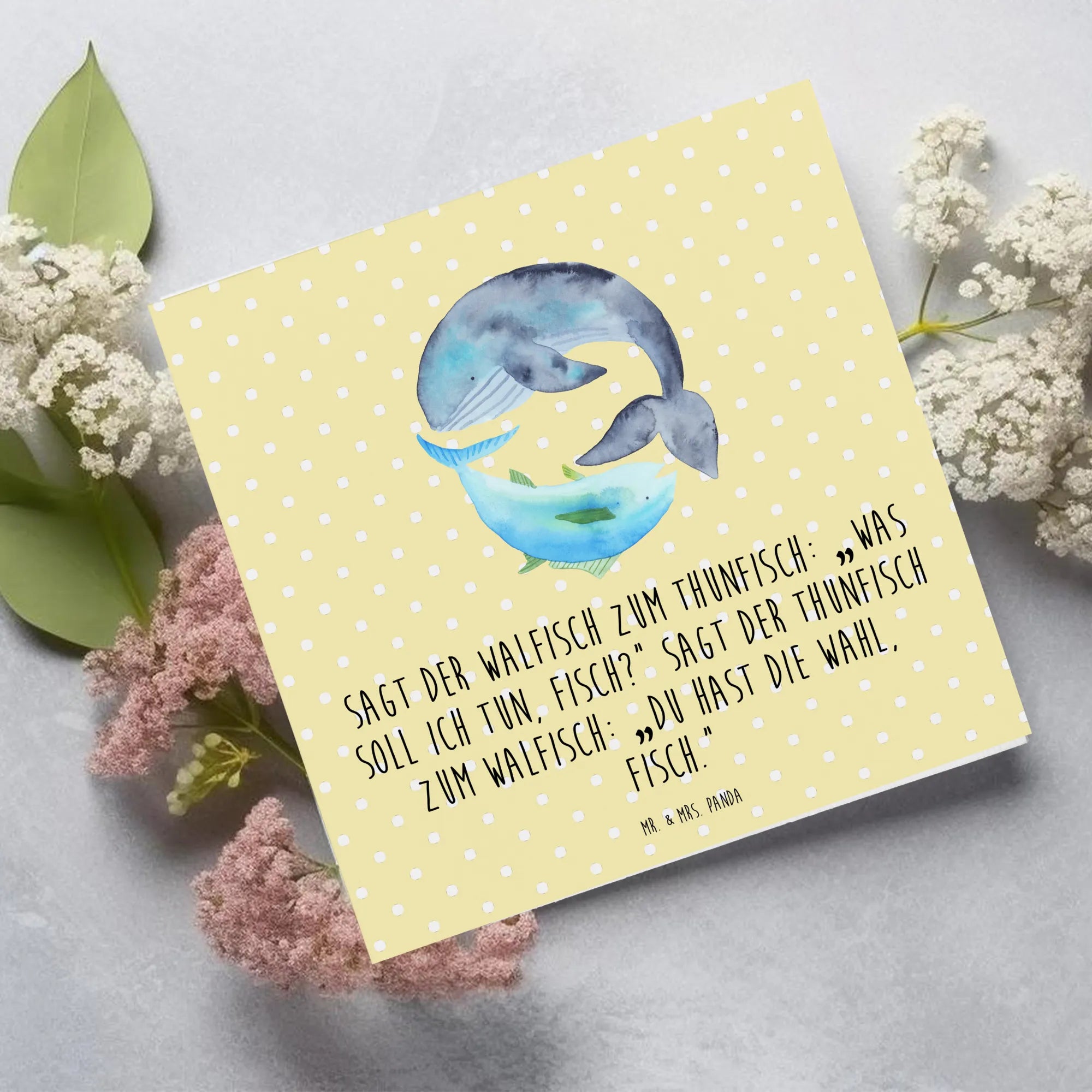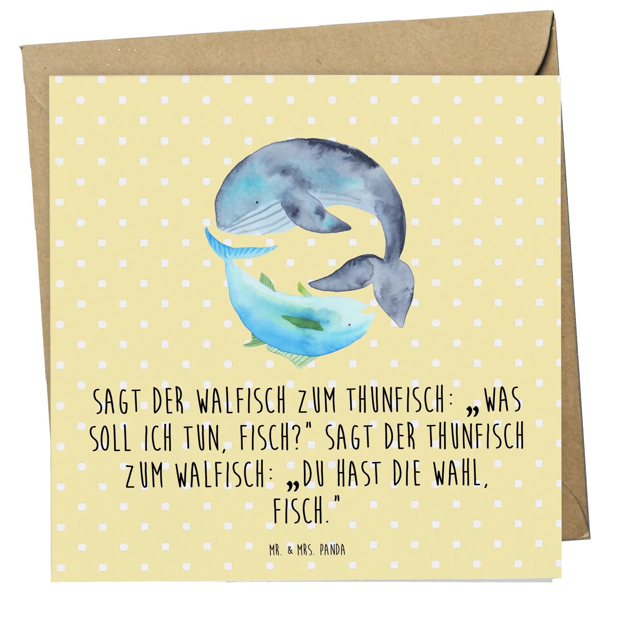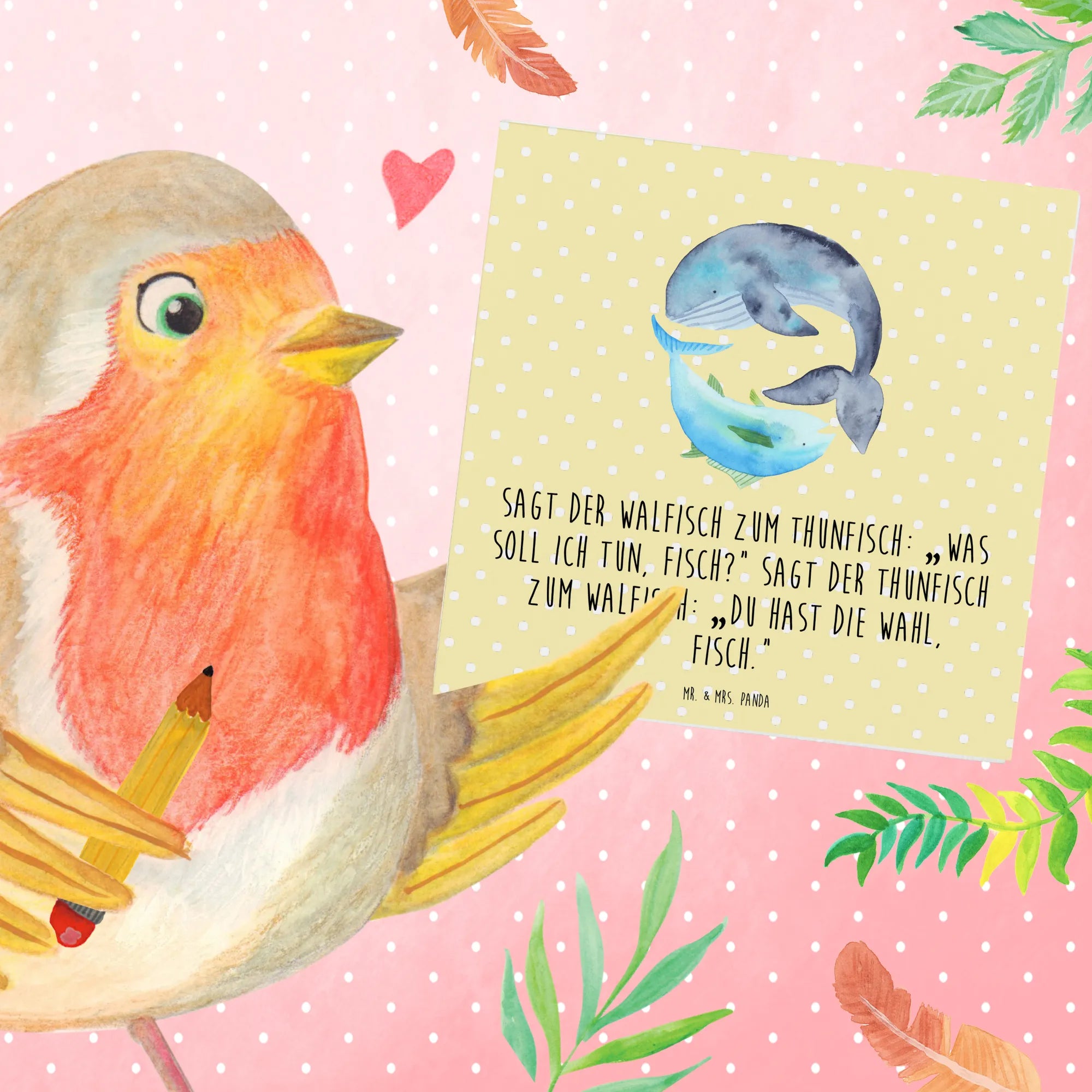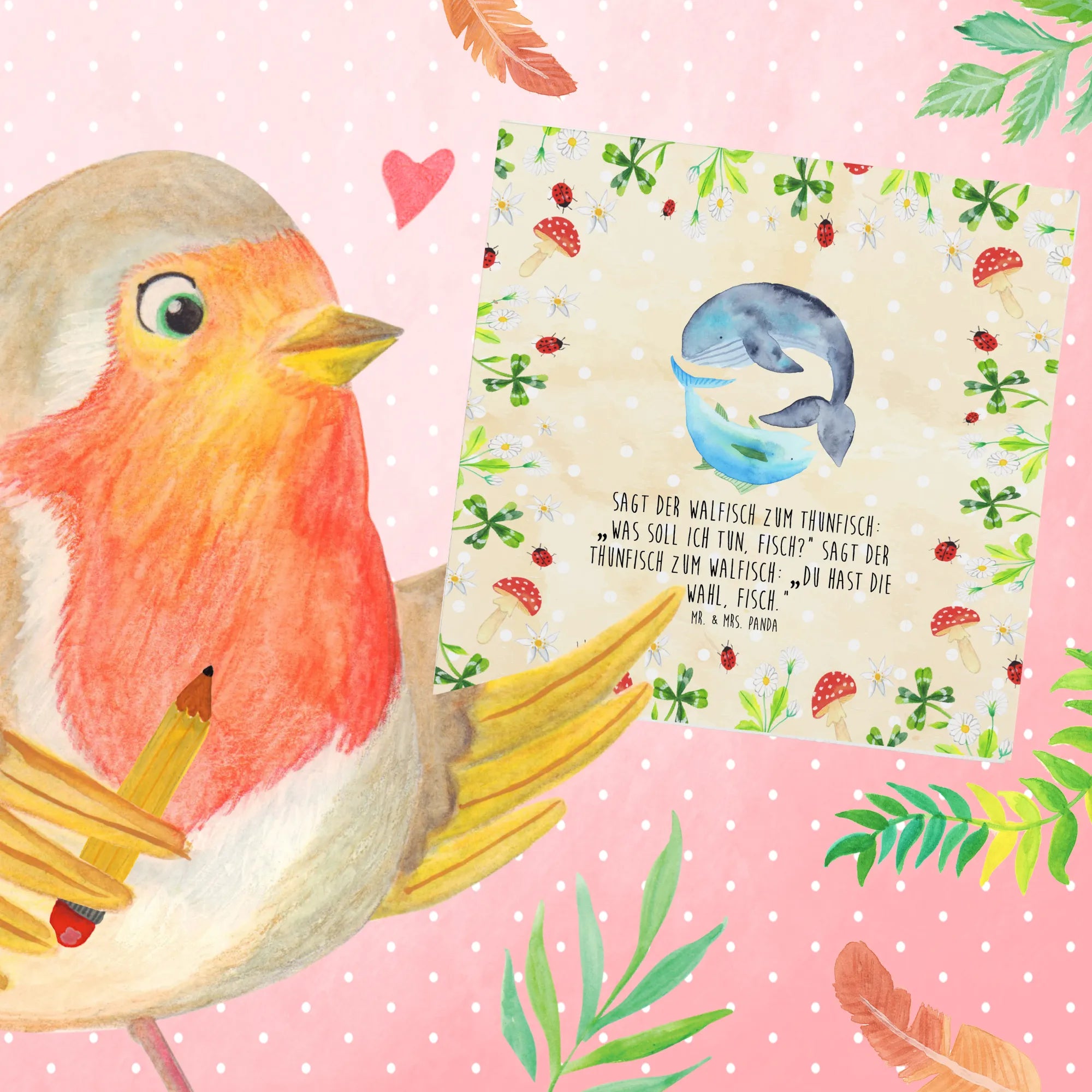 Die Deluxe Karte Walfisch & Thunfisch aus der Small World Kollektion von Mr. & Mrs. Panda ist das perfekte Geschenk für kreative Menschen, die ihren individuellen Gruß auf besondere Art und Weise übermitteln möchten. Diese wunderschöne und hochwertige quadratische Karte, gefertigt aus edlem 300 Gramm Karton, besticht durch ihr zauberhaftes Design und ihren lustigen Spruch: "Sagt der Walfisch zum Thunfisch: ‚Was soll ich tun, Fisch?‘ Sagt der Thunfisch zum Walfisch: ‚Du hast die Wahl, Fisch.‘".