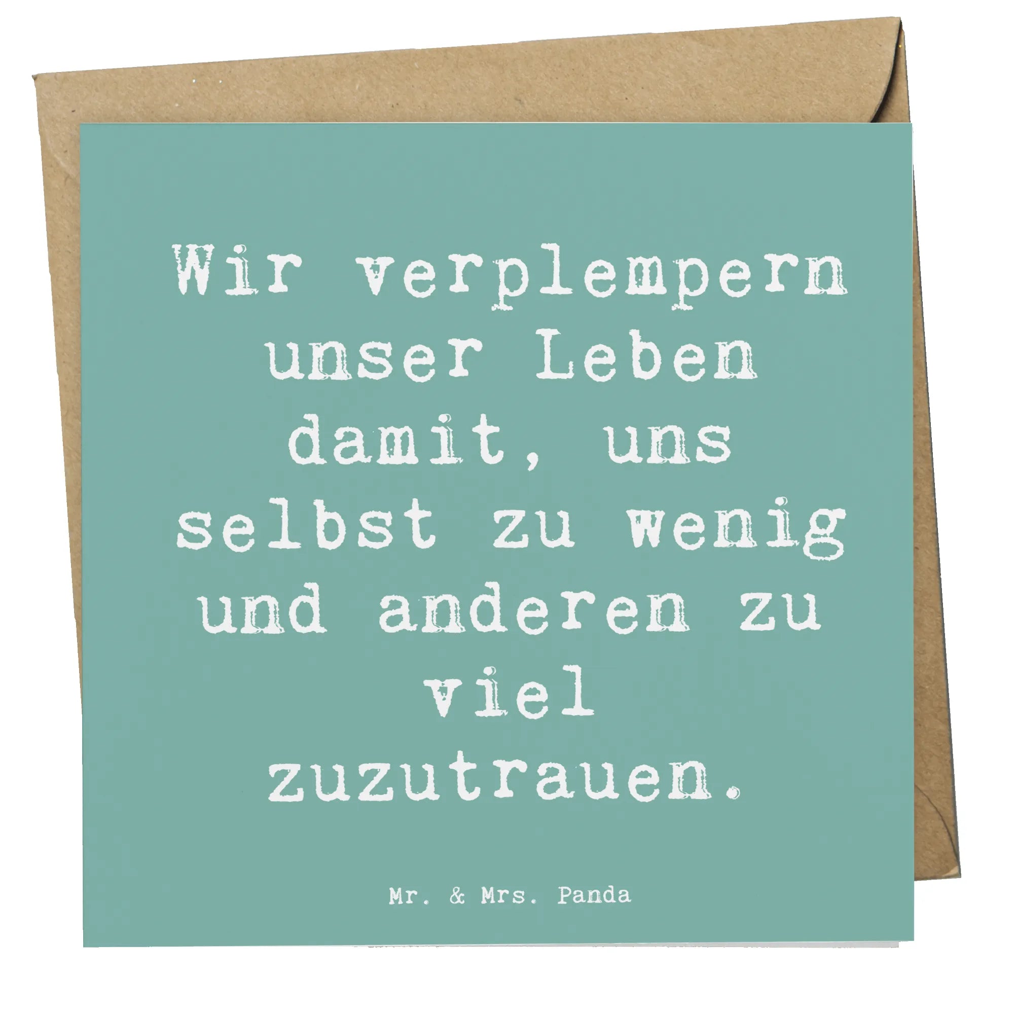 Der süße Spruch "Wir verplempern unser Leben damit, uns selbst zu wenig und anderen zu viel zuzutrauen." regt zum Nachdenken an und bringt die Leichtigkeit des Lebens perfekt zum Ausdruck. Verschenke die Karte, um jemandem Mut zu machen, seine Träume zu verfolgen oder um einfach ein wenig Freude in den Alltag zu bringen.