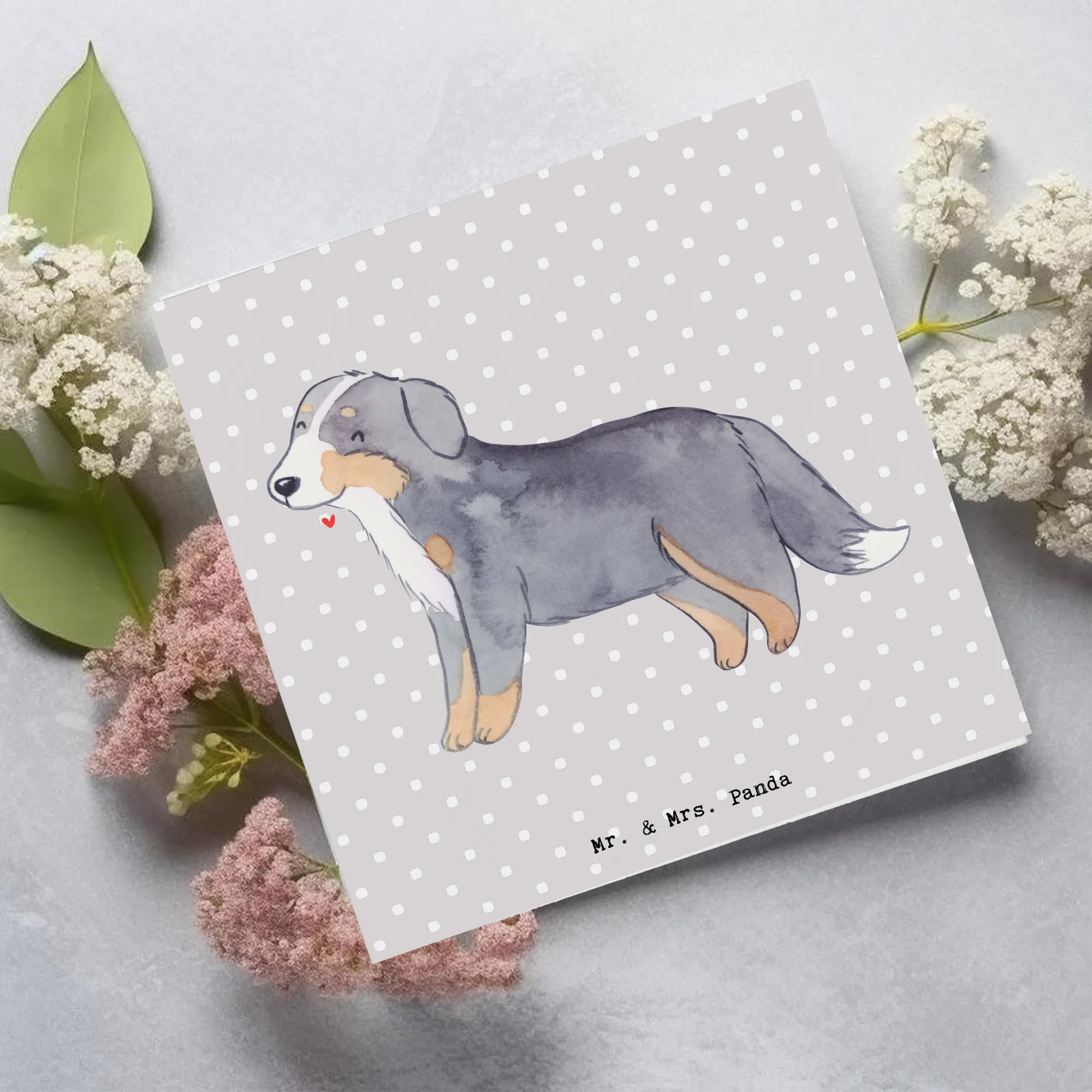 Die quadratische Gestaltung und die dezente Grau-Pastell-Hintergrundfarbe machen die Karte modern und elegant zugleich. Sie ist nicht personalisierbar und bietet eine blanko Innenseite, sodass Du Deine ganz eigenen Worte, Erinnerungen oder Glückwünsche eintragen kannst. Perfekt als Geschenk für Hundebesitzer, als Dankeschön an den Hundesitter oder als besondere Geburtstagskarte für Berner-Freunde.