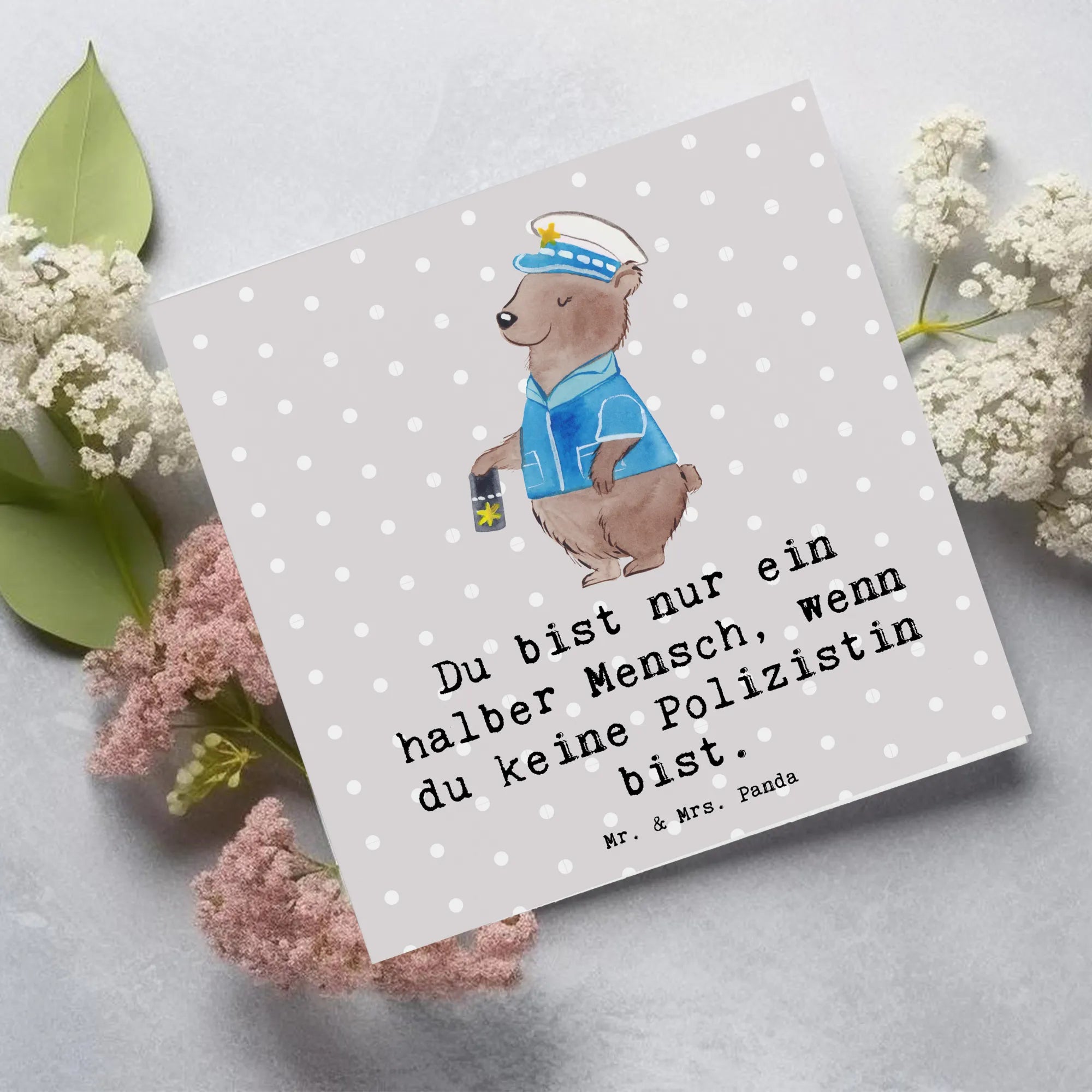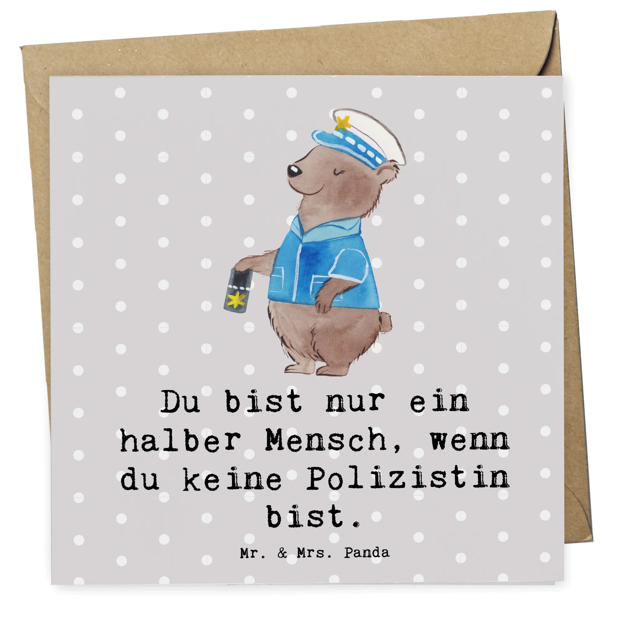 Das Design zeigt einen stolzen Bären in Polizeiuniform, der voller Stolz seine Dienstmarke präsentiert. Dass dieser Bär eine Frau ist, macht die Karte zu einem ganz persönlichen Highlight für jede Polizistin, Polizeibeamtin oder Wachfrau da draußen. Der begleitende Slogan "Du bist nur ein halber Mensch, wenn du keine Polizistin bist." unterstreicht die Leidenschaft, mit der dieser Beruf ausgeübt wird. Es ist mehr als nur ein Job, es ist eine Berufung. 💖