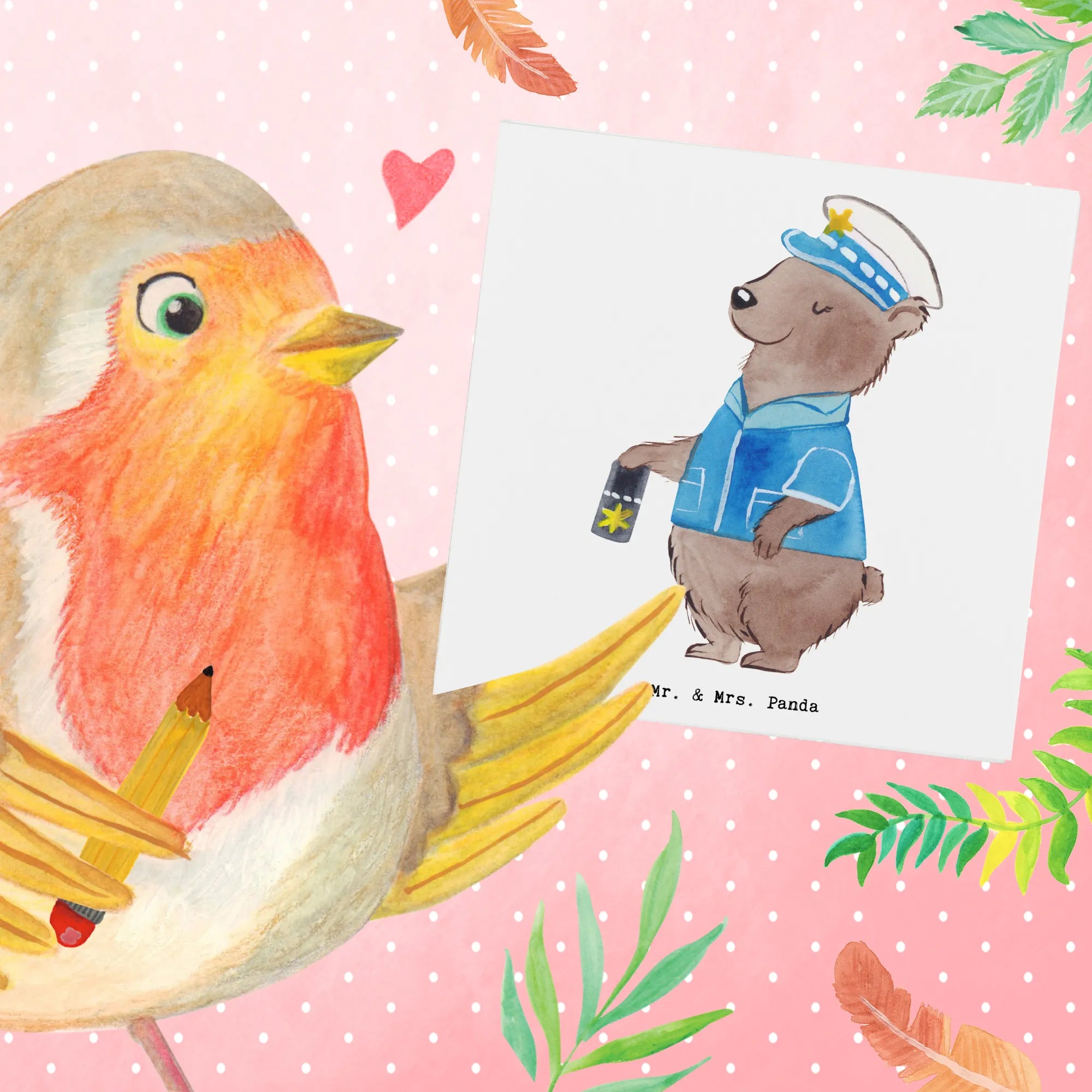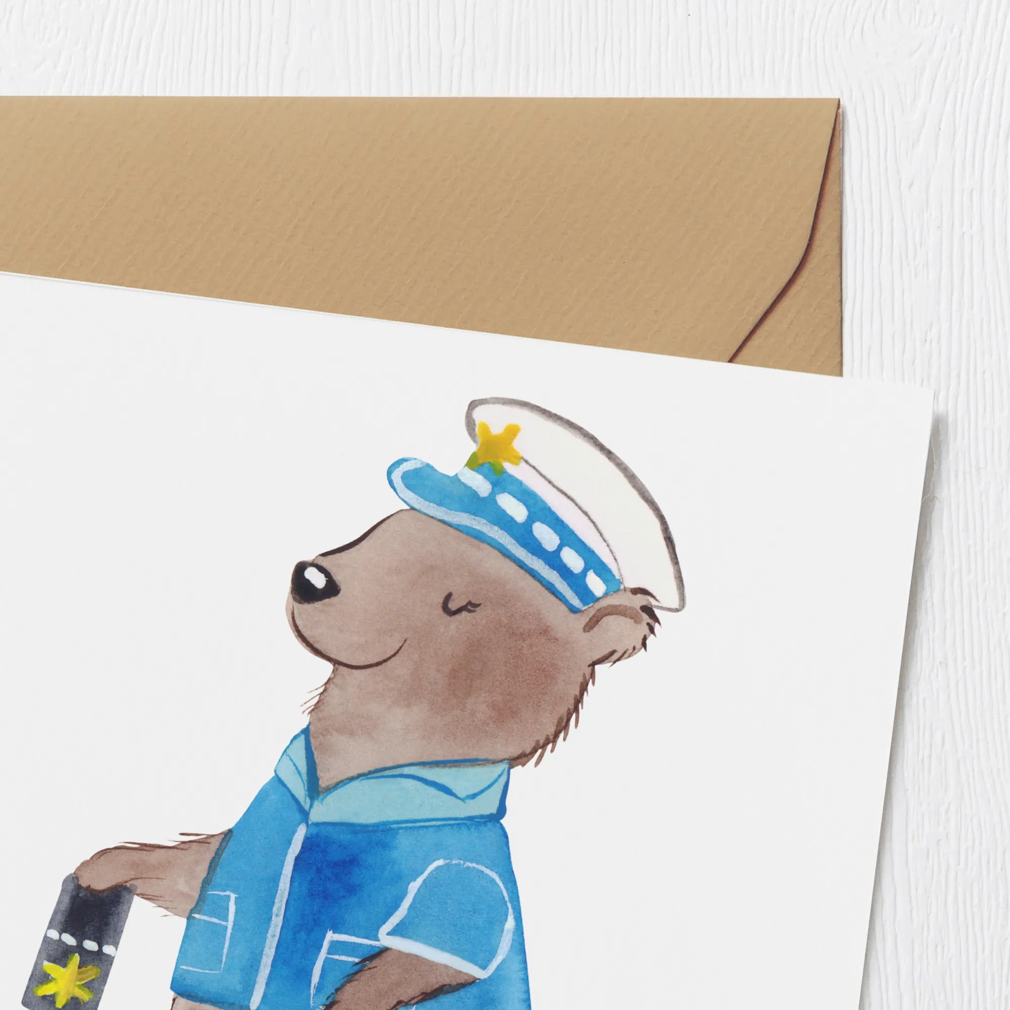 Dieses Motiv bringt ein Augenzwinkern in den Dienstalltag: ein niedlicher Bär in Uniform, eine Frau, die ihre Dienstmarke zeigt — ein cooler, aber warmherziger Cop. Wir von Mr. & Mrs. Panda feiern die Mischung aus Professionalität und Herz; ein Cop muss nicht hart und unnahbar sein, sondern kann freundlich, aufmerksam und stark zugleich sein. Dieses Bild strahlt genau diese Balance aus.