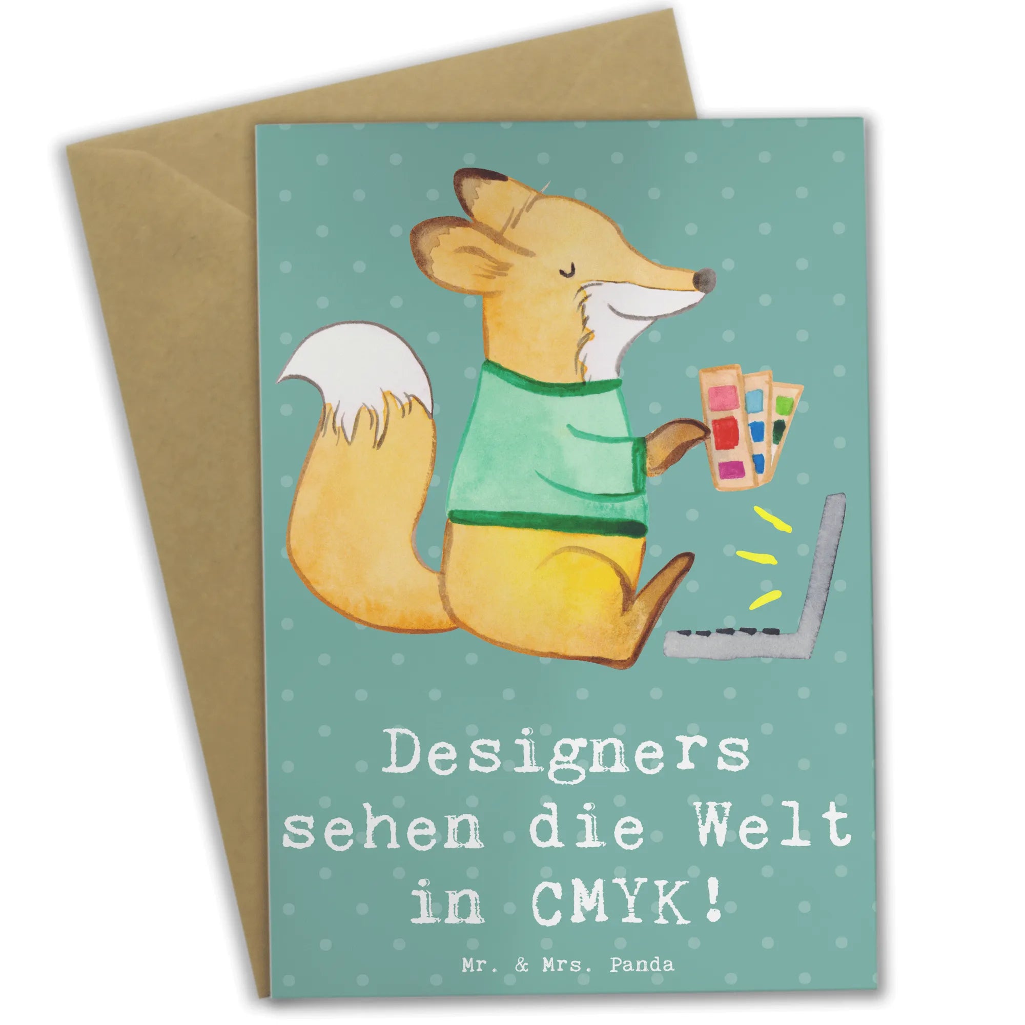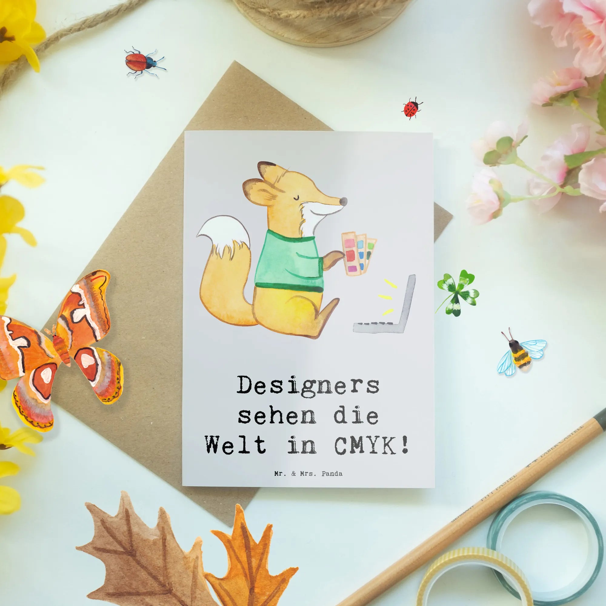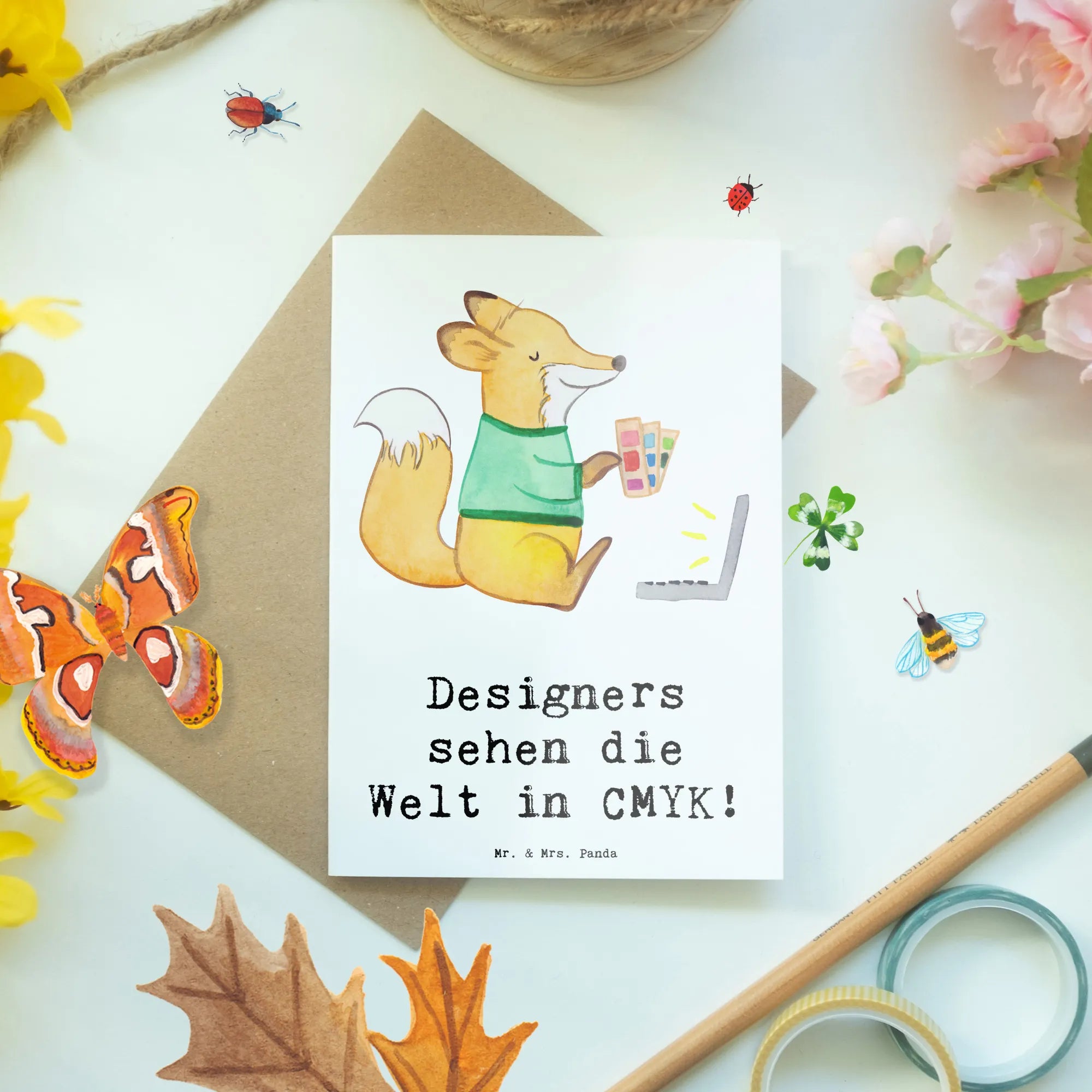 Die Grußkarte "Designer" von Mr. & Mrs. Panda ist das perfekte Geschenk für kreative Köpfe und Designer, die die Welt mit einem besonderen Blick wahrnehmen. Mit dem Slogan "Designers sehen die Welt in CMYK!" gewährt sie einen humorvollen Einblick in die Denkweise von Designern und ist ideal für alle Gelegenheiten, bei denen Du einem kreativen Menschen eine Freude bereiten möchtest. Sei es zum Geburtstag, zur Hochzeit oder einfach als nette Geste zwischendurch - diese Karte ist ein absoluter Hingucker!
