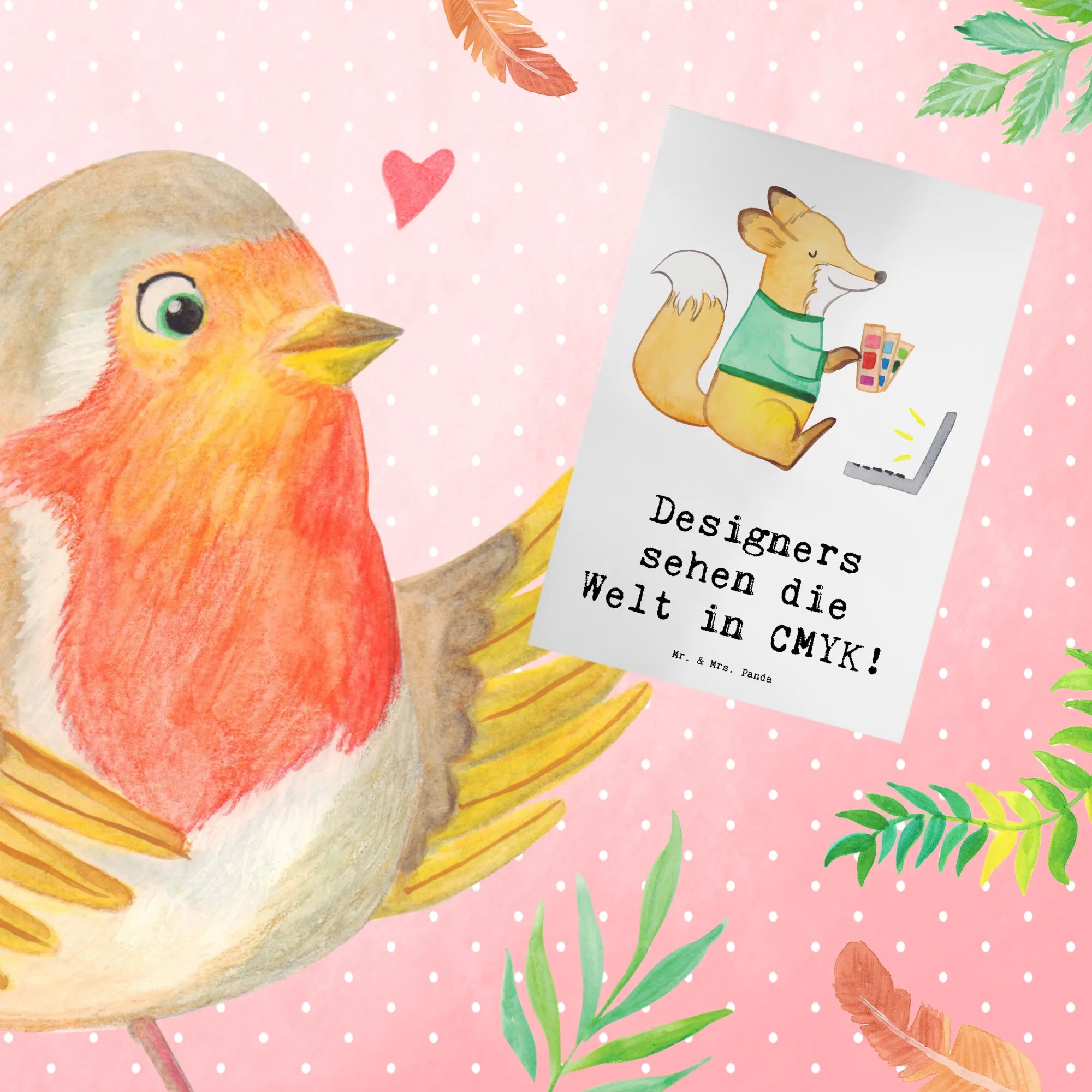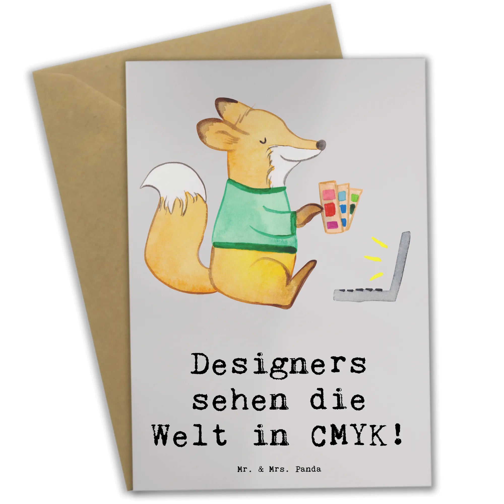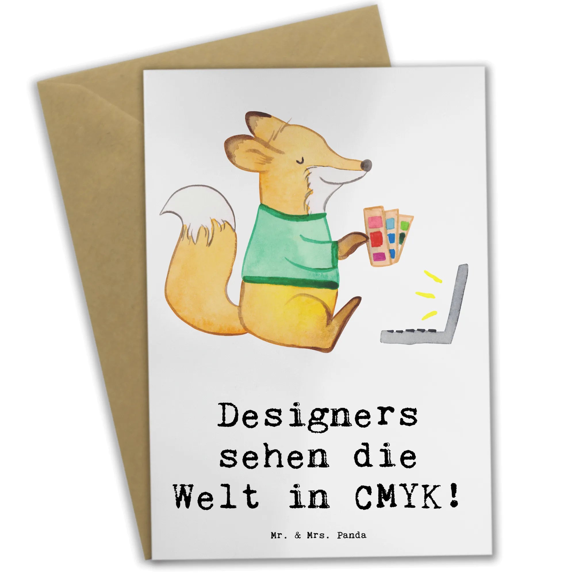 Die Grußkarte "Designer" von Mr. & Mrs. Panda ist das perfekte Geschenk für kreative Köpfe und Designer, die die Welt mit einem besonderen Blick wahrnehmen. Mit dem Slogan "Designers sehen die Welt in CMYK!" gewährt sie einen humorvollen Einblick in die Denkweise von Designern und ist ideal für alle Gelegenheiten, bei denen Du einem kreativen Menschen eine Freude bereiten möchtest. Sei es zum Geburtstag, zur Hochzeit oder einfach als nette Geste zwischendurch - diese Karte ist ein absoluter Hingucker!