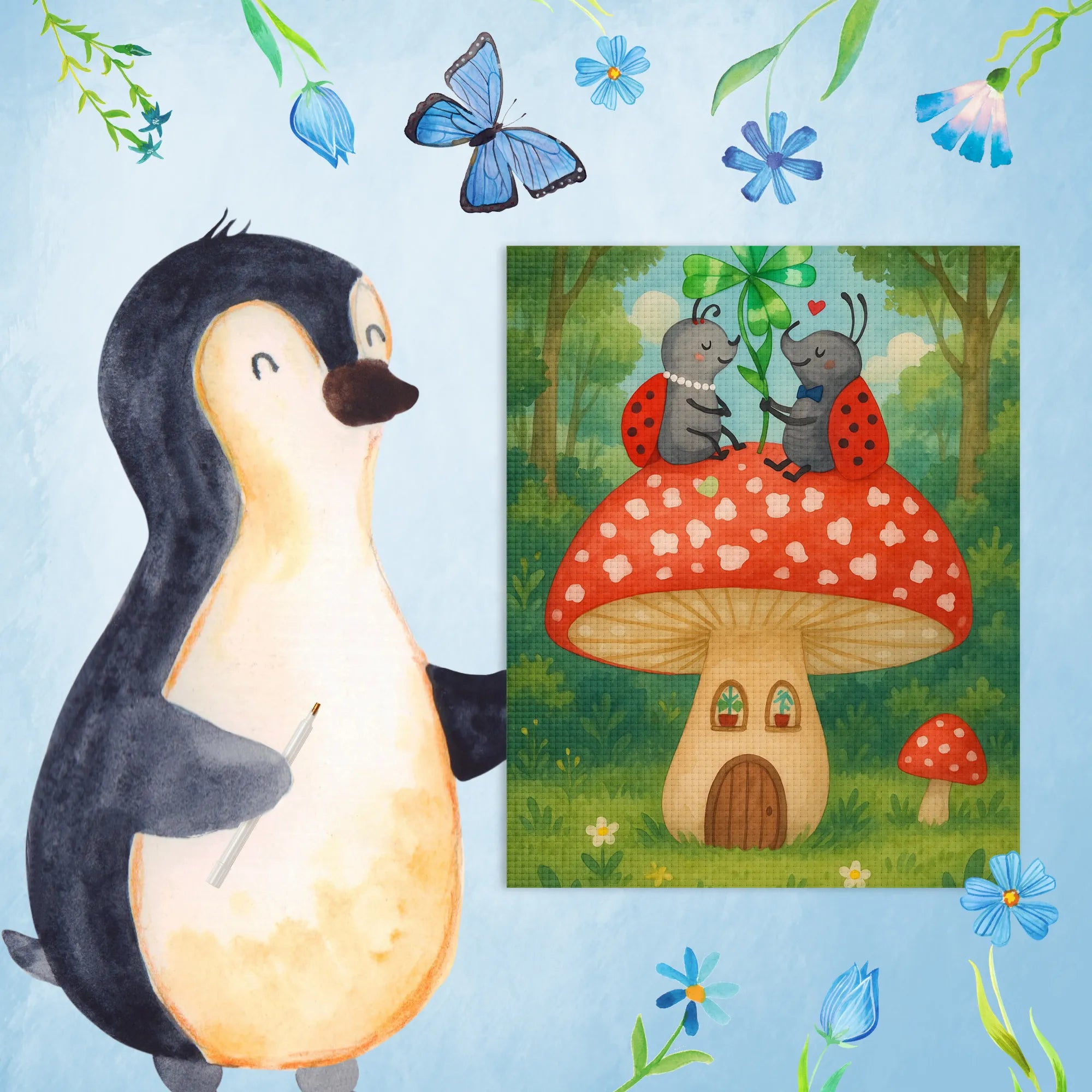 Hier sehen wir ein zauberhaftes Marienkäfer-Pärchen, das sich auf einem strahlend roten Fliegenpilz gegenüber sitzt. Mit jedem kleinen Lächeln, das sie austauschen, wird unser Herz ein Stückchen wärmer. Ihr Fleigenpilzhaus ist der Inbegriff von Gemütlichkeit und Zweisamkeit. In dieser traumhaften Kulisse, umgeben von der sanften Natur, erleben sie die kleinen Augenblicke des Glücks. Ihre so unterschiedlichen Muster tragen zur Schönheit der Szene bei und erinnern uns daran, dass Liebe in vielen Formen und Farben kommt. Wenn du also nach einem Motiv suchst, das Freude und Wärme ausstrahlt, ist dieses Marienkäfer-Paar genau das Richtige für dich. Es ist mehr als nur Kunst – es ist eine Einladung, die Liebe in deinem eigenen Zuhause zu feiern und jeden Tag zu genießen.