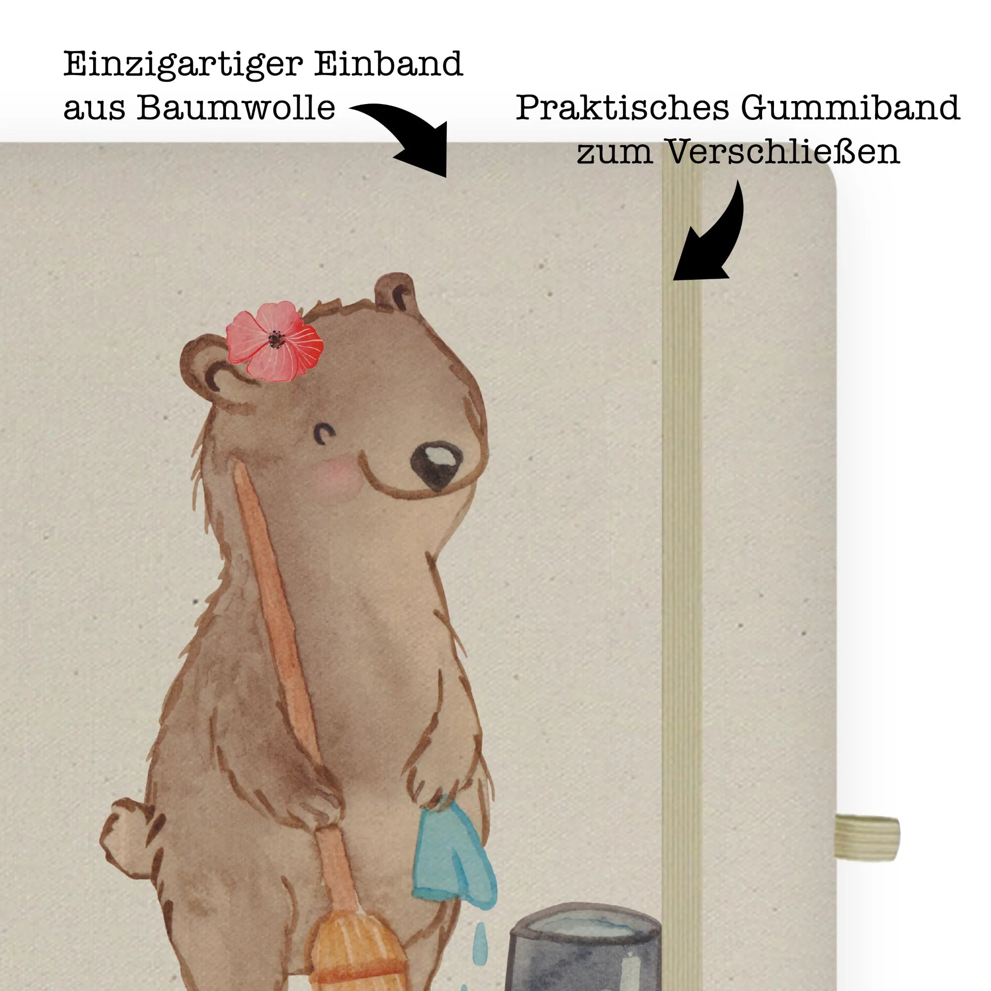 Mit Lesezeichen, Gummiband und Stifteschlaufe ist es außerdem ganz praktisch. Das Hardcover aus Baumwolle sorgt dafür, dass das Notizbuch beständig und langlebig ist, und der süße Bär, der den Boden wischt, verleiht ihm einen charmanten Blick.
