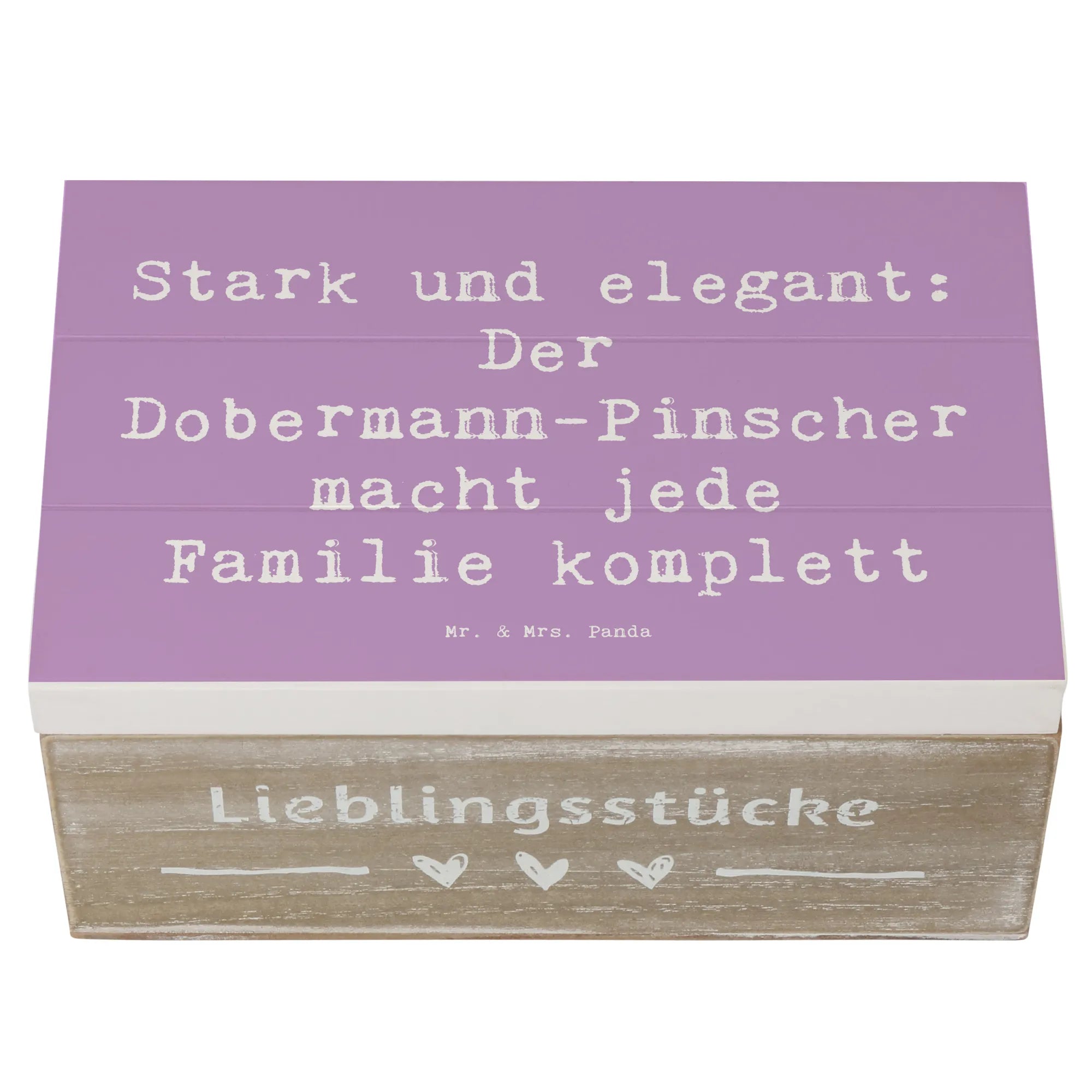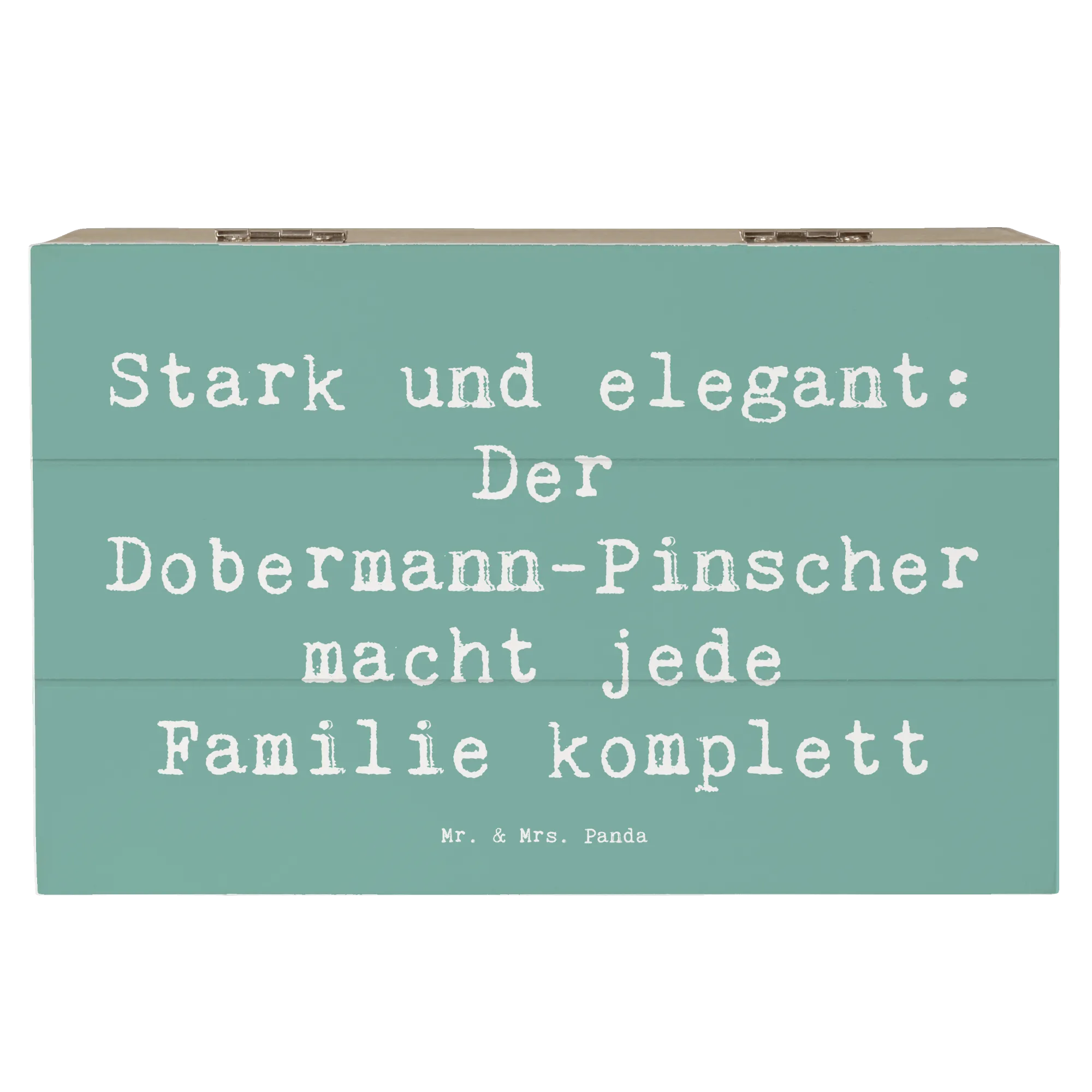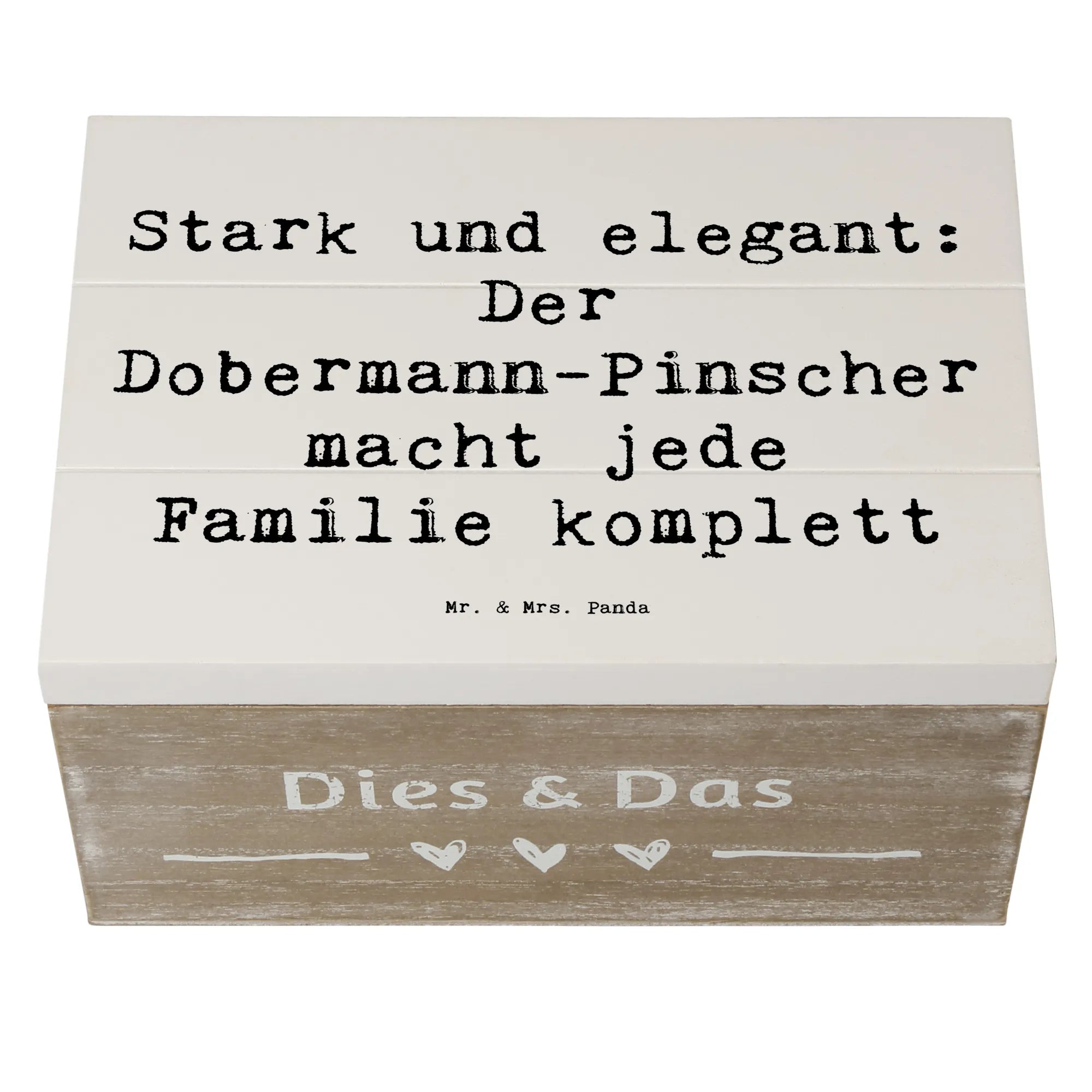 Diese besondere Holzkiste ist mit einem bezaubernden Motiv des Dobermann-Pinschers versehen und trägt den charmanten Spruch: Stark und elegant: Der Dobermann-Pinscher macht jede Familie komplett.