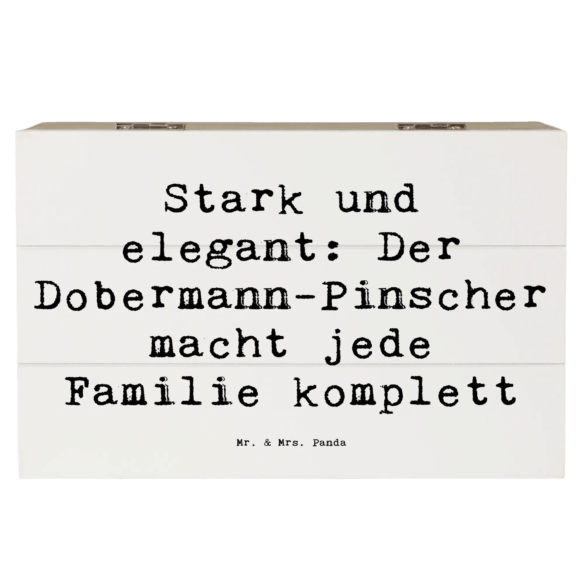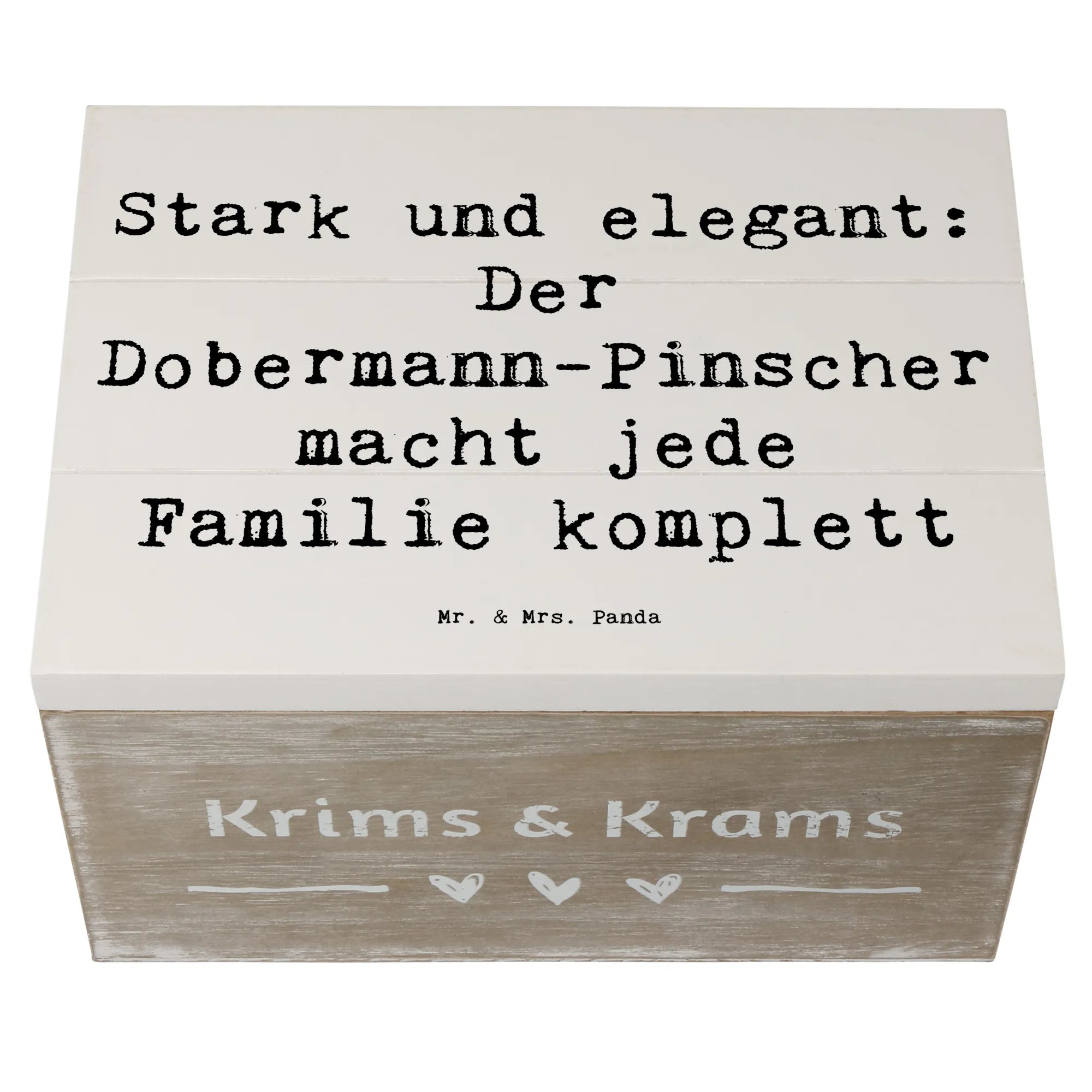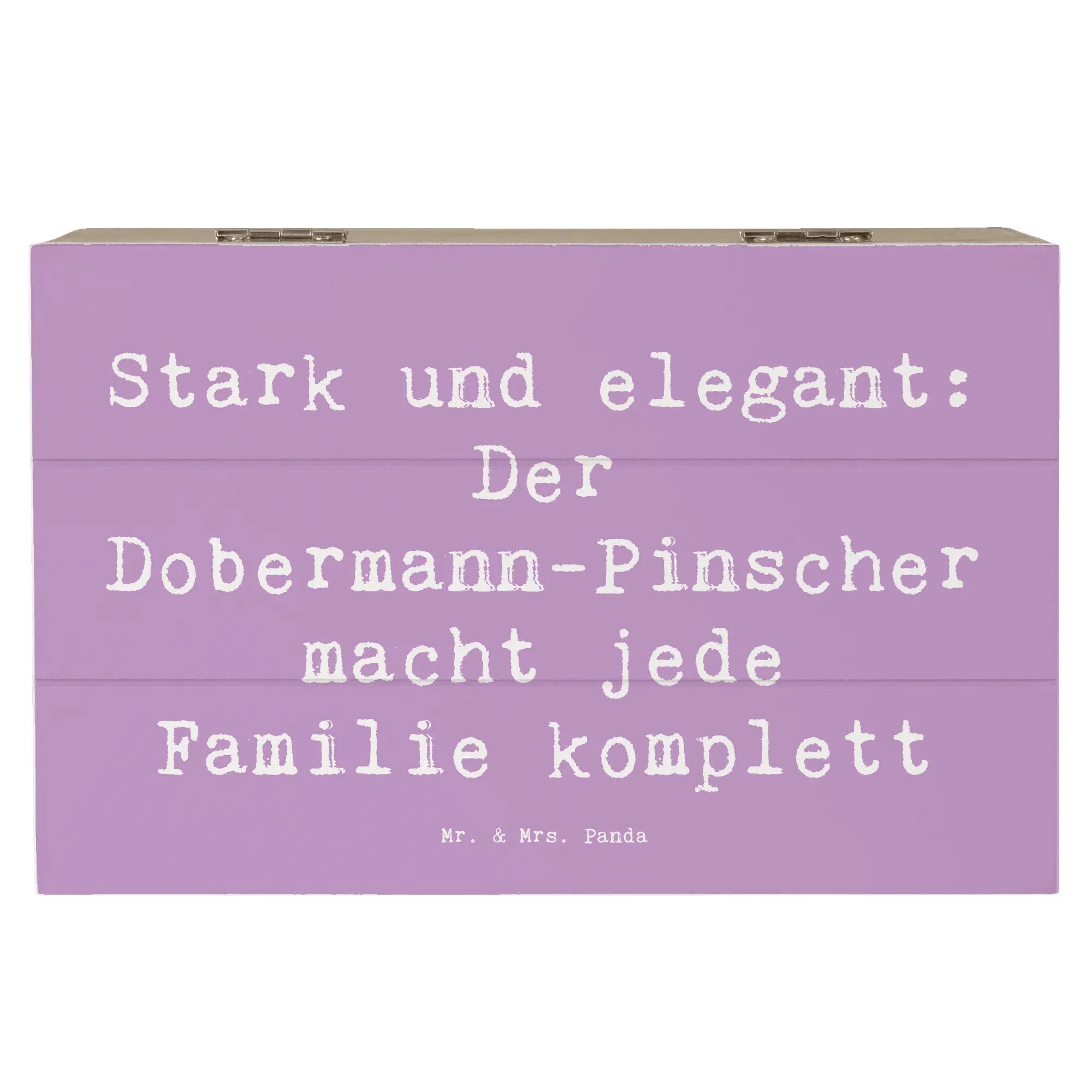 Diese besondere Holzkiste ist mit einem bezaubernden Motiv des Dobermann-Pinschers versehen und trägt den charmanten Spruch: Stark und elegant: Der Dobermann-Pinscher macht jede Familie komplett.
