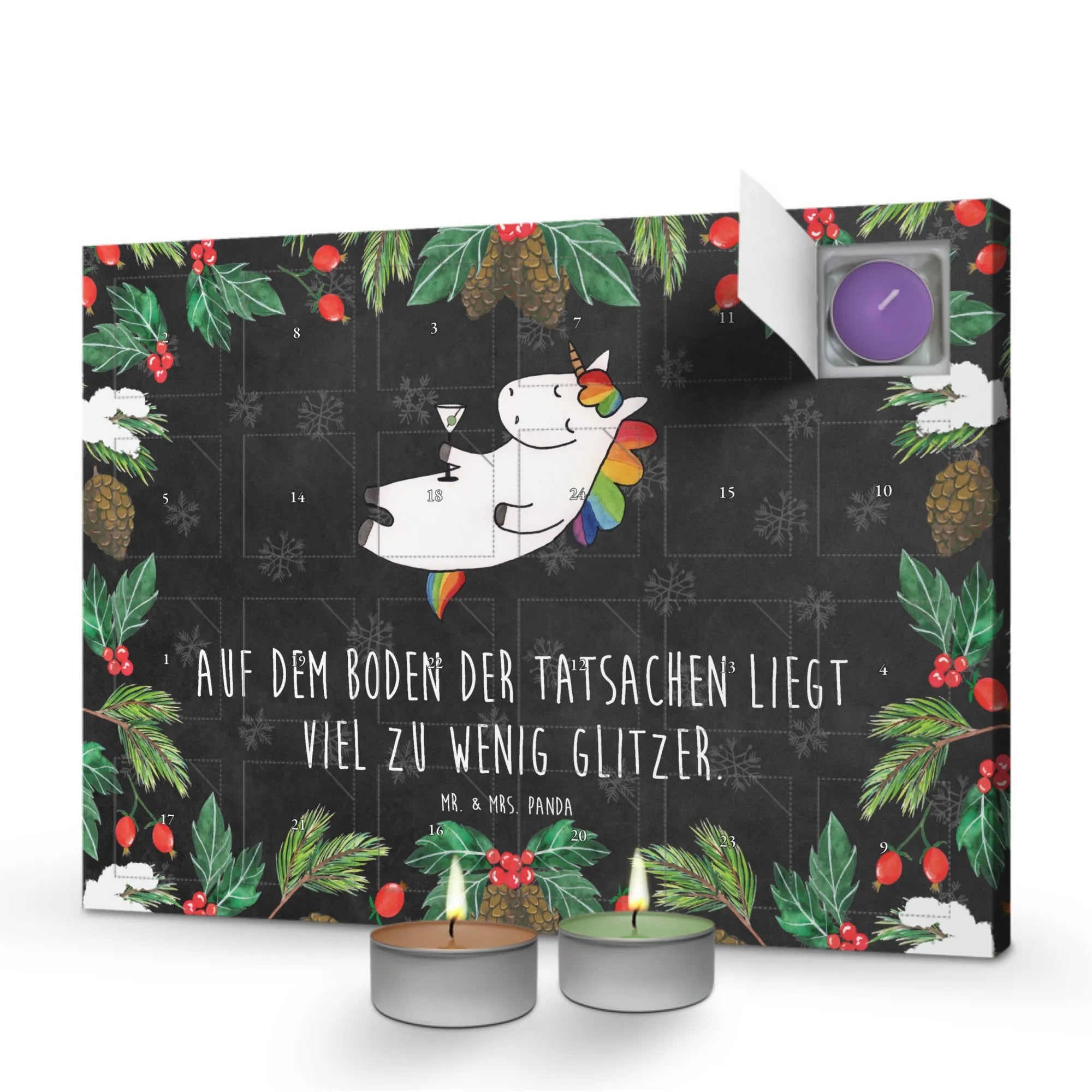 Überrasche die Einhornliebhaber in deinem Leben mit diesem einzigartigen Adventskalender. Er bringt nicht nur Freude, sondern auch eine derart liebenswerte Dekoration in jede Wohnung, dass du selbst beim schlimmsten Winterwetter die warme Glitzerwelt der Einhörner spüren kannst. Ideale für Feiern und Feste, für die Vorweihnachtszeit oder einfach, um jemandem eine Freude zu machen. Verschenke Glitzer, Spaß und Freude – verschenke den Duftkerzen Adventskalender "Einhorn Cocktail" von Mr. & Mrs. Panda!