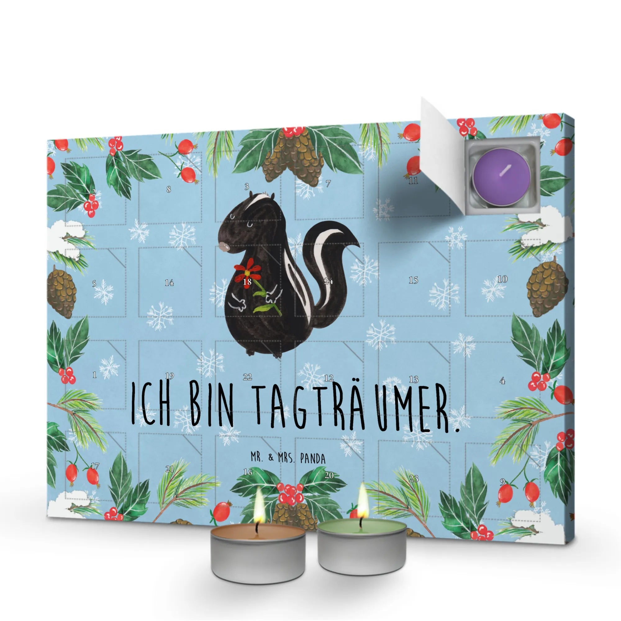 Der Duftkerzen Adventskalender Stinktier Blume aus der Stinktier-Kollektion von Mr. & Mrs. Panda ist ein wahres Highlight für die Adventszeit. Er bringt nicht nur festliche Stimmung in Dein Zuhause, sondern entfaltet auch einzigartige Düfte, die jeden Tag ein bisschen magischer machen.