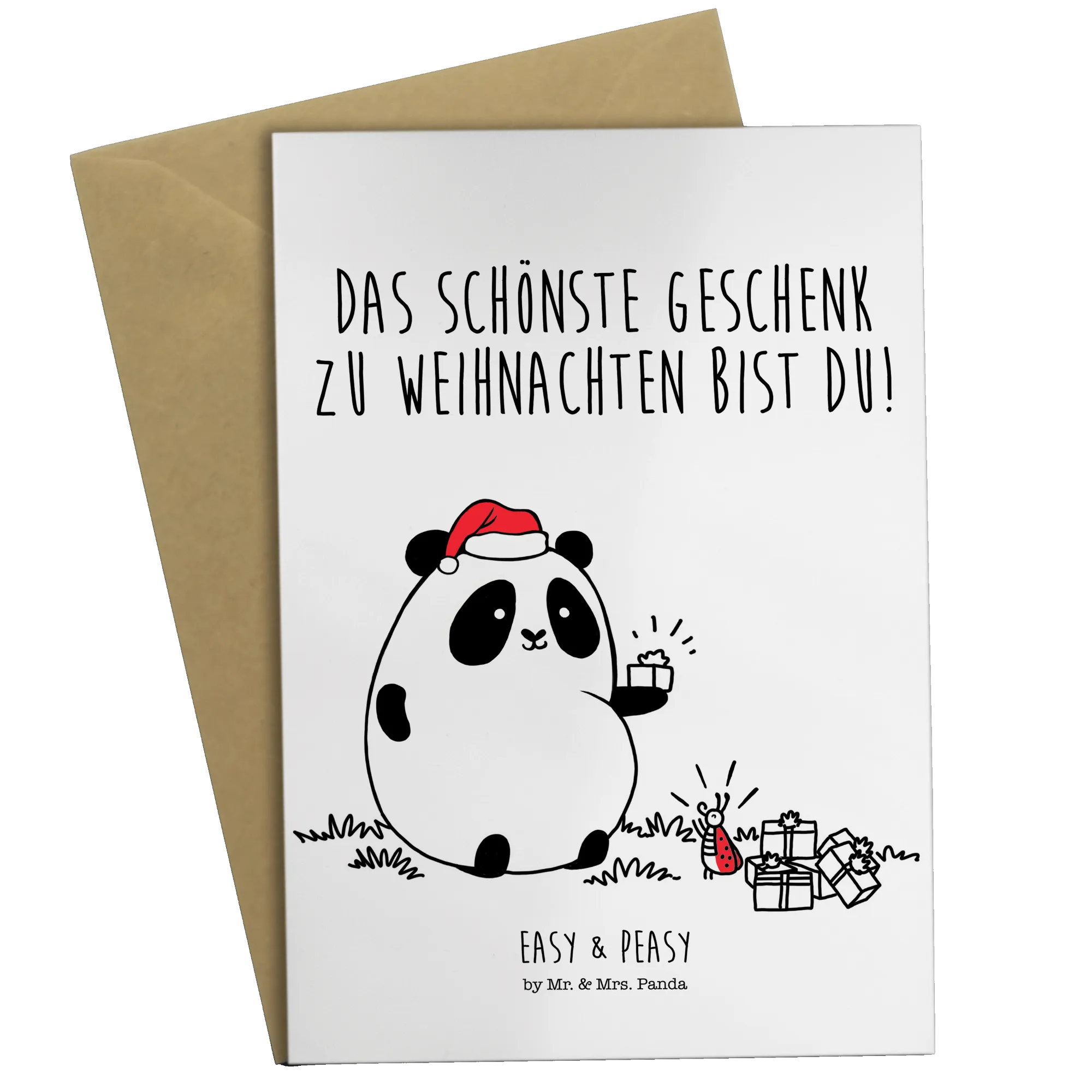 Die Grußkarte 'Easy & Peasy Weihnachtsgeschenk' von Mr. & Mrs. Panda ist das perfekte Geschenk für die Weihnachtszeit! 🎄 Egal ob für Freunde, Familie oder Kollegen, diese Grüße zaubern jedem ein Lächeln ins Gesicht. Mit dem süßen Motiv eines zufriedenen Pandas, der ein Geschenk von seinem besten Freund, dem Marienkäfer, entgegennimmt, wirst Du Herzen erfreuen.