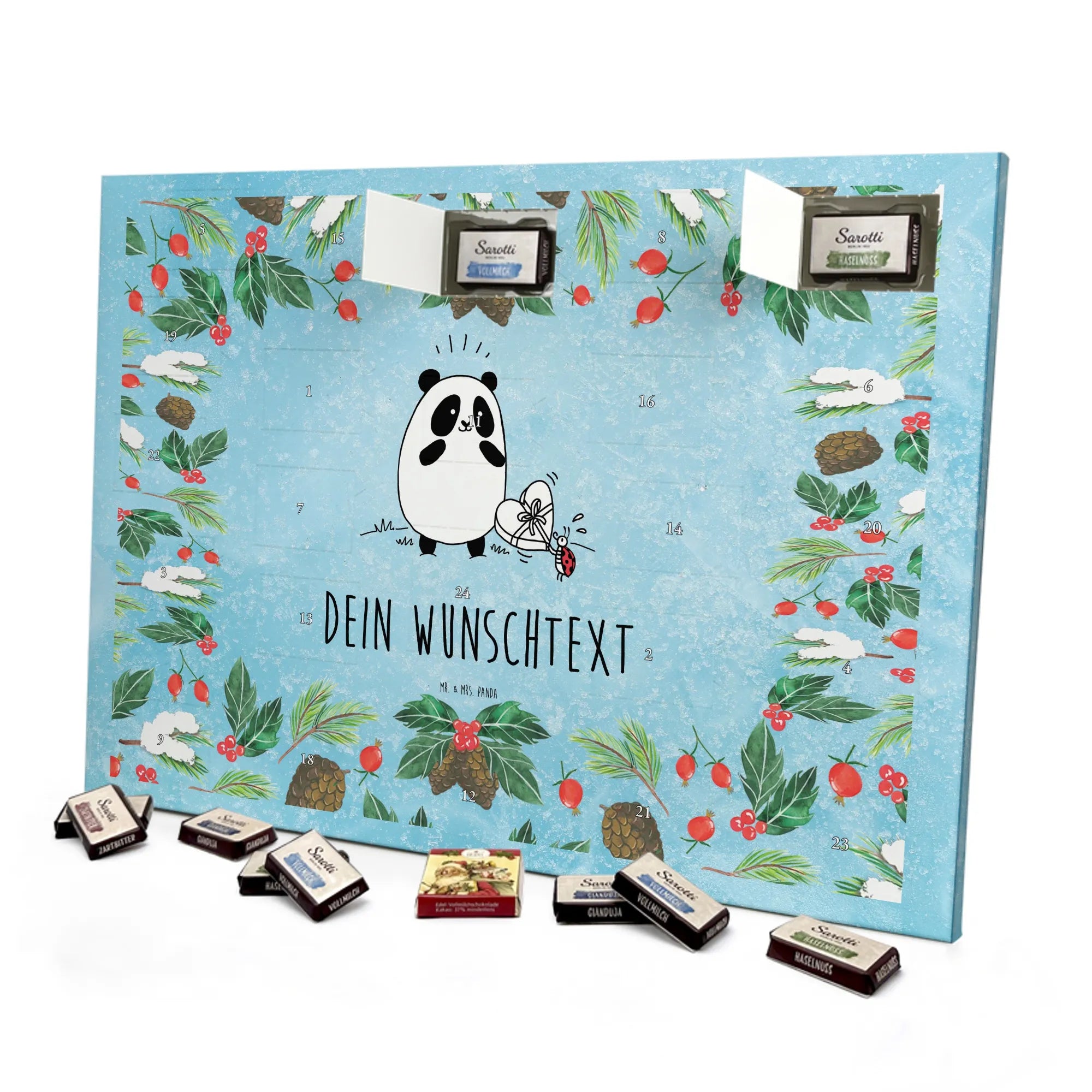🐼 PERSONALISIERTER SCHOKO-ADVENTSKALENDER: Mit Wunschtext, bedruckt mit Mr. & Mrs. Panda Motiven, gefüllt mit MARKENNAMEN Schokolade.