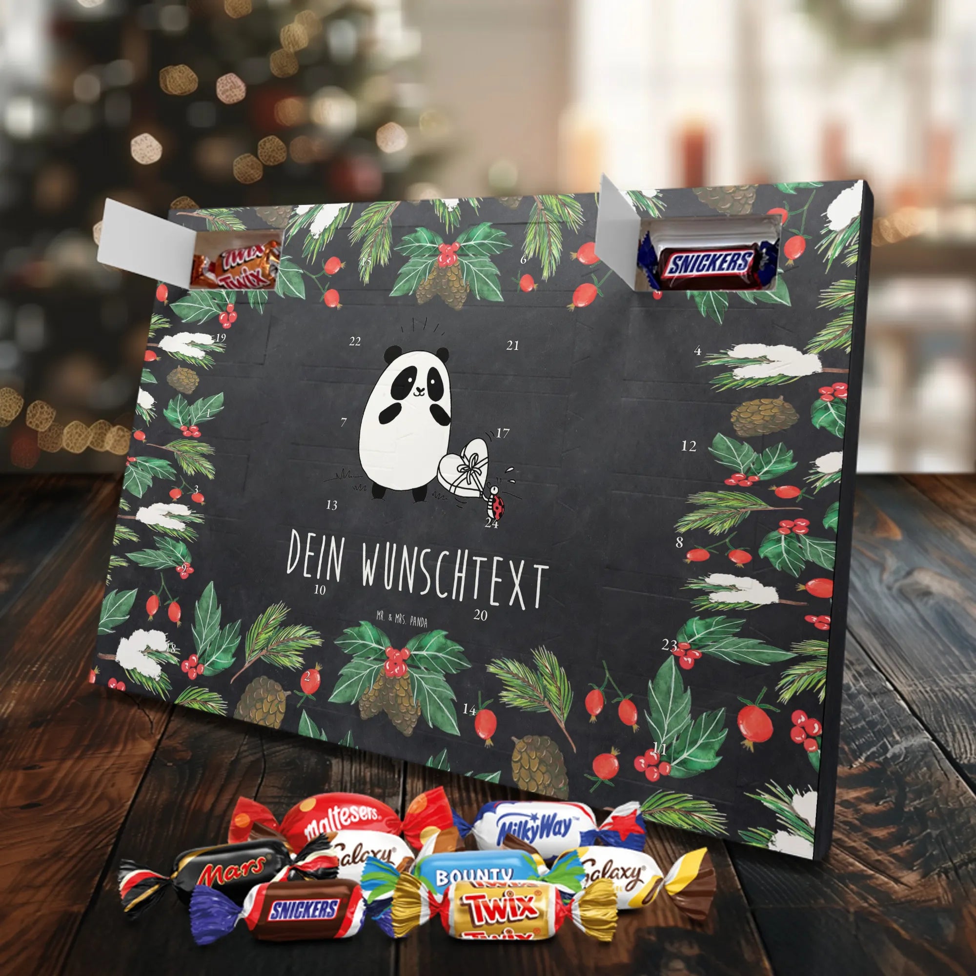 🐼 Personalisierter Adventskalender mit Wunschtext, seidenmatte Oberfläche, bedruckte Seitenflächen.