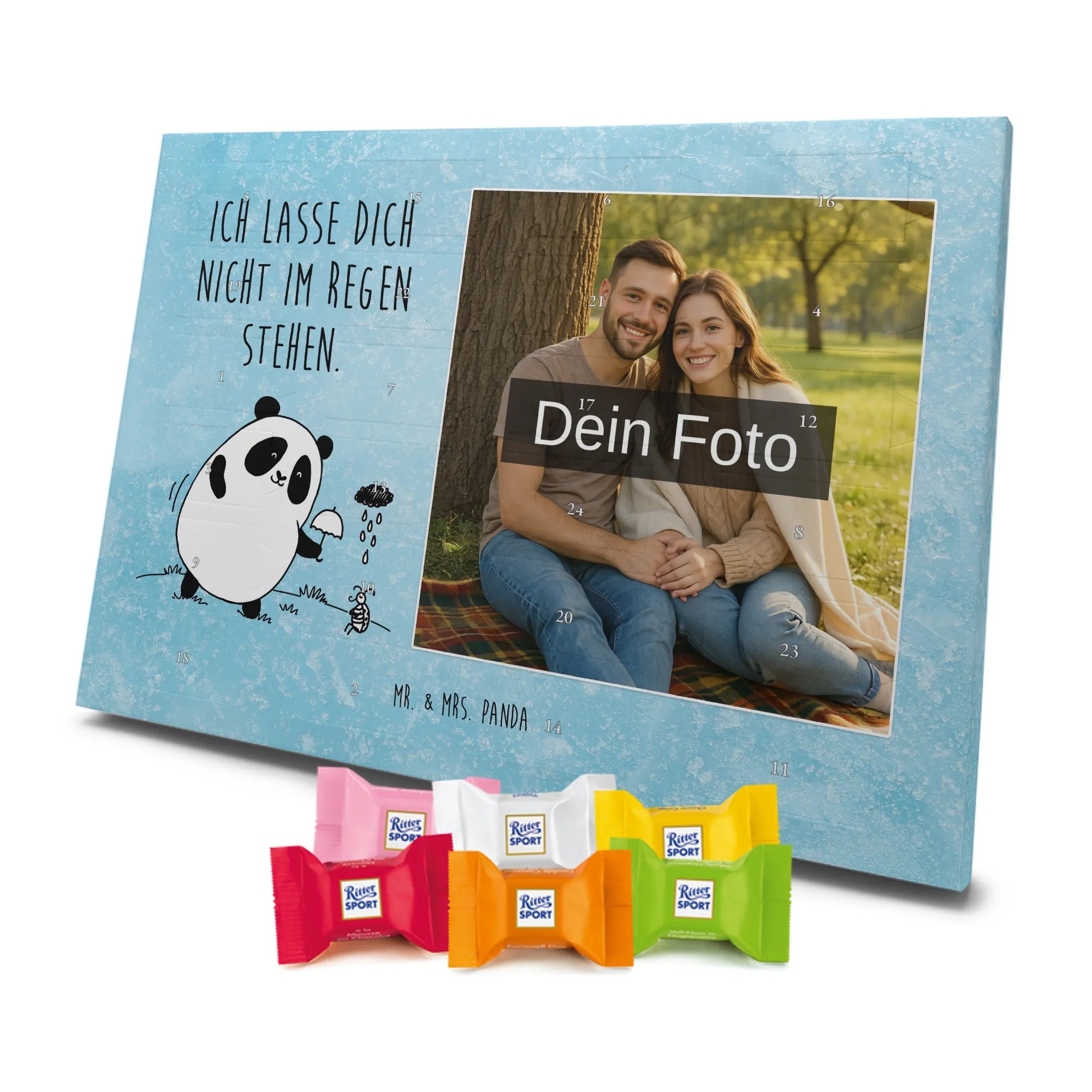 🐼 Personalisierter Schoko-Foto-Adventskalender mit deinem Bild, Mr. & Mrs. Panda Motiven und gefüllt mit kinder® Schokolade.