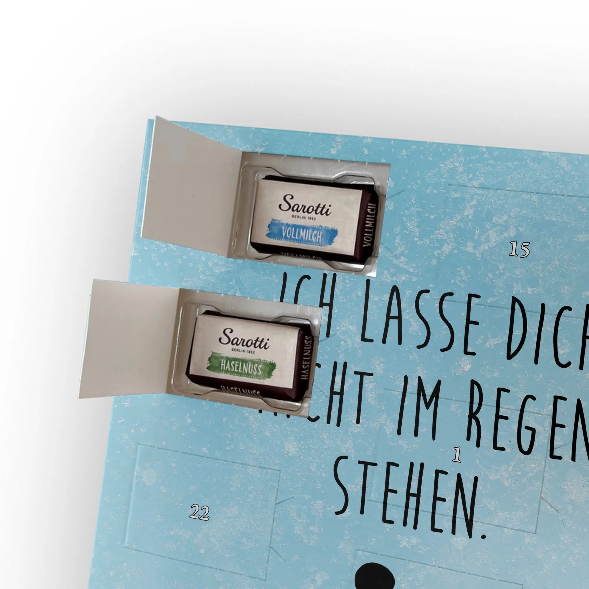 🐼 LECKERE FÜLLUNG: 24 Täfelchen, 107 g Markenschokolade (Sarotti® & Confiserie Heidel®) in vier Sorten.