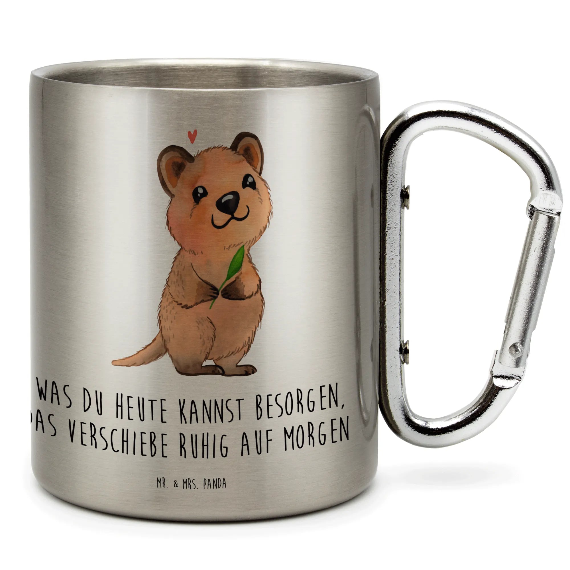 Besonders praktisch ist der integrierte Karabinerhaken, mit dem Du ihn an Deiner Gürtelschlaufe oder Deinem Rucksack befestigen kannst. So hast Du ihn immer griffbereit! Ob als Geschenk für einen Freund, der die Natur liebt, oder für Dich selbst – der Edelstahlbecher "Quokka Happy" ist ein Must-Have für alle, die Abenteuer mögen und gleichzeitig ein Augezeichen für gute Laune setzen möchten.