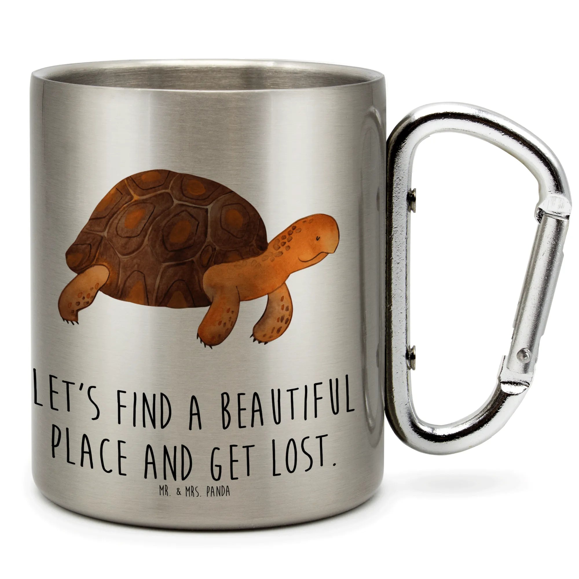 Du bist auf der Suche nach dem perfekten Geschenk für einen Outdoor-Fan, der das Abenteuer liebt und gern neue Orte erkundet? Dann ist der Edelstahlbecher "Schildkröte marschiert" von Mr. & Mrs. Panda genau das richtige! Dieser wunderschöne und robuste Edelstahlbecher beeindruckt mit seinem einzigartigen Motiv einer Schildkröte, die entspannt durch das Leben marschiert. Mit dem Slogan "Let's find a beautiful place and get lost." inspiriert er dazu, die Welt zu erkunden und neue Abenteuer zu erleben. Ideal für Campingausflüge, Wanderungen oder sogar für den gemütlichen Abend auf der Terrasse.