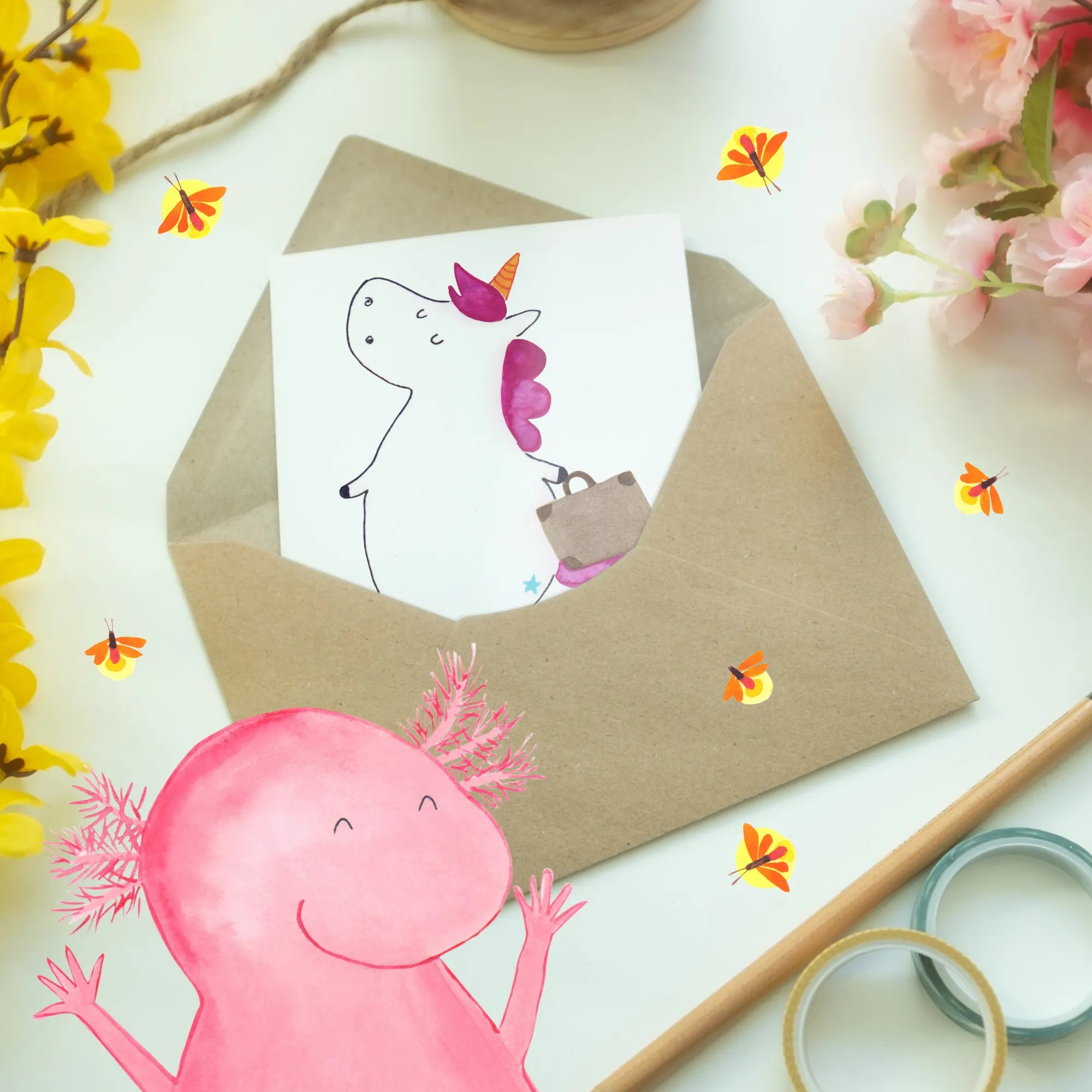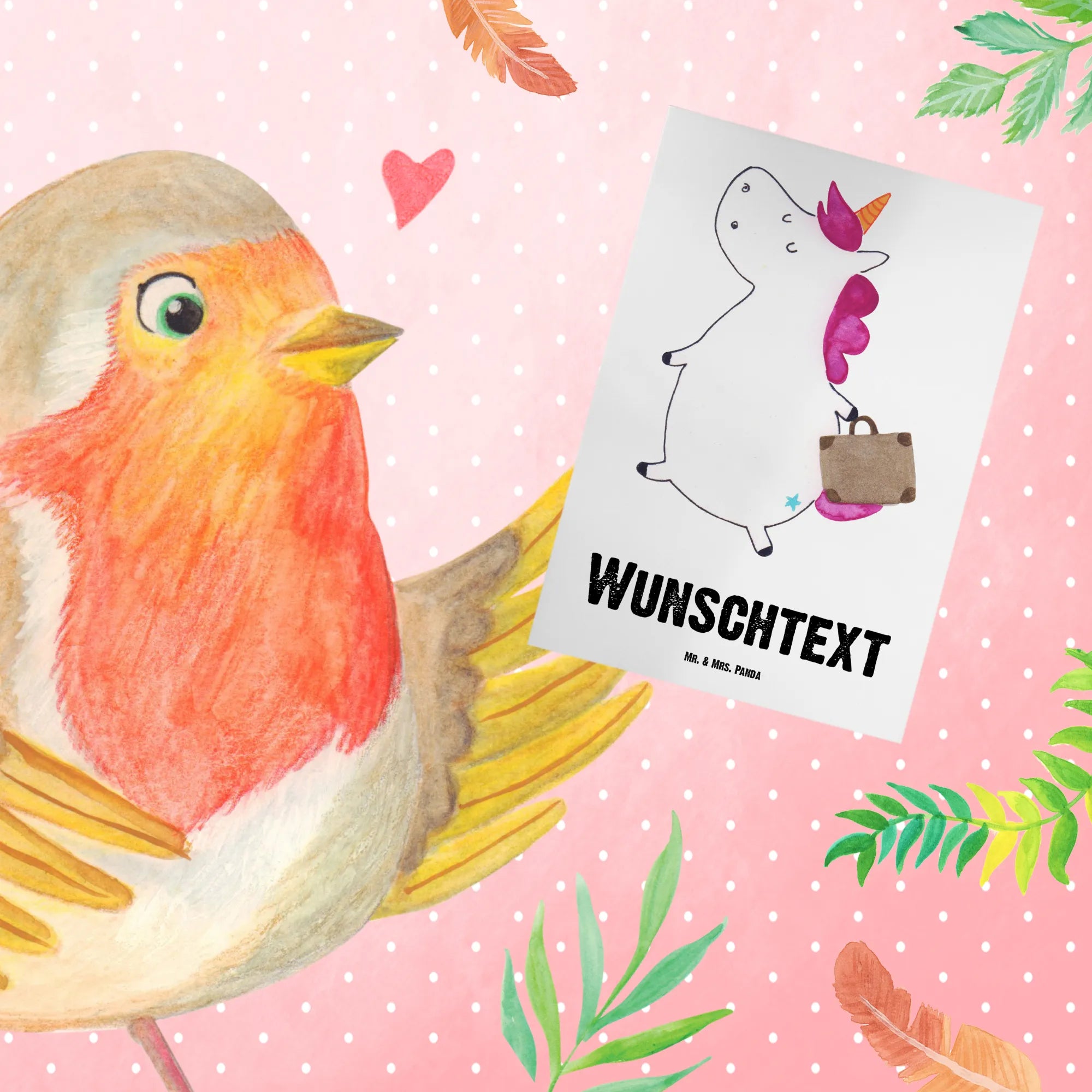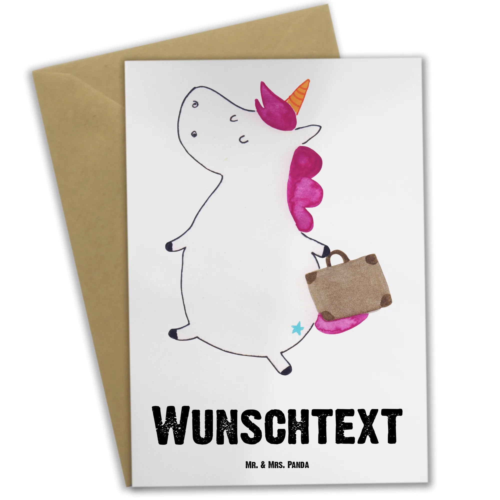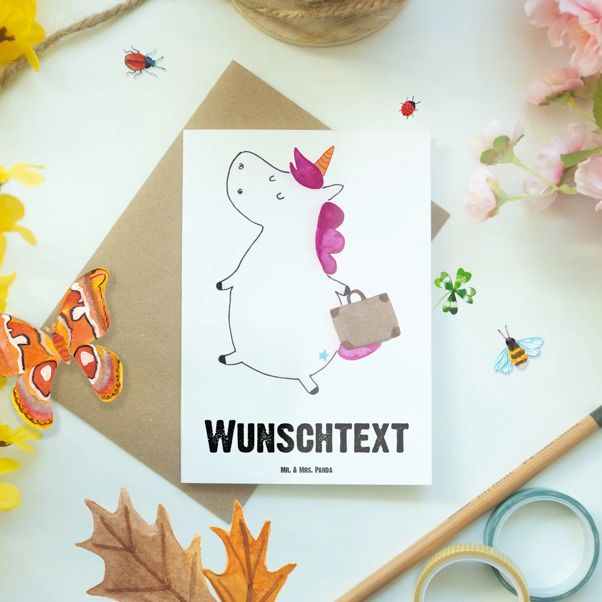 Die personalisierte Grußkarte mit dem zauberhaften Motiv "Einhorn Koffer" von Mr. & Mrs. Panda ist die perfekte Geschenkidee für all jene, die das Innere eines Kindes bewahren möchten. Diese wunderschöne Grußkarte bietet dir die Möglichkeit, deinen individuellen Wunschnamen oder -text auf der Vorderseite zu verewigen. Sie misst 148 mm x 105 mm und ist aus hochwertigem 300 Gramm Karton gefertigt, was ihr einen edlen und einzigartigen Look verleiht.