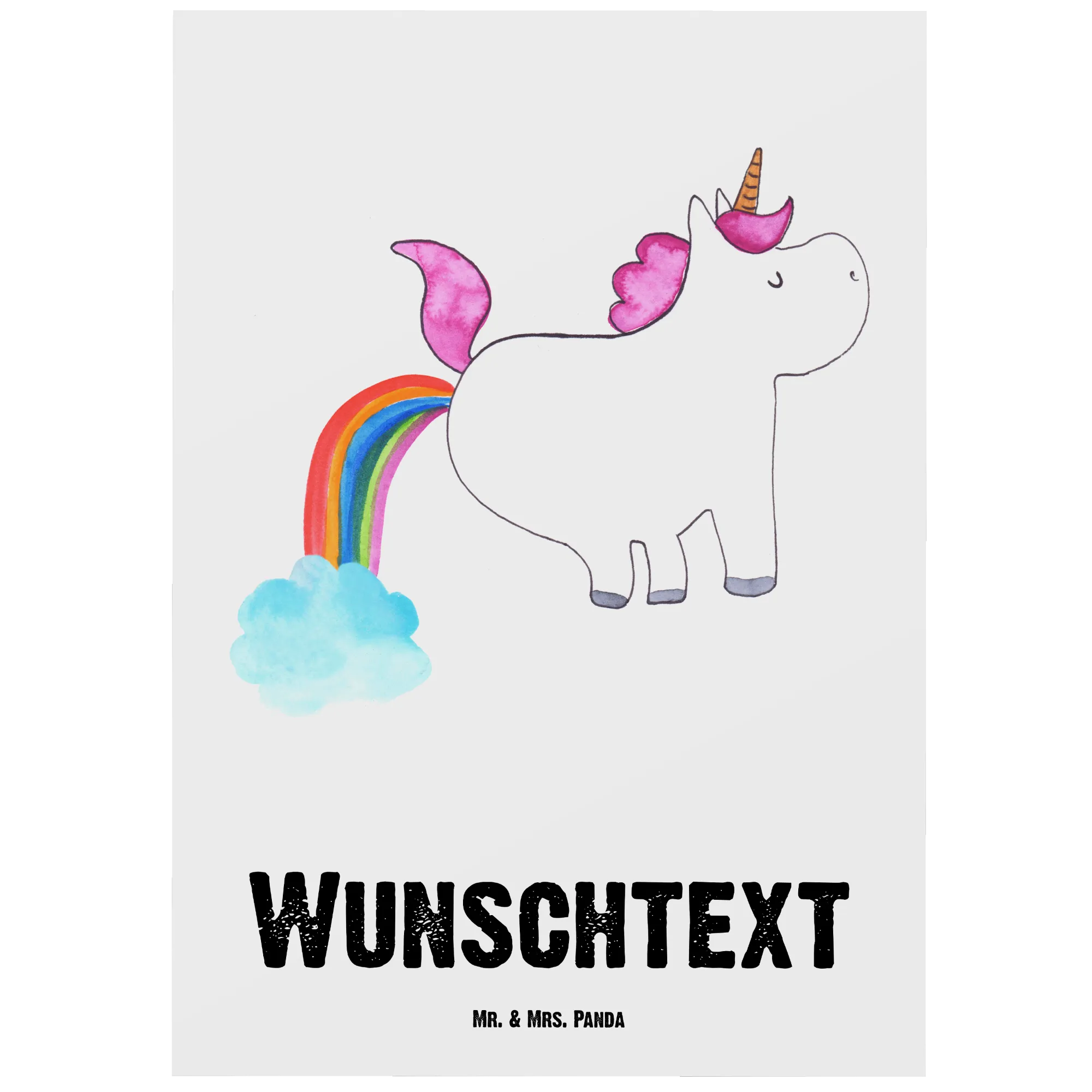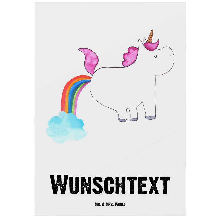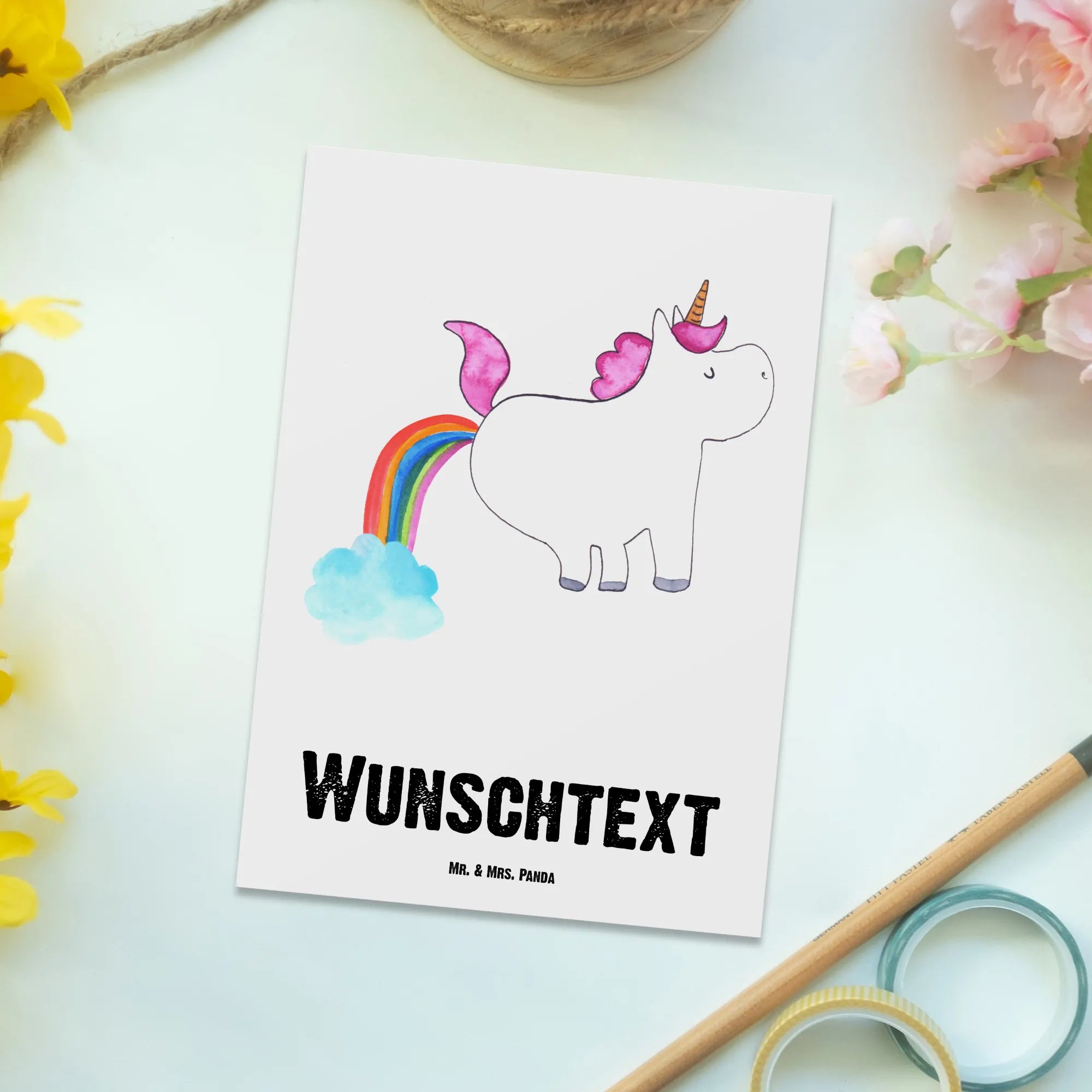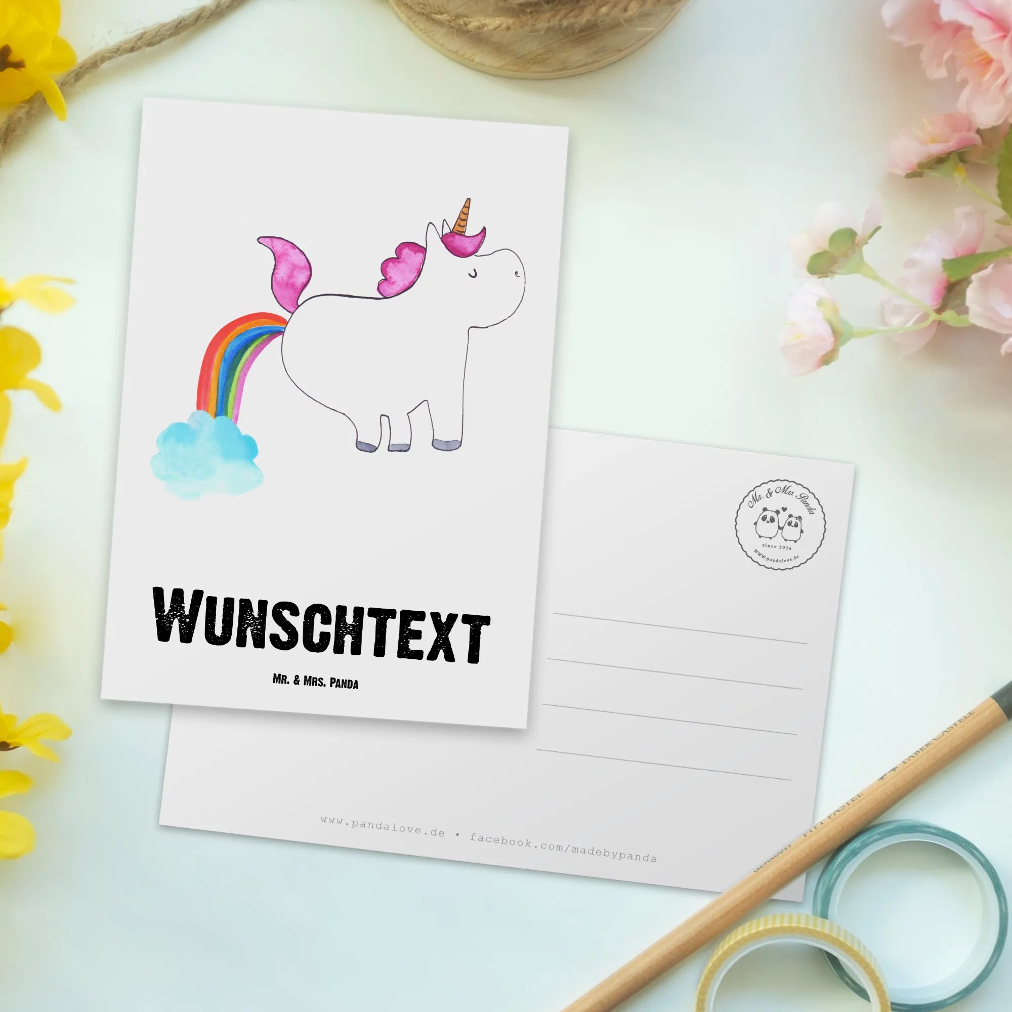 Diese einzigartige Postkarte ist personalisierbar mit deinem Wunschnamen oder Wunschtext – so wird sie zu einem ganz individuellen Geschenk, das von Herzen kommt. Sie ist nicht nur schön, sondern auch langlebig und wird aus hochwertigem Karton in 300 Gramm Qualität gefertigt. Die hochglänzend veredelte Vorderseite sorgt dafür, dass das süße Einhorn, das fröhlich durch einen Regenbogen pupsend saust, besonders gut zur Geltung kommt.