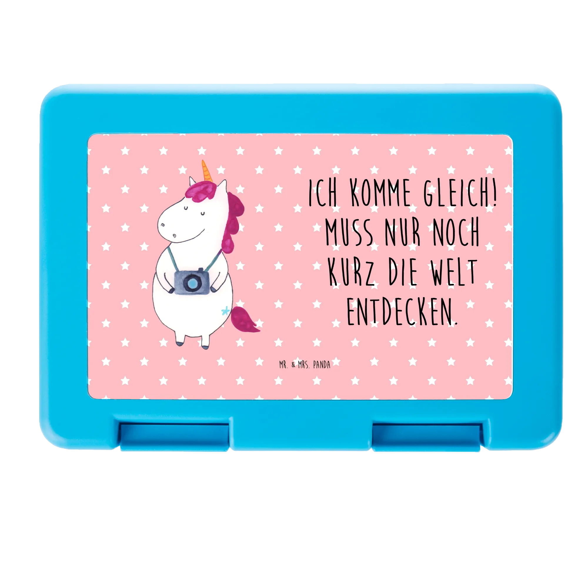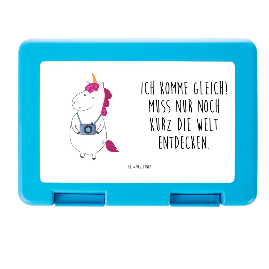 Entdecke die zauberhafte Brotbox Einhorn Fotograf von Mr. & Mrs. Panda – das perfekte Geschenk für alle Weltenbummler und Einhorn-Liebhaber! Diese wunderschöne Brotdose ist mit einem süßen Einhorn-Motiv bedruckt, das kamerawütig durch die Welt reist. Mit ihrem charmanten Design und dem Slogan 'Ich komme gleich! Muss nur noch kurz die Welt entdecken.' bringt sie ein Lächeln in jede Schul- oder Arbeitspause.