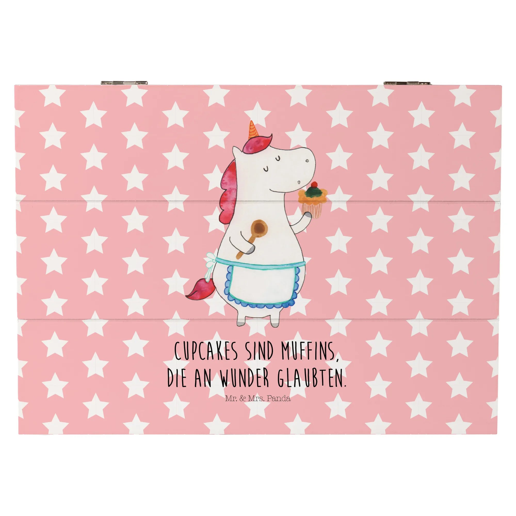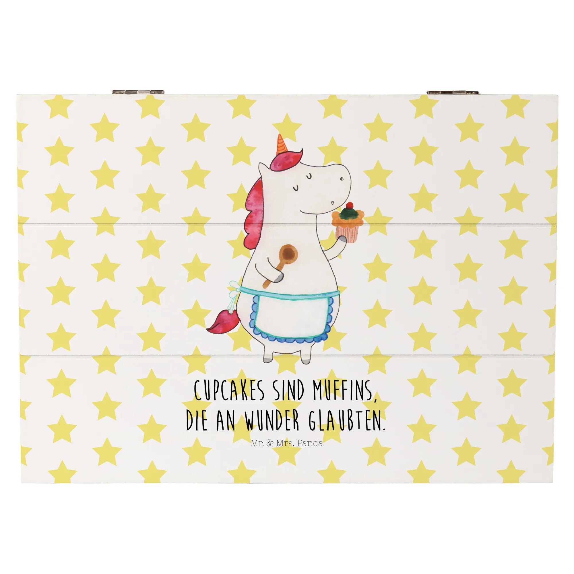 Die wunderschöne Holzkiste "Einhorn Küchenfee" von Mr. & Mrs. Panda ist der perfekte Begleiter für all deine wertvollen Erinnerungen. Mit ihrem charmanten Einhorn-Motiv und dem liebevollen Spruch "Cupcakes sind Muffins, die an Wunder glaubten" bezaubert sie kleine und große Einhorn-Fans gleichermaßen.