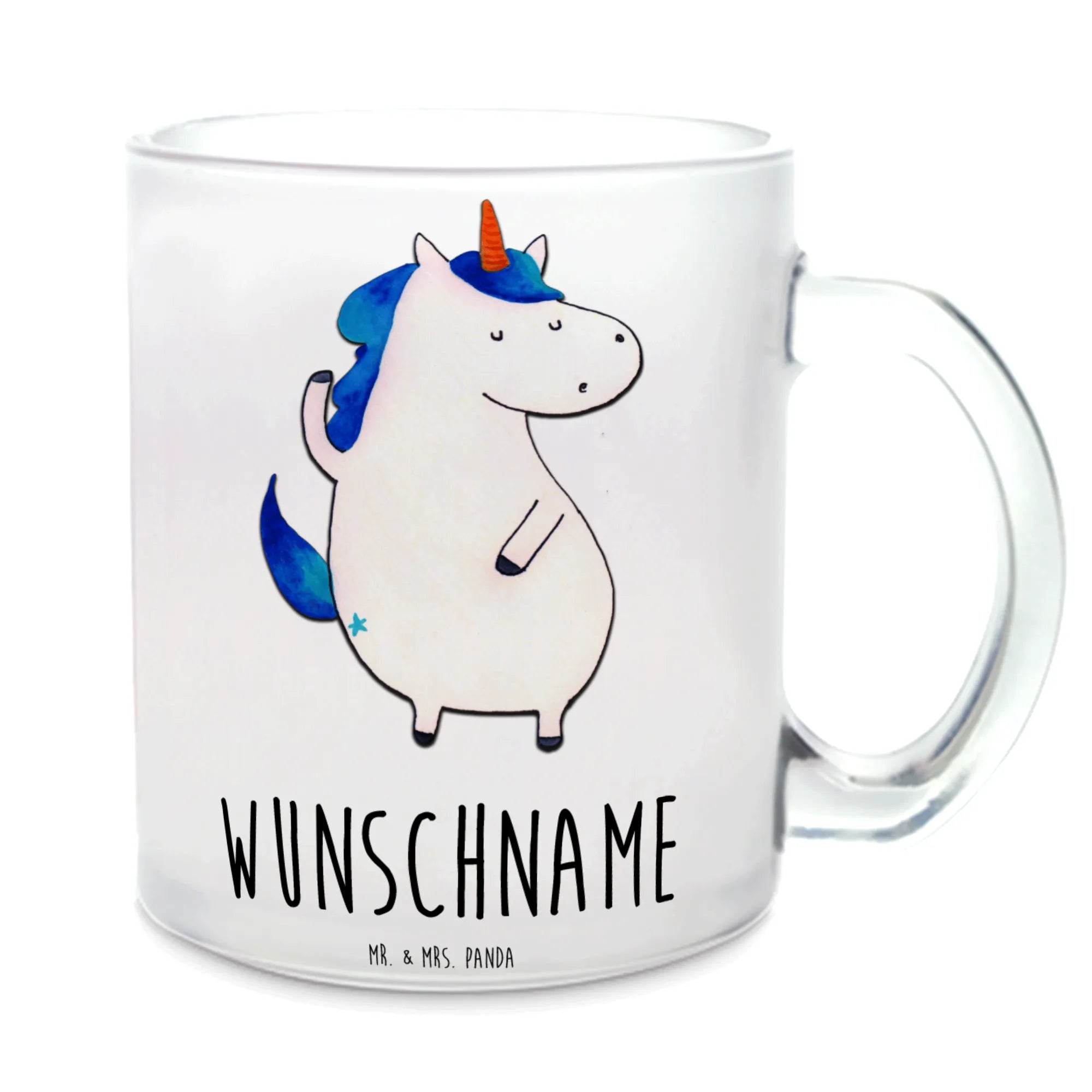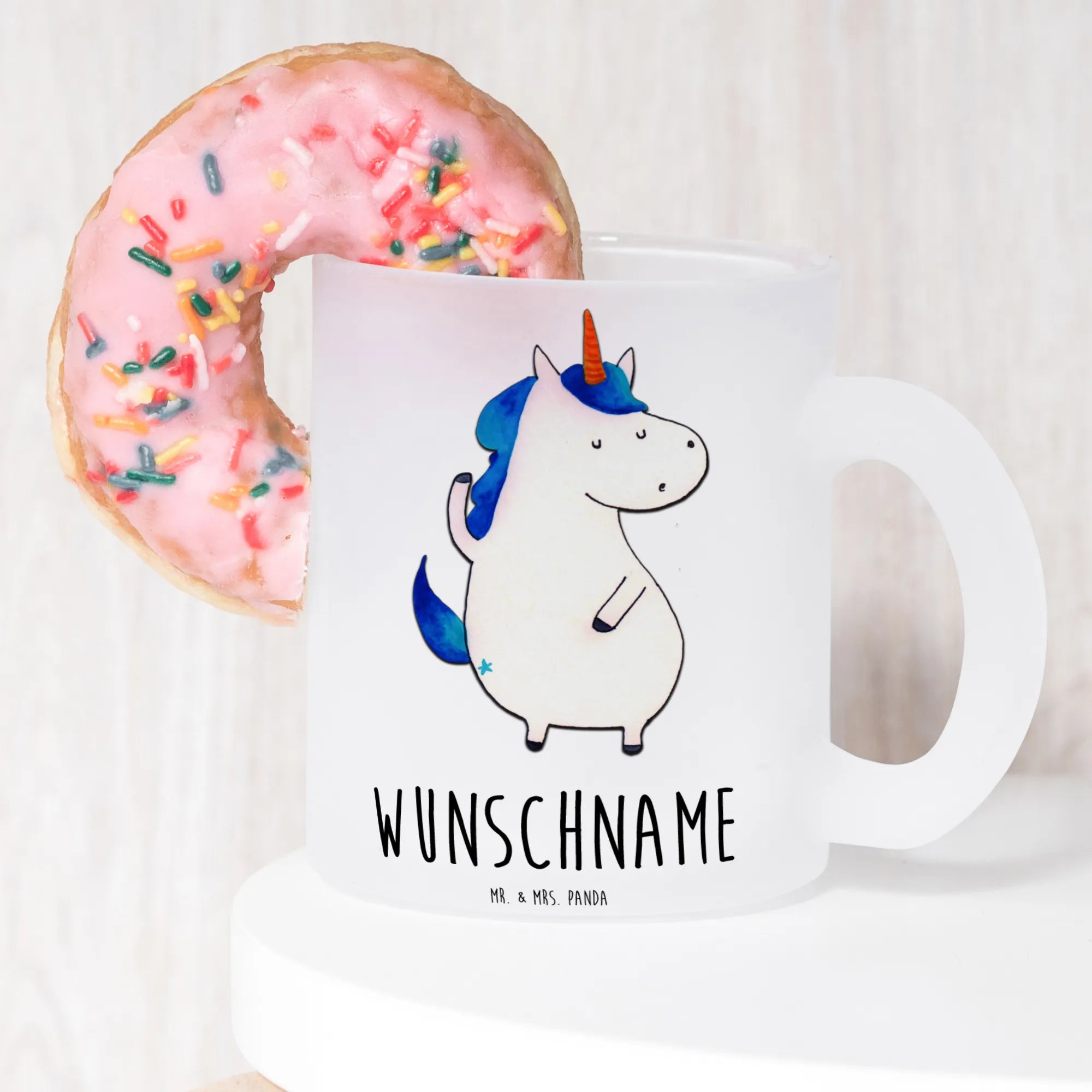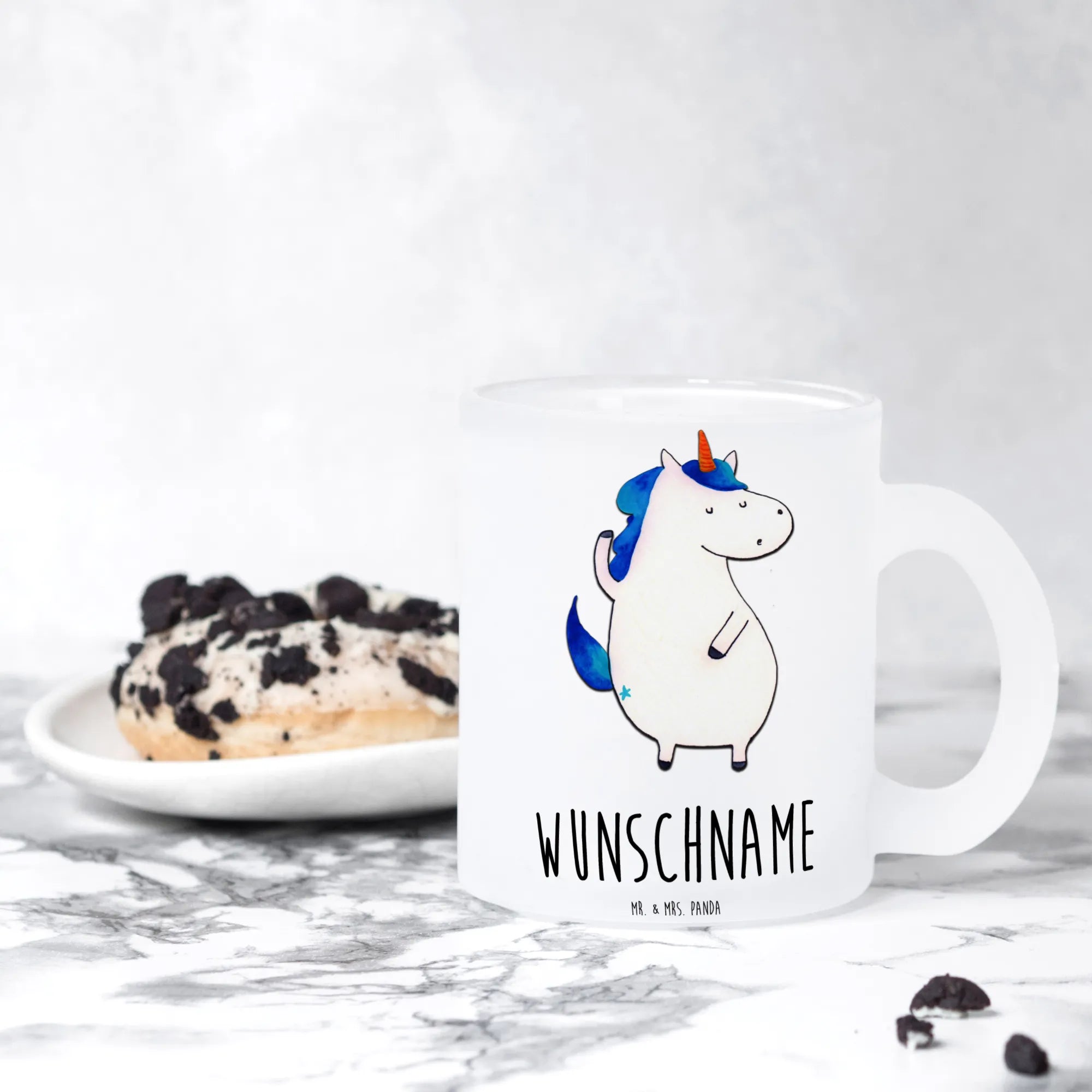 Die personalisierte Teetasse mit dem coolen Einhorn-Motiv von Mr. & Mrs. Panda ist der perfekte Begleiter für alle Teeliebhaber und eignet sich ideal als Geschenk für Freunde, Familie oder auch dich selbst. Die edle, matte Oberfläche und das robuste, extra starke Glas dieser Teetasse lassen sie nicht nur gut aussehen, sondern machen sie auch besonders langlebig. Mit einem Durchmesser von 80 mm und einer Höhe von 95 mm bietet sie ausreichend Platz für deine Lieblings-Heißgetränke, egal ob Tee, Glühwein oder Kaffee.
