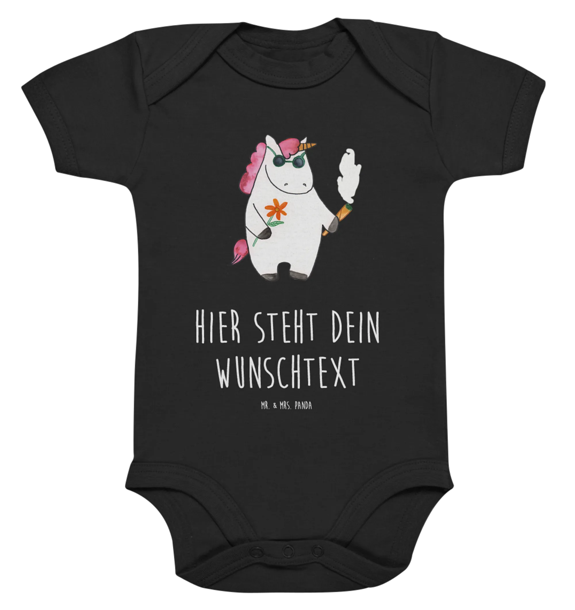 Der personalisierte Baby Body Einhorn Woodstock aus der zauberhaften Einhorn-Kollektion von Mr. & Mrs. Panda ist das perfekte Geschenk für kleine Einhorn-Liebhaber! Dieser süße Strampler, gestaltet mit einem coolen Einhorn, das eine Sonnenbrille trägt und einen Joint in der Hand hält, ist nicht nur ein echter Hingucker, sondern auch super bequem für jedes Baby.