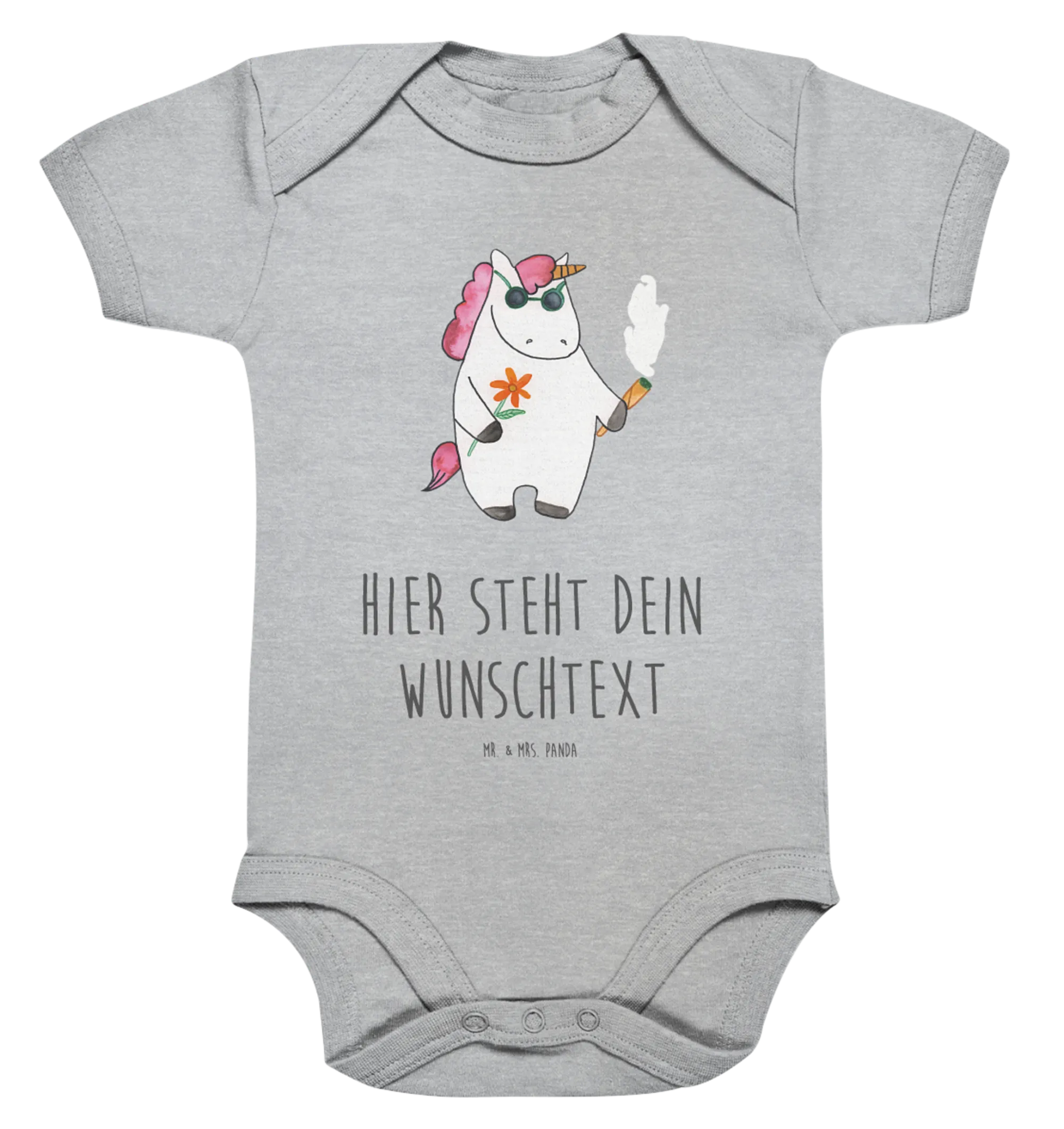 Der personalisierte Baby Body Einhorn Woodstock von Mr. & Mrs. Panda ist das perfekte Geschenk für kleine Einhorn-Fans und deren Eltern! Mit seinem zauberhaft handgezeichneten Motiv eines fröhlichen Einhorns, das mit einer Sonnenbrille und einem Joint in der Hand die entspannte Woodstock-Atmosphäre versprüht, bringt er eine Portion Humor und Freude. Egal ob zur Geburt, zur Taufe oder einfach nur als liebevolle Überraschung, dieser Body ist genau das Richtige.